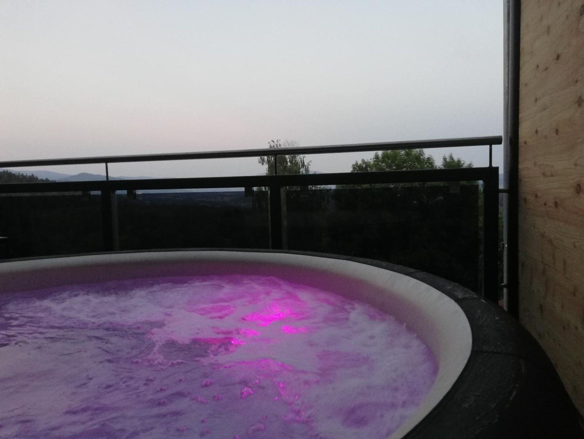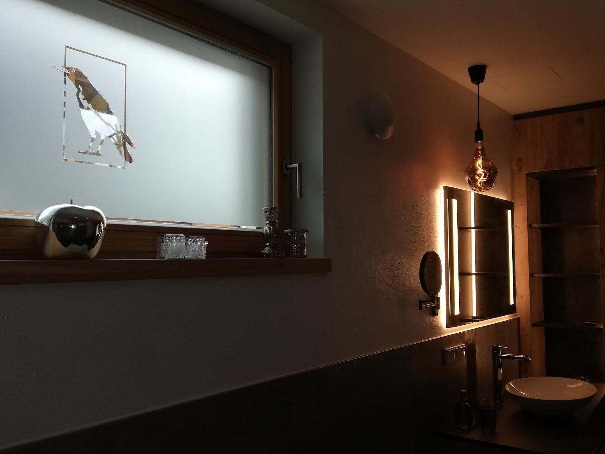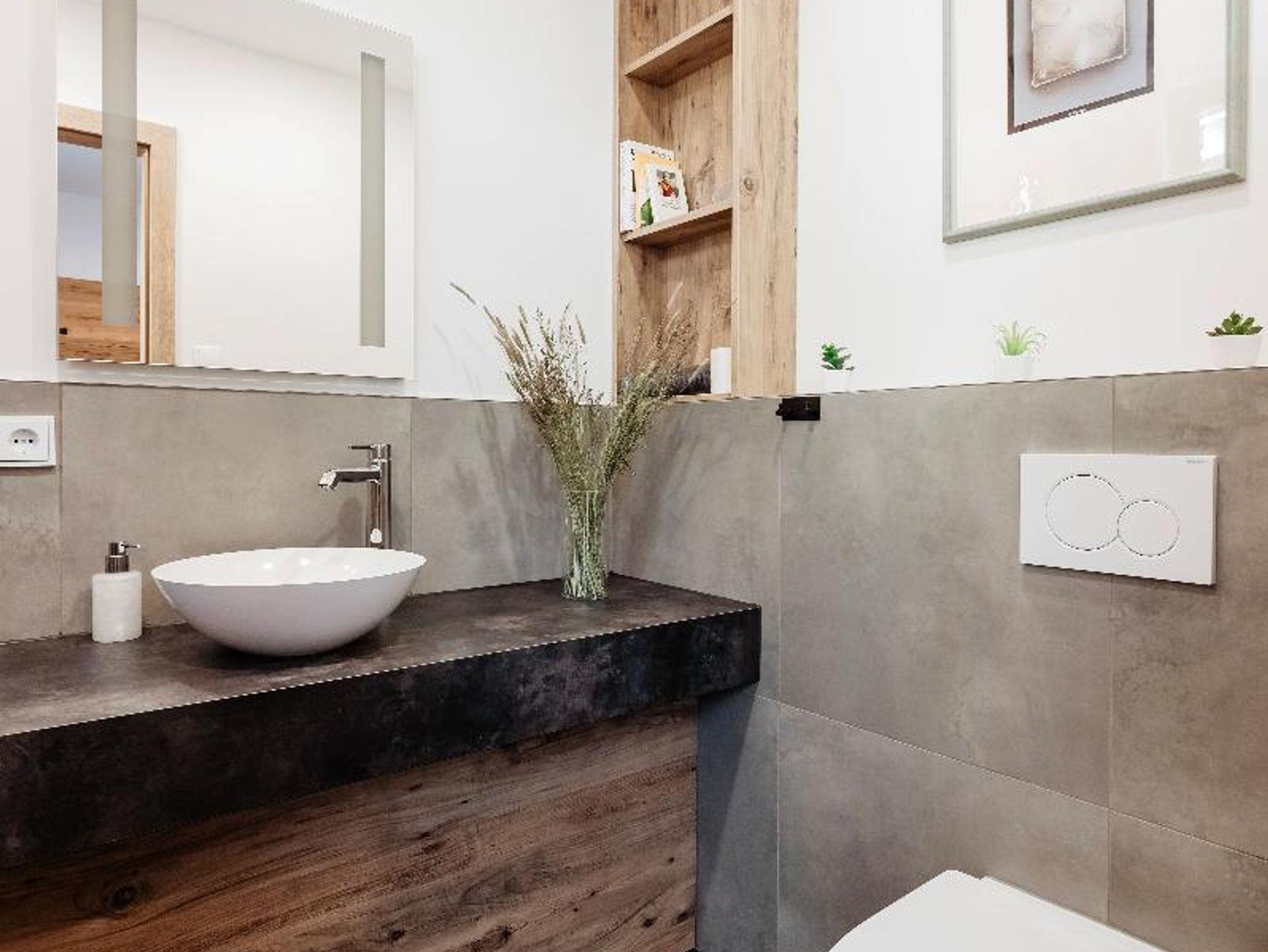 Im Eingangsbereich befindet sich die Garderobe sowie die Toilette mit Fenster. Der großzügige Wohnbereich besteht aus einer gut ausgestatteten Küche mit Weinkühlschränken, Kaffeevollautomat, Mikrowelle usw., einem Essplatz, einer gemütlichen Couchecke und einem 55 Zoll Smart TV-Gerät. Von hier aus gelangt man in das Schlafzimmer mit Boxspringbett und Smart TV. Nebenan liegt das großzügige Badezimmer mit steuerbarer Wellness-Ambiente-Beleuchtung, freistehender Badewanne, Walk-in-Regendusche, Einbauradio mit Bluetooth-Funktion und finnischer Sauna mit Infrarot-Bereich. Ein besonderes Highlight ist der 25 qm große überdachte Balkon, den man über Wohn- und Schlafzimmer betreten kann und der mit Sonnenliegen, Sitzgarnitur und einem Whirlpool ausgestattet ist. Von dort aus haben Sie einen traumhaften Ausblick auf die grandiose Natur. Genießen Sie Ihren privaten Relax- und Wellnessbereich!