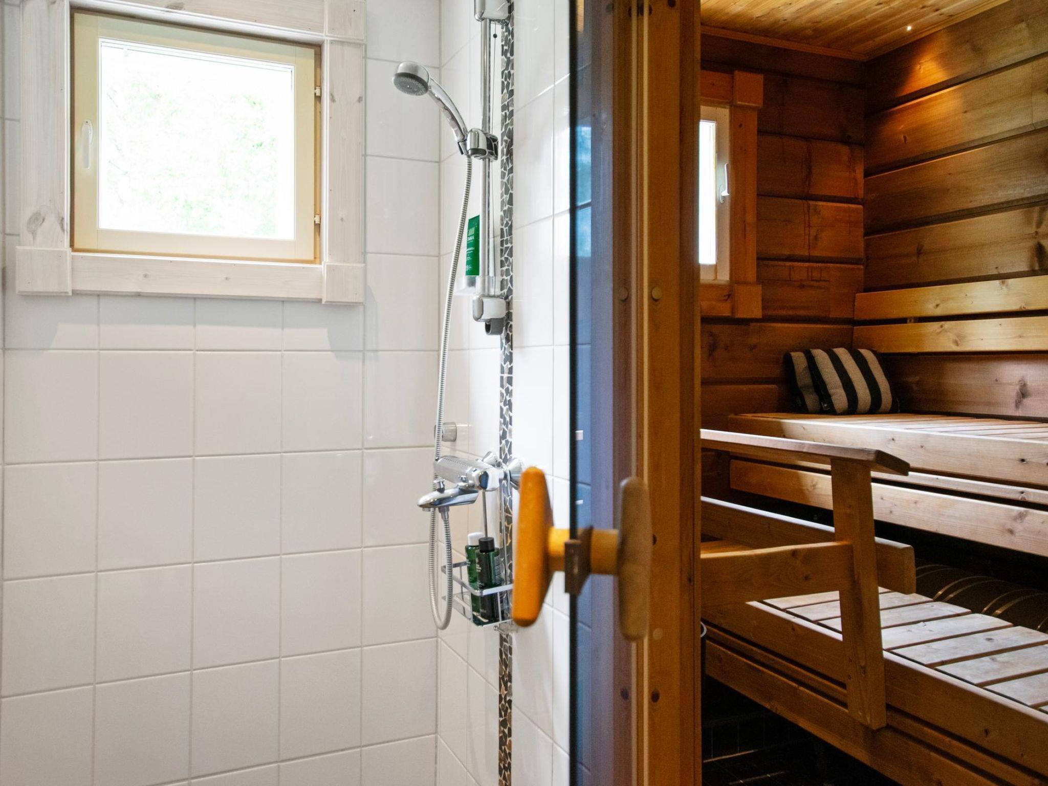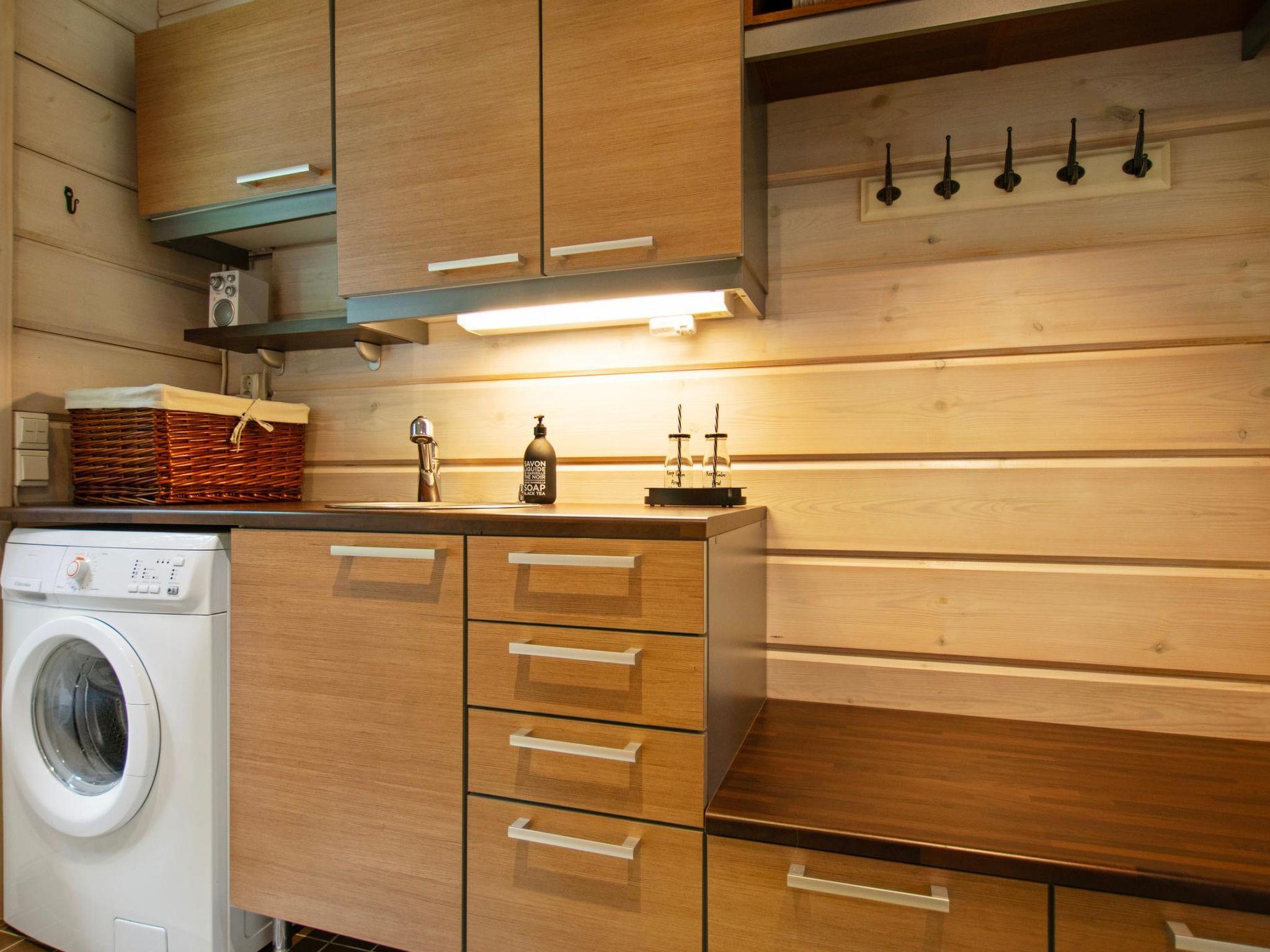 This log-built villa (2009) features a spacious living room with a comfortable seating area, a heat-storing fireplace, and a large dining table. The kitchen is well-equipped for meal preparation. There is a separate WC and a utility room with a washing machine. The washroom includes a shower and a sauna with an electric sauna stove.