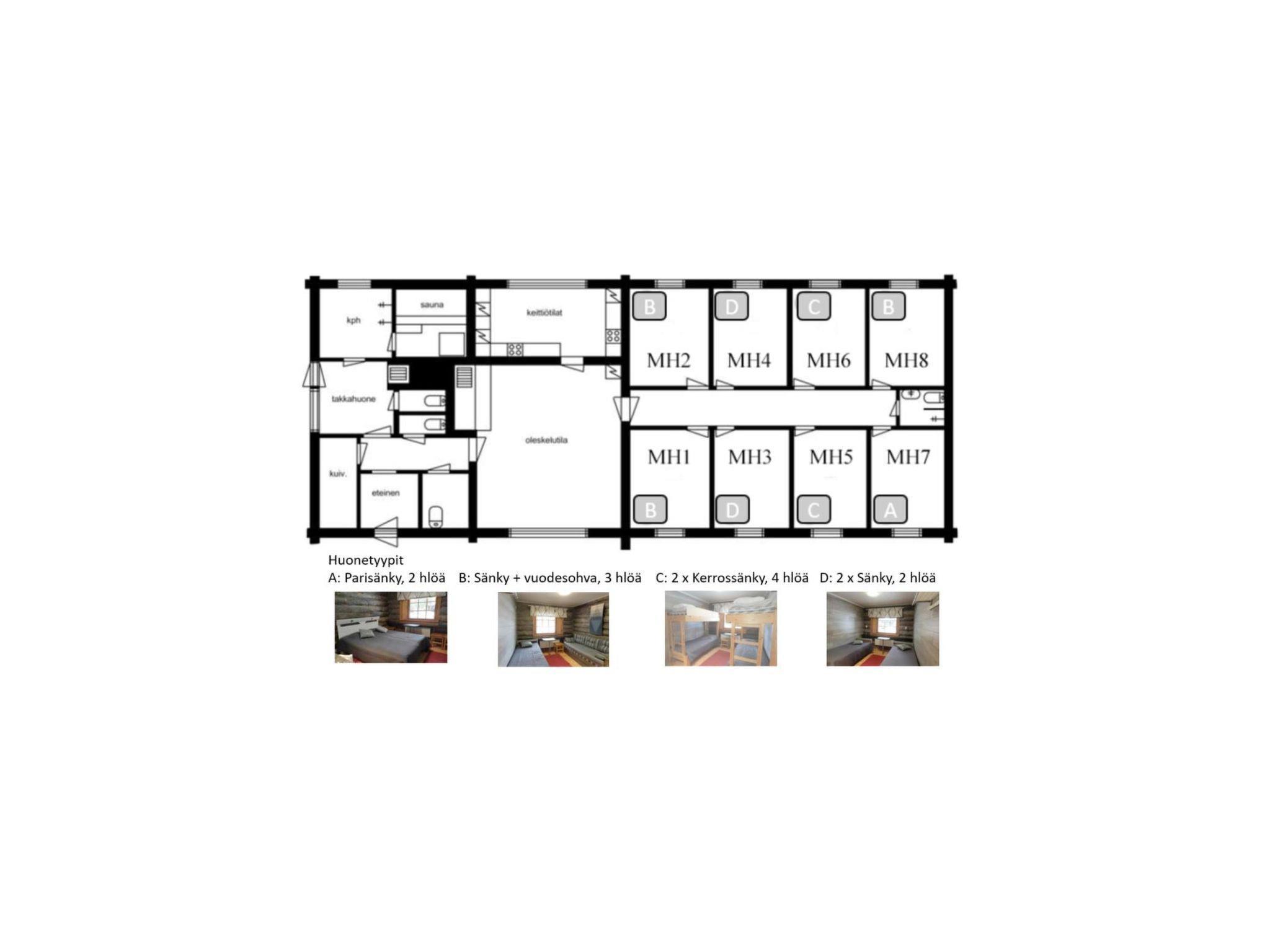 It offers space for up to 22 people and provides sleeping places and tableware for all. There are 8 bedrooms available, ranging in capacity from 1 to 4 people. Three of them have sofa beds and normal beds, two have two single beds, two have bunk beds, and one has a double bed. Each bedroom is equipped with a small refrigerator.