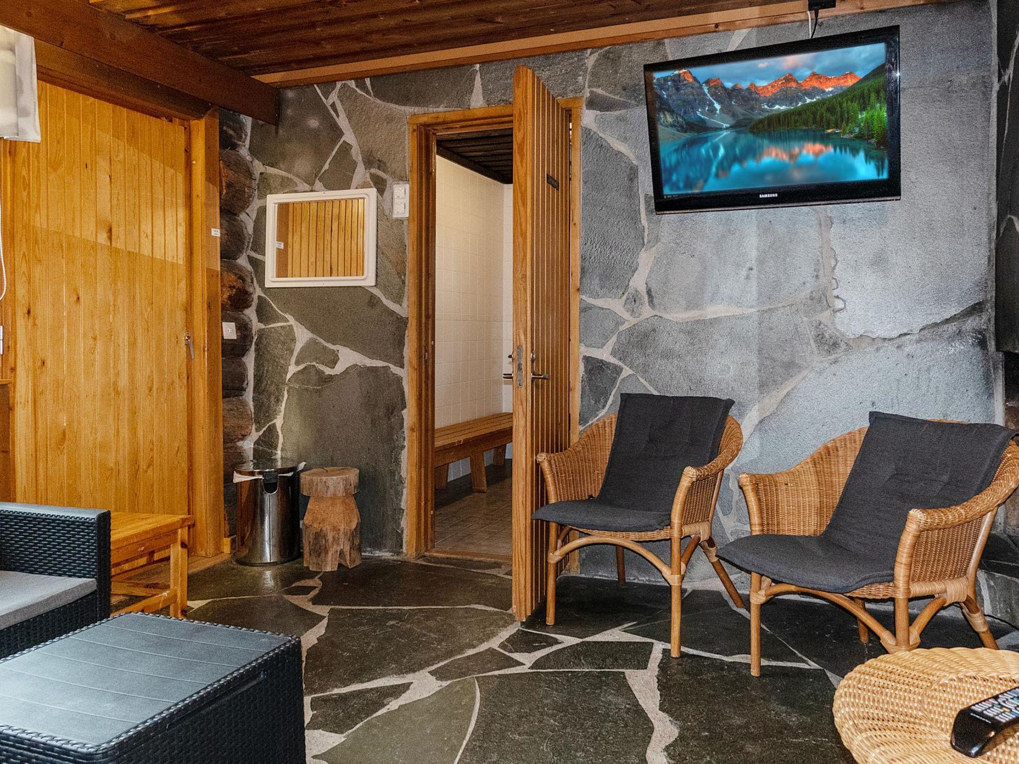 The cabin offers excellent kitchen, dining, and cold storage facilities. There are separate living and fireplace rooms, each with own fireplace and TV. Spacious sauna area with timer-controlled electric sauna stove is also available. Four WCs, one includes a shower cubicle. Technical room with two electric drying cabinets, drying rack, washing machine, and tumble dryer.