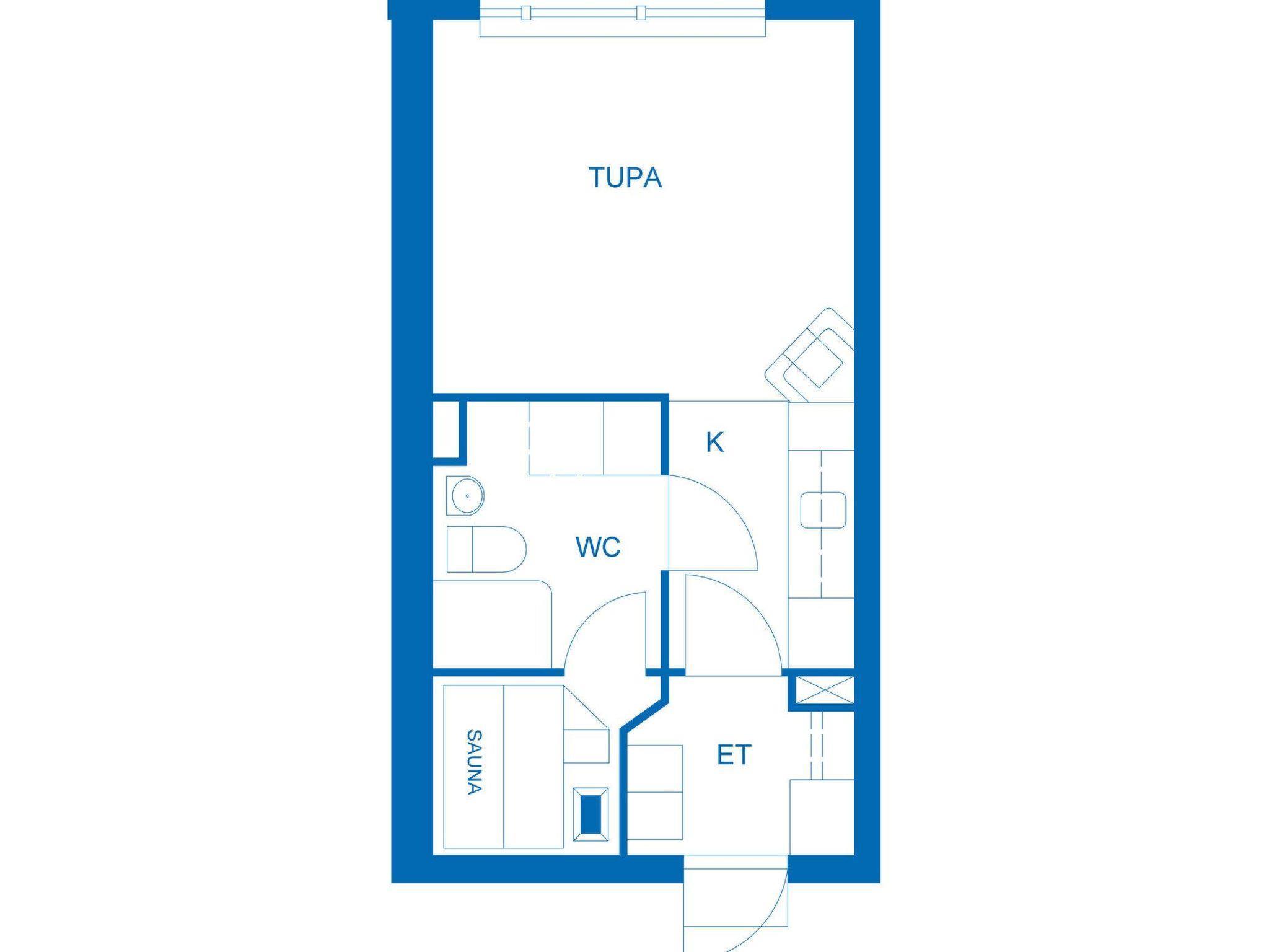 The stylish studio apartment has everything you need at your fingertips. There are two single beds in the living room. The kitchenette has everything you need for cooking, and you can enjoy the warmth of the fireplace while dining in the living room.