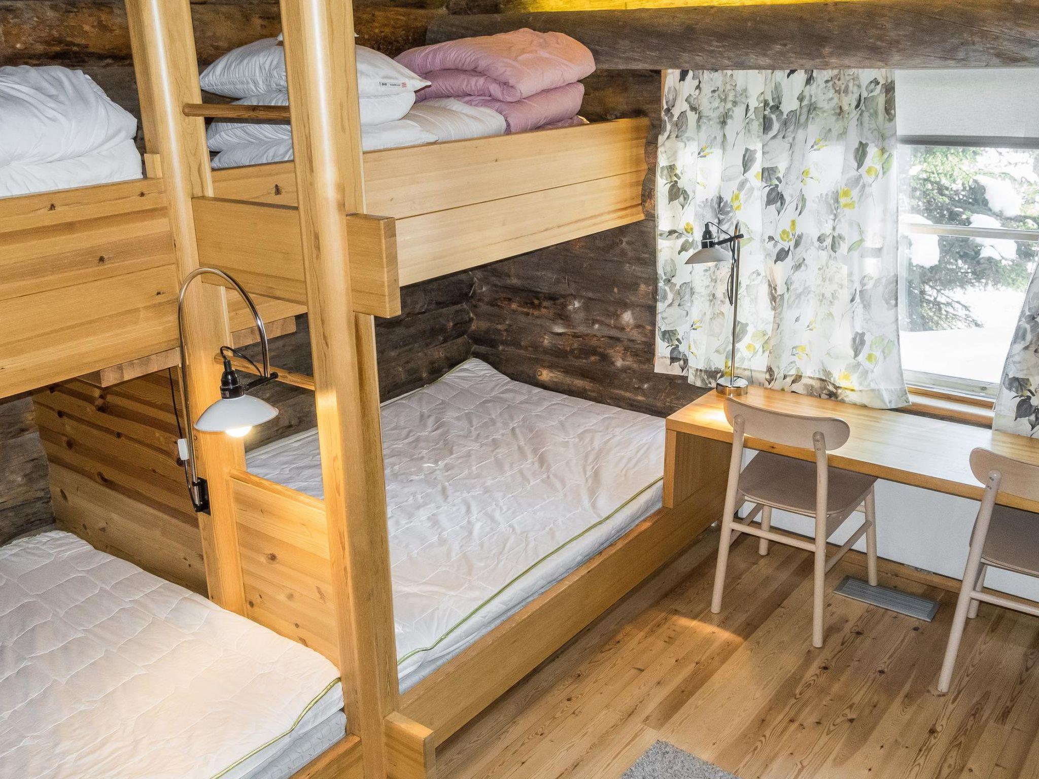 Living room with a fireplace made of natural stone, kitchen/dining area, 2 bedrooms with 2 bunk beds (lower bed 140 cm wide, upper bed 80 cm wide), a bedroom with a bunk bed (lower bed 140 cm wide, upper bed 80 cm wide), loft with 2 mattresses, electric sauna, shower room/toilet and toilet.