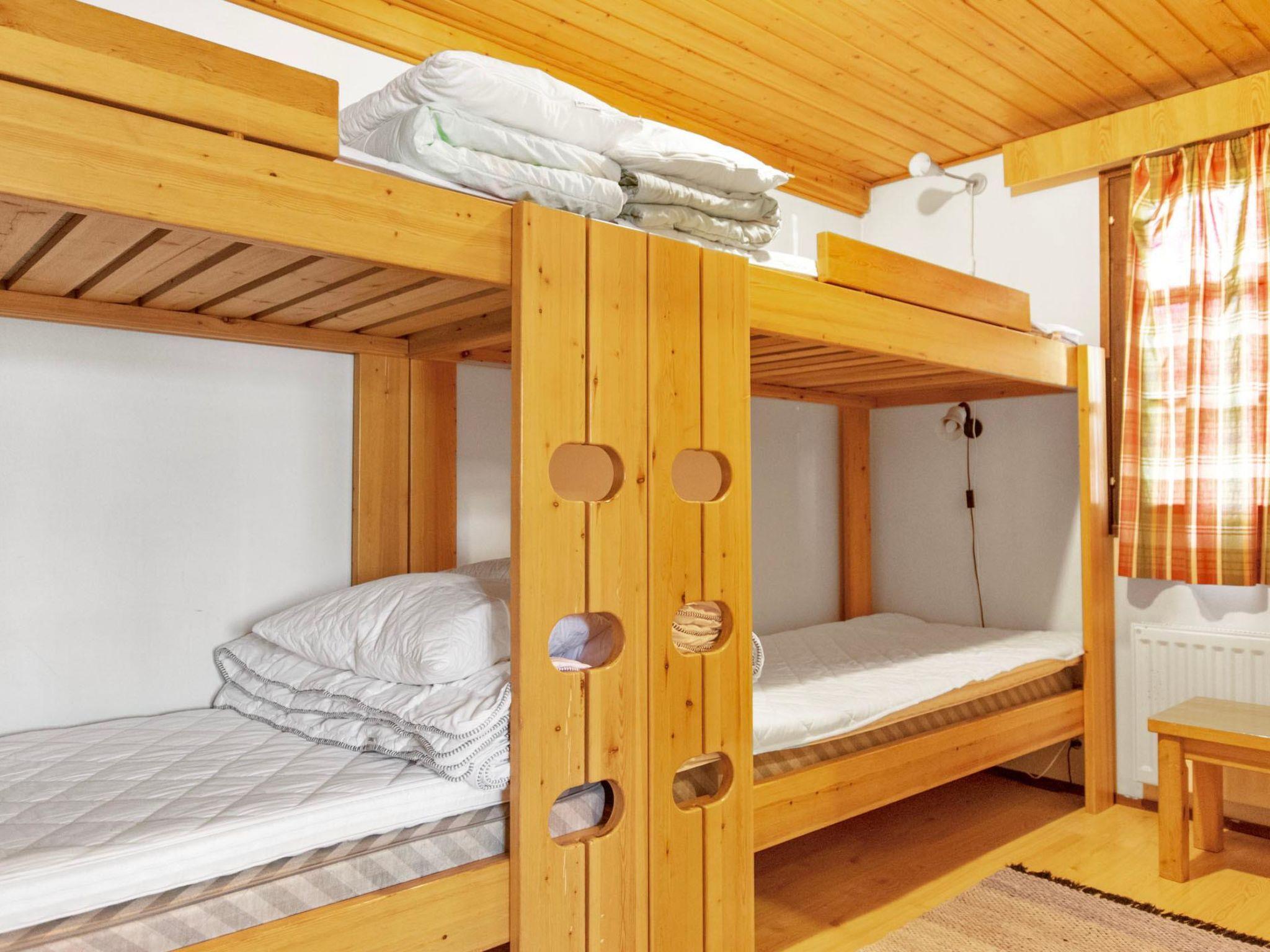 The ground floor bedroom has two bunk beds. Upstairs, there are two beds in the bedroom and two beds in the open loft.