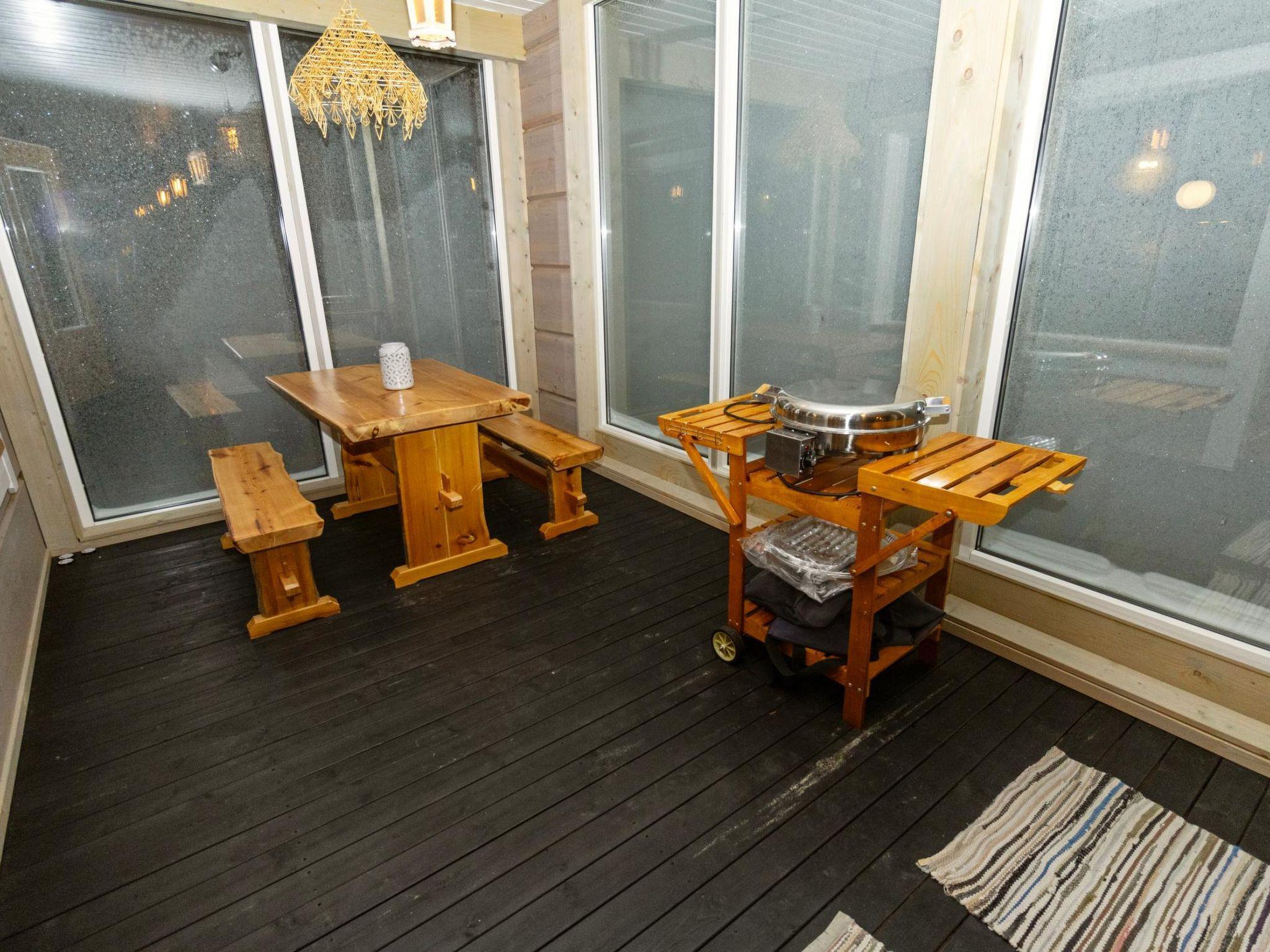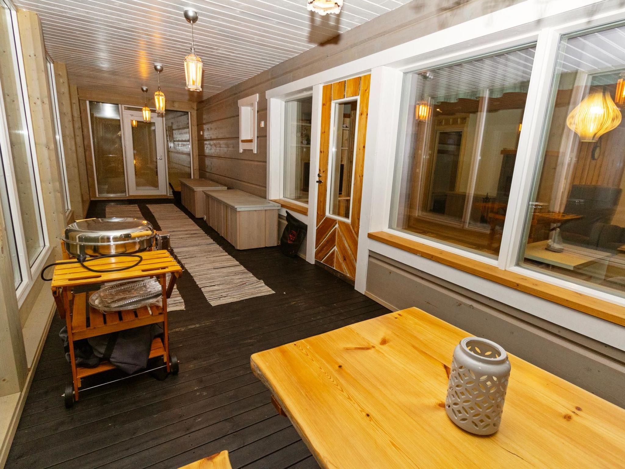 A large covered and glazed terrace spanning the entire cabin's width allows for grilling and outdoor enjoyment in all weather conditions.