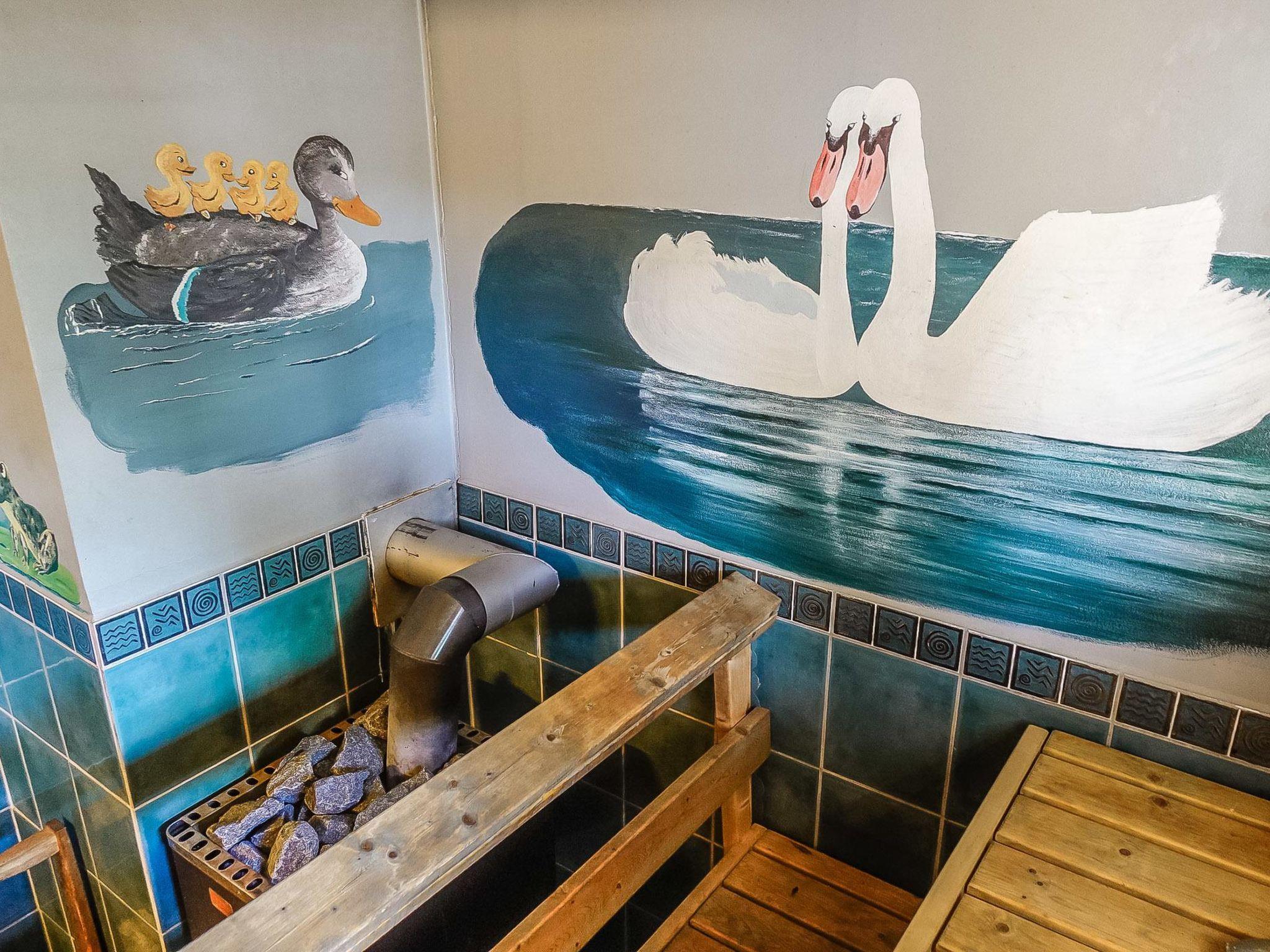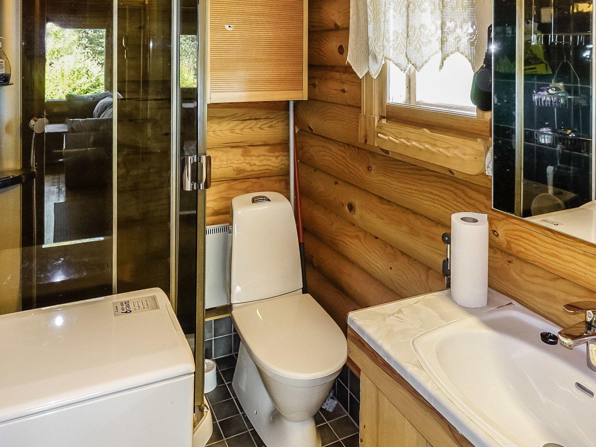 Round log cabin, built in 2005. Living room/kitchen, with sofabed for 1-2 person. Double bed in bedroom, bouble bed in loft, + 1 separate bed (80cm wide). Sauna, washroom (shower cubicle)/WC and covered porch.