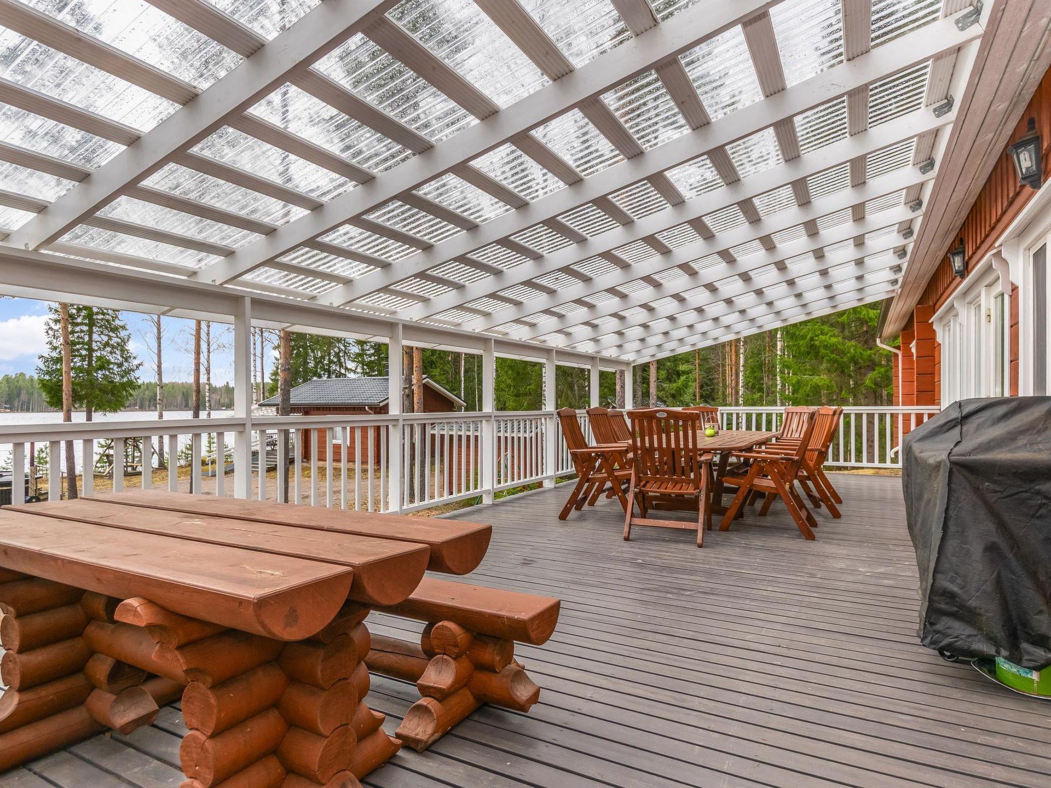 The separate lakeside sauna charms guests with its stunning lake views. The sauna building includes a living area with a sofa, a heat-storing fireplace, and a mini-kitchen. The covered terrace offers a breathtaking view of the lake. The lakeside sauna is available for year-round use. Running water is available at the sauna from May 1 to September 30; outside of this period, water must be carried from the lake or the main cabin.
