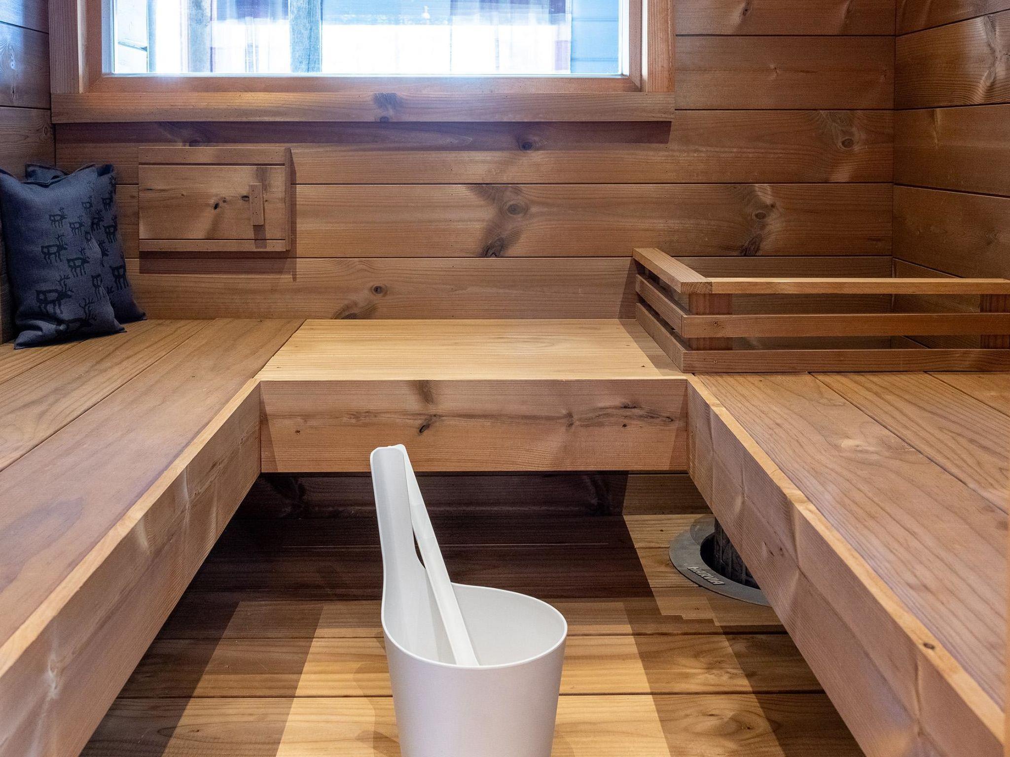 Lower floor: 2 single beds in the sleeping alcove, sofa bed in the fireplace room. Mini kitchen and electric sauna (renovated in 2024) + toilet.