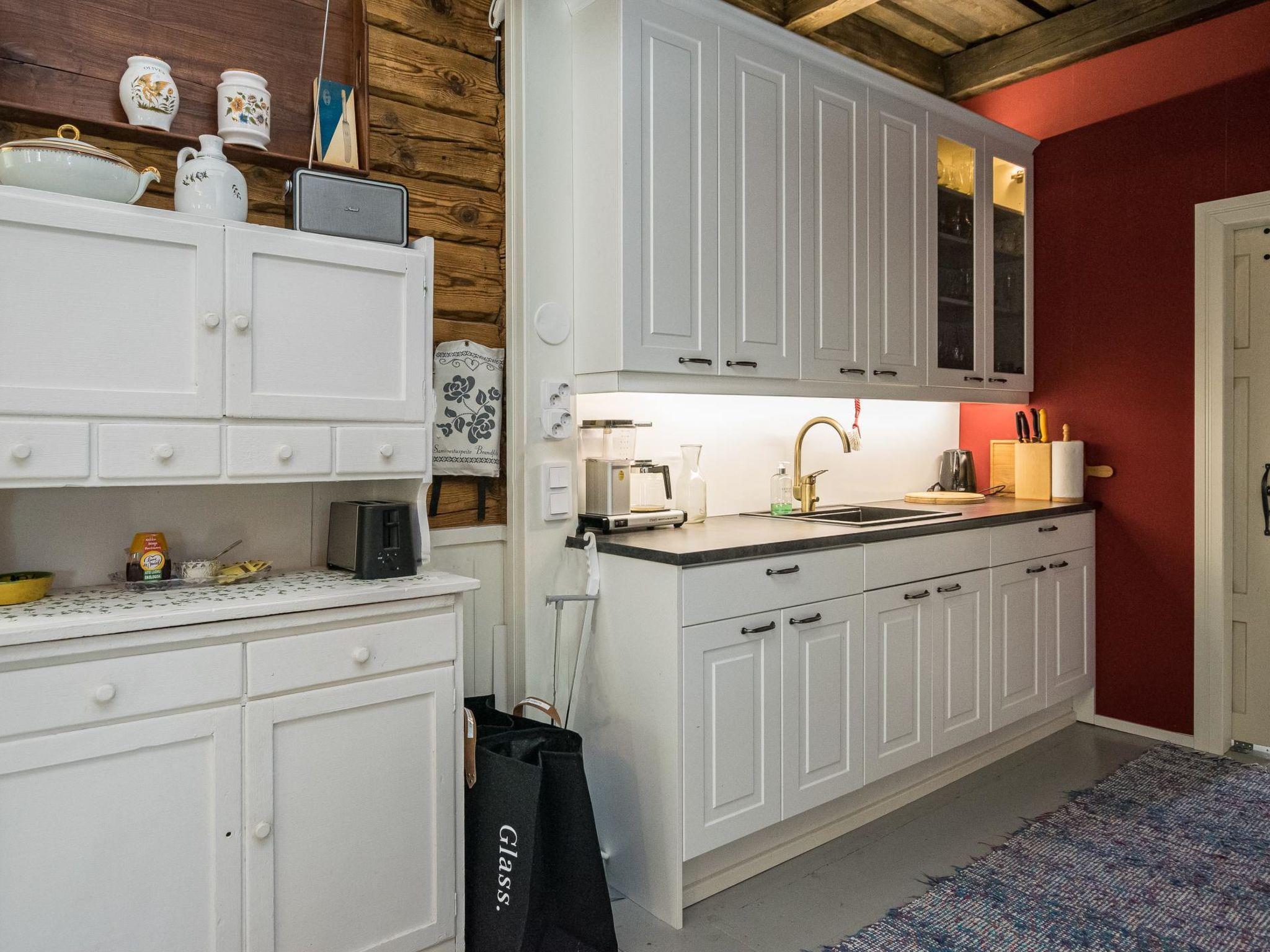 The cottage also has a wood stove and baking oven. Ceramic hob and convection oven. The dishwasher is a small table model.