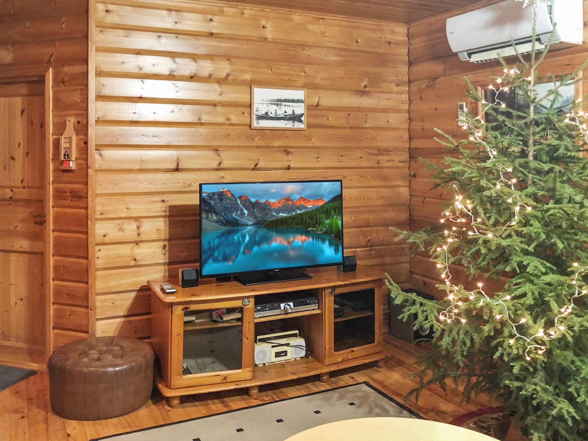 The cabin is a traditional planed log cabin that radiates warmth and coziness. It is insulated and paneled inside, creating a cozy atmosphere.