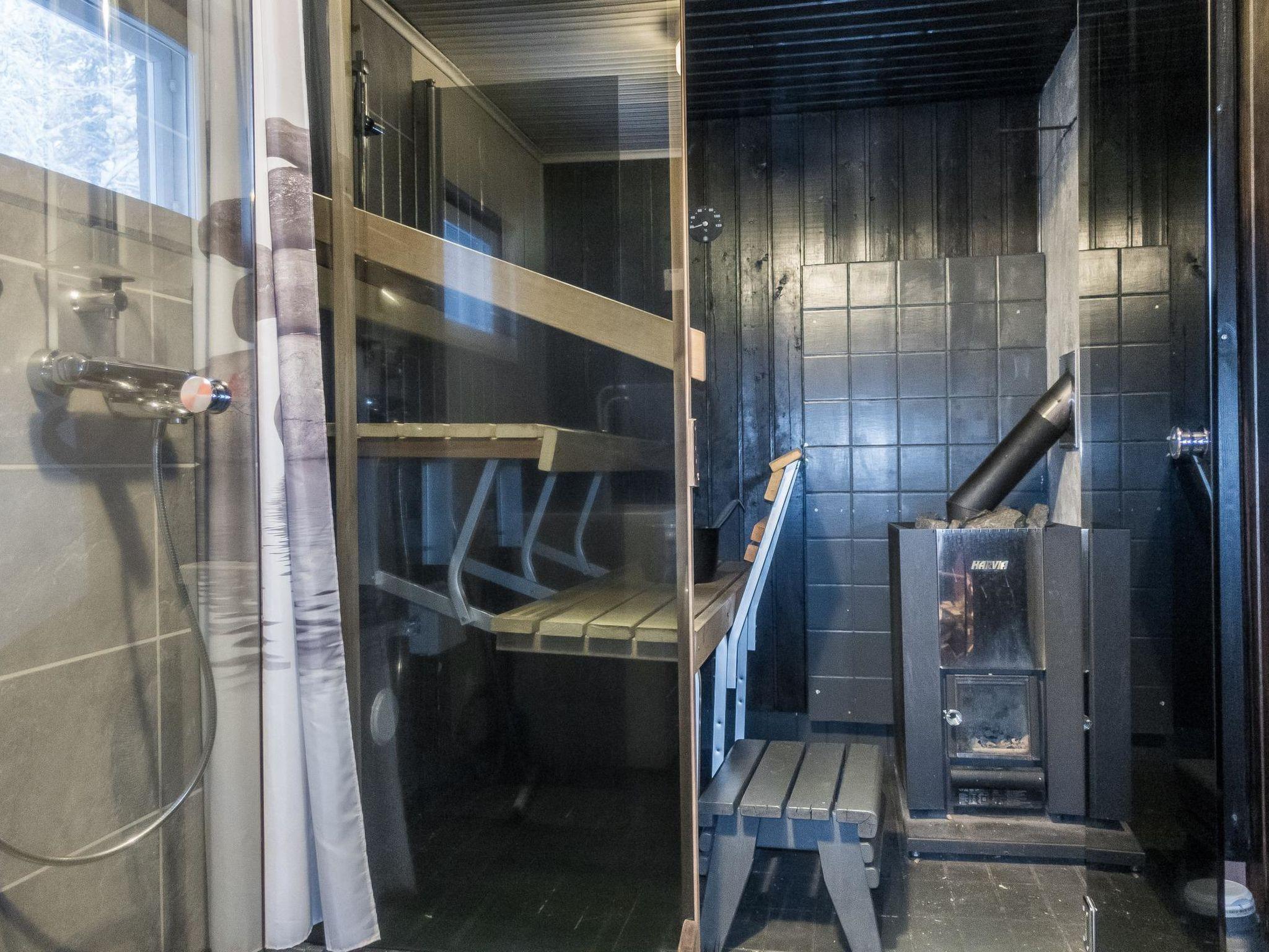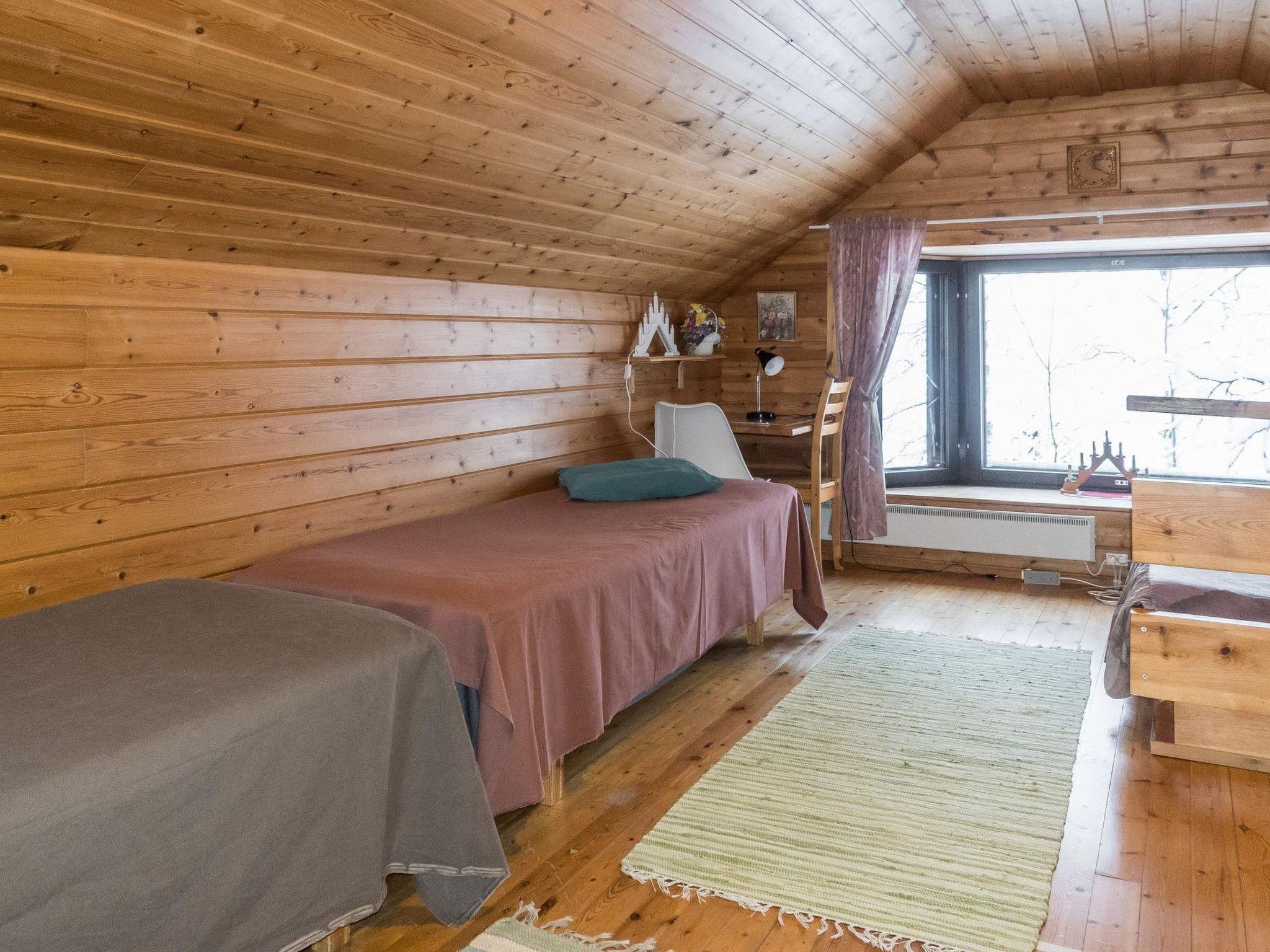 On the ground floor, there is a living room with a sofa bed for relaxation. The kitchen is equipped with necessary utensils and appliances for preparing delicious meals. There is also a bedroom downstairs with a double bed, providing a peaceful place to rest. Furthermore, the ground floor includes a sauna with a wood-burning sauna stove, a bathroom, and a separate WC.
