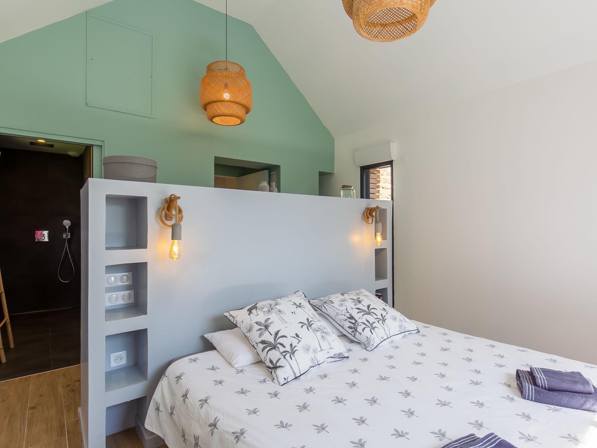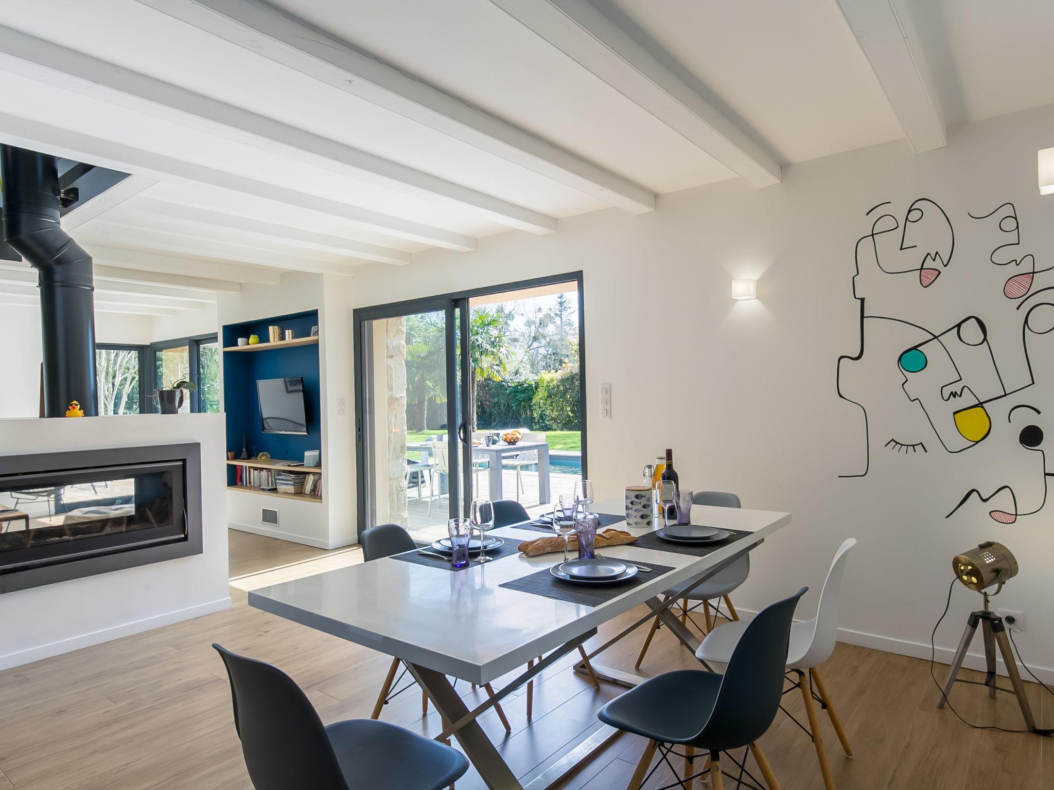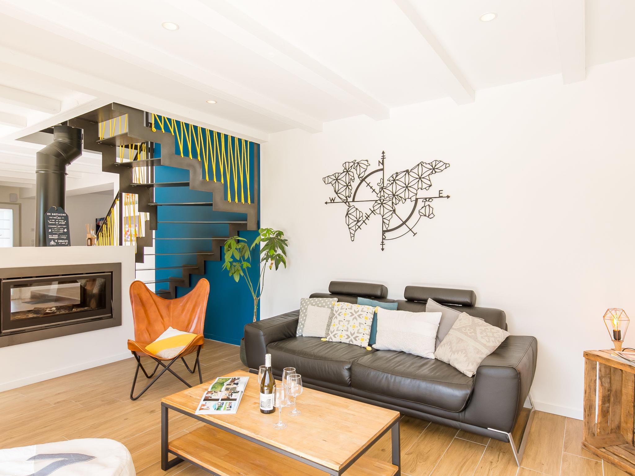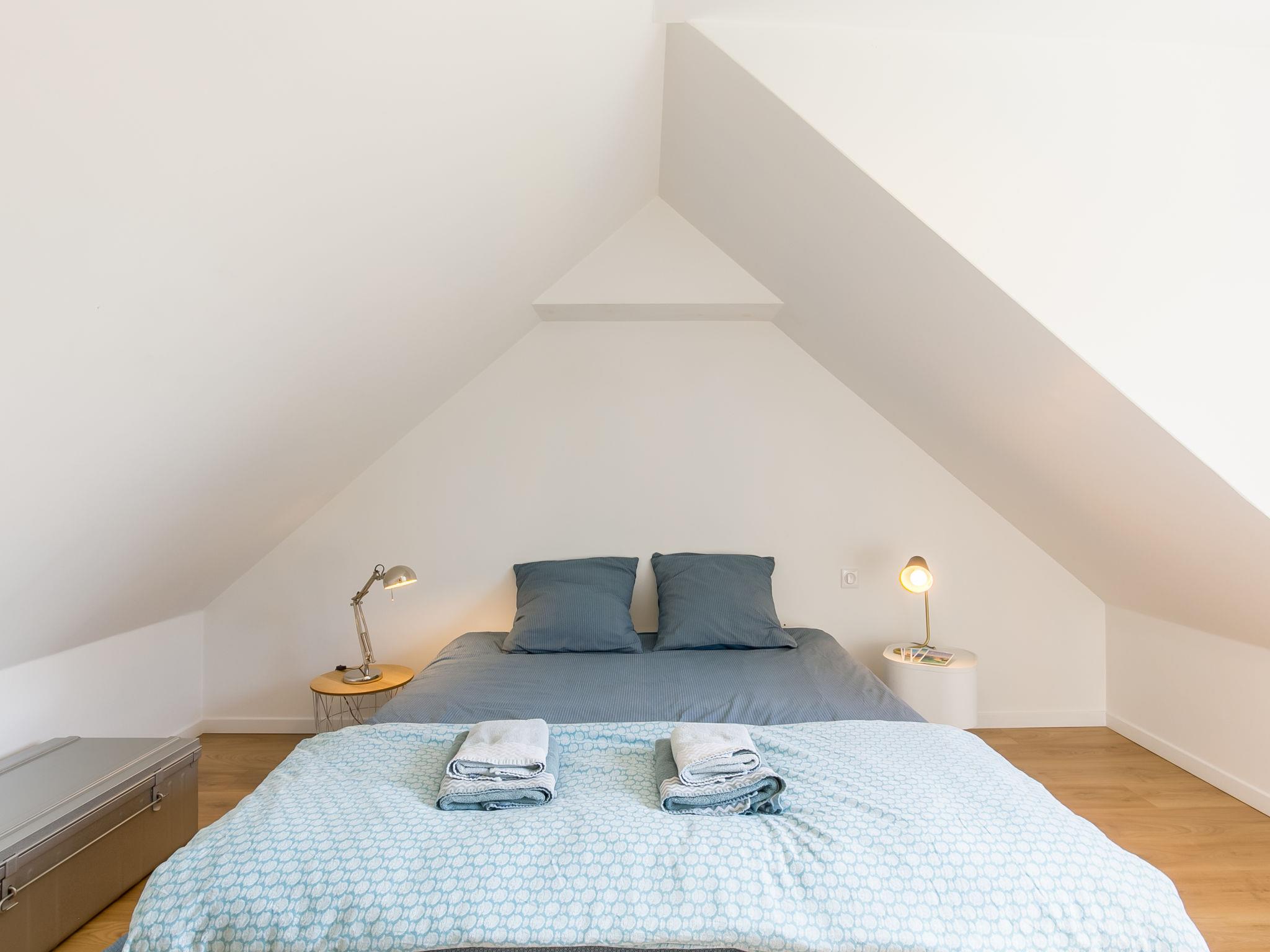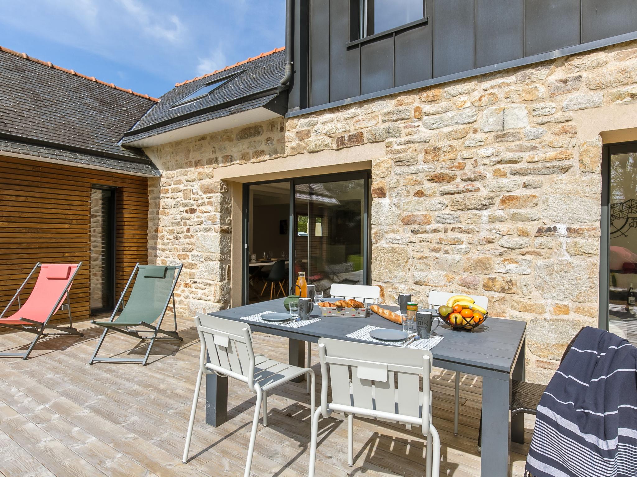 "Breizh Riviera", 4-Zimmer-Haus 130 m2 auf 2 Stockwerken. Geräumig und hell, modern und geschmackvoll eingerichtet: Wohn-/Esszimmer mit offenem Kamin, Esstisch, Sat-TV, Internationale TV-Sender und Flachbildschirm. Ausgang zur Terrasse, zum Schwimmbad. 1 Zimmer mit 1 franz. Bett (180 cm, Länge 200 cm), Dusche und Doppelwaschbecken. Offene Küche (Backofen, Geschirrspüler, 3 Induktionskochplatten, Toaster, Wasserkocher, Mikrowelle, Tiefkühler, elektrische Kaffeemaschine) mit Esstisch. Sep. WC. Obergeschoss: 1 abgeschrägtes Zimmer mit 1 franz. Bett (160 cm, Länge 200 cm). 1 abgeschrägtes Zimmer mit 2 Betten (90 cm, Länge 200 cm). Bad/WC. E-Heizung. Parkettboden. Grosse Terrasse 100 m2, Südlage. Terrassenmöbel, Gartengrill (mobil), Liegestühle (4). Zur Verfügung: Waschmaschine, Wäschetrockner, Bügeleisen. Internet (WLAN, gratis). Bitte beachten: Nichtraucher-Haus. Maximal 1 Haustier/Hund erlaubt. Rauchmelder.