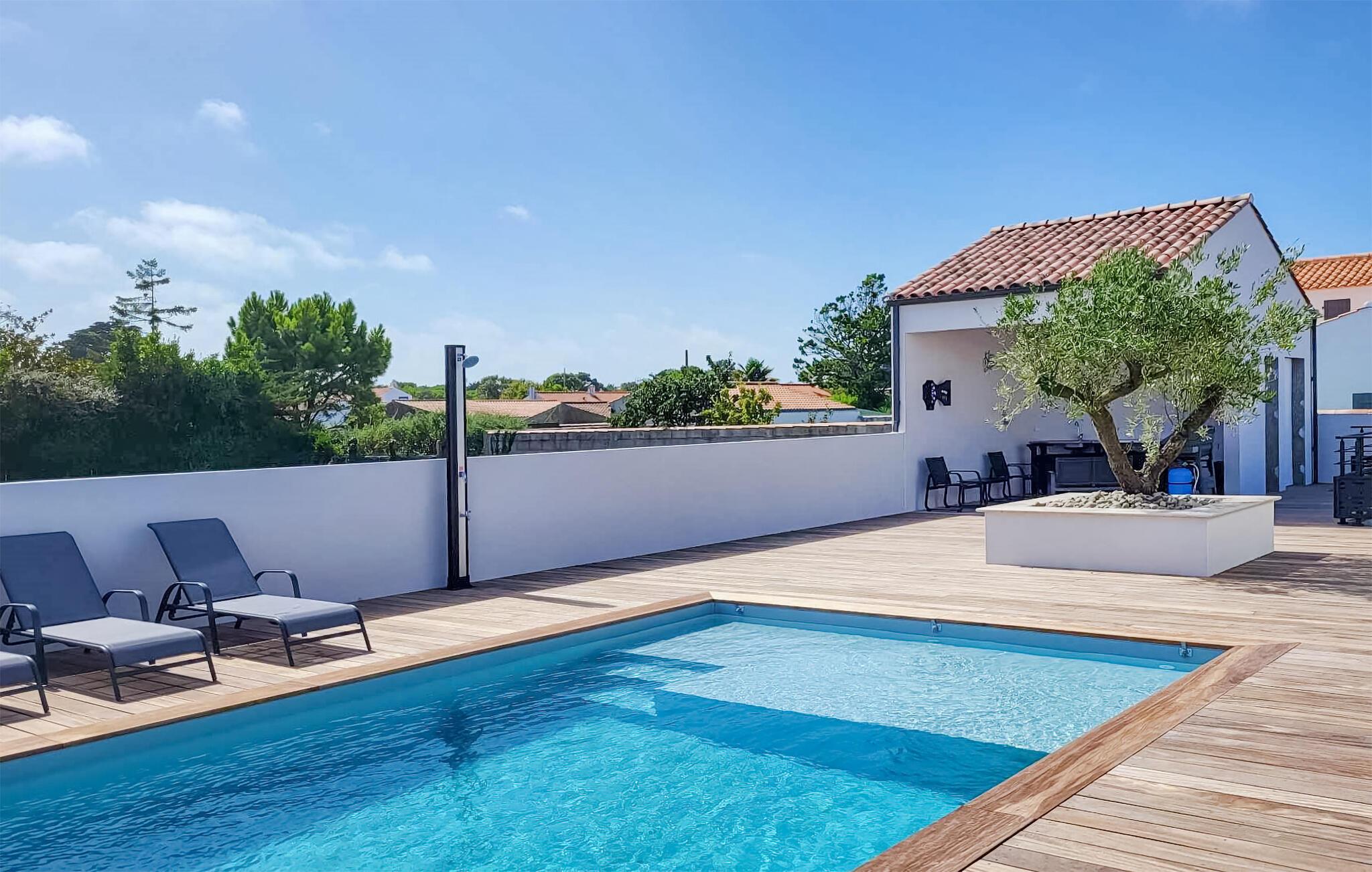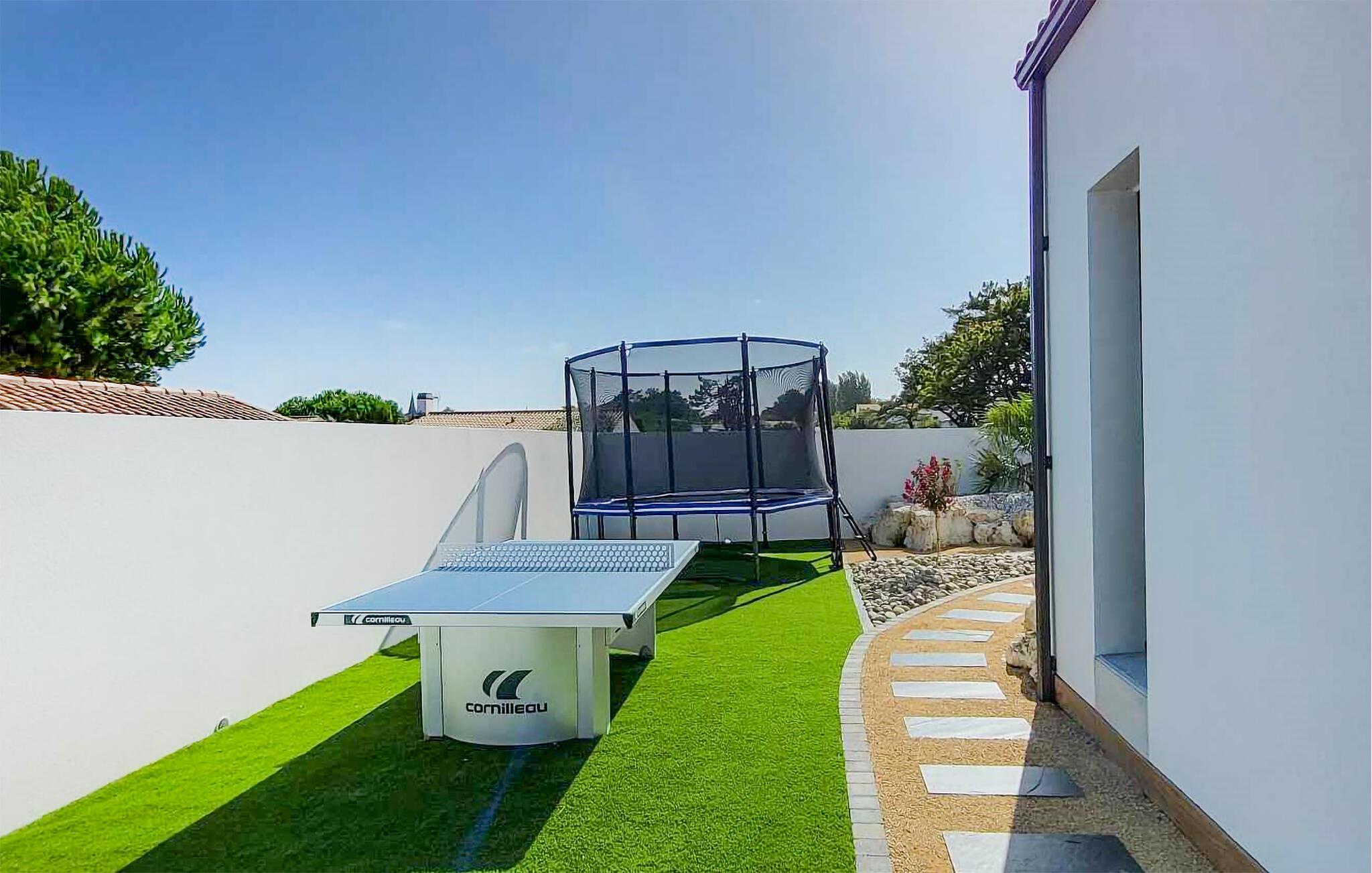 Hier können die schönsten Wochen des Jahres beginnen und Sie in traumhafter Umgebung der Insel Noirmoutier zur Ruhe kommen. Gemeinsam mit befreundeten Familien oder Ihrer Großfamilie können Sie das große Haus entdecken und sich von den hellen und geschmackvollen Räumen überzeugen. Genießen Sie Ihre Privatsphäre in den Schlafzimmern mit anschließenden Badezimmern oder erfreuen sich an geselligen Stunden in der geräumigen Küche sowie am Esstisch, an dem alle Platz finden werden. Während die einen sich nach Ihren Ausflügen auf dem Sofa entspannen, werden die anderen den schön angelegten Garten entdecken. Spielen Sie Tischtennis, schauen Sie Ihren Kindern beim Hüpfen auf dem Trampolin zu oder erfrischen sich im beheizten Pool. Lassen Sie die Abende bei gegrillten Speisen aus der Sommerküche ausklingen und schmieden Pläne für die bevorstehenden Urlaubstage.