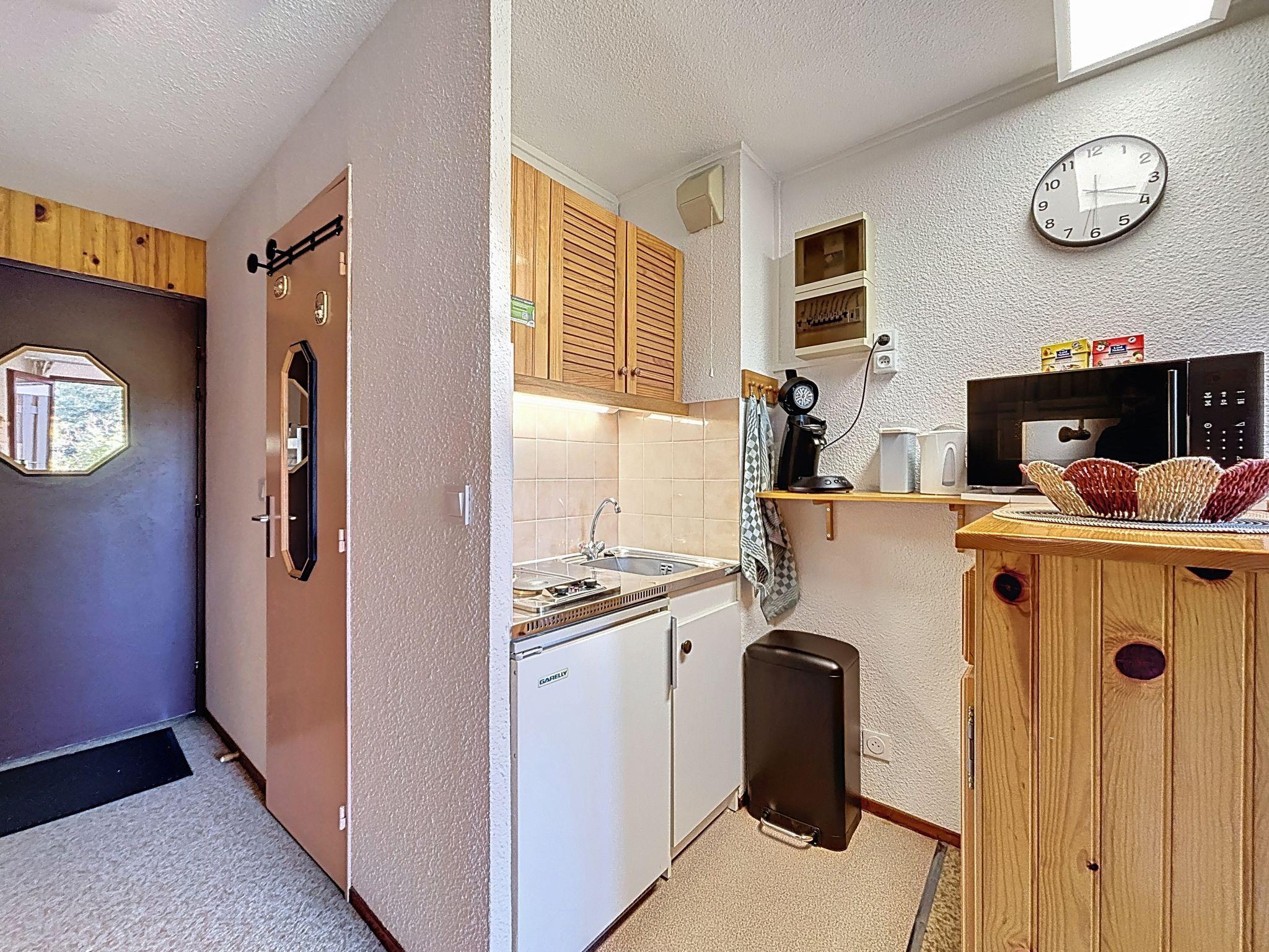 1-Zimmer-Studio 17 m2 im 1. Stock. Esszimmer mit 1 Klappbett (140 cm, Länge 190 cm), TV (Flachbildschirm), E-Heizung. Ausgang zum Balkon, Richtung Südwesten. Eingang mit 1 x 2 Etagenbetten (80 cm, Länge 190 cm). Kochnische (2 Kochplatten, Wasserkocher, Mikrowelle, elektrische Kaffeemaschine, Kapseln für die Kaffeemaschine (Senseo)). Dusche/WC. E-Heizung, Boiler (100 Liter). Kleiner Balkon, Südwestlage. Balkonmöbel. Sicht auf die Berge. Bitte beachten: Nichtraucher-Unterkunft. Rauchmelder. Anstelle eines abgeschlossenen Schlafzimmers befinden sich manche Schlafplätze in einem offenen Bereich (Galerie, Nische etc.). Bettwäsche, Handtücher, Endreinigung und alle Energiekosten sind inkludiert. Inserat einer Privatperson nach Artikel 155, IV, CGI.