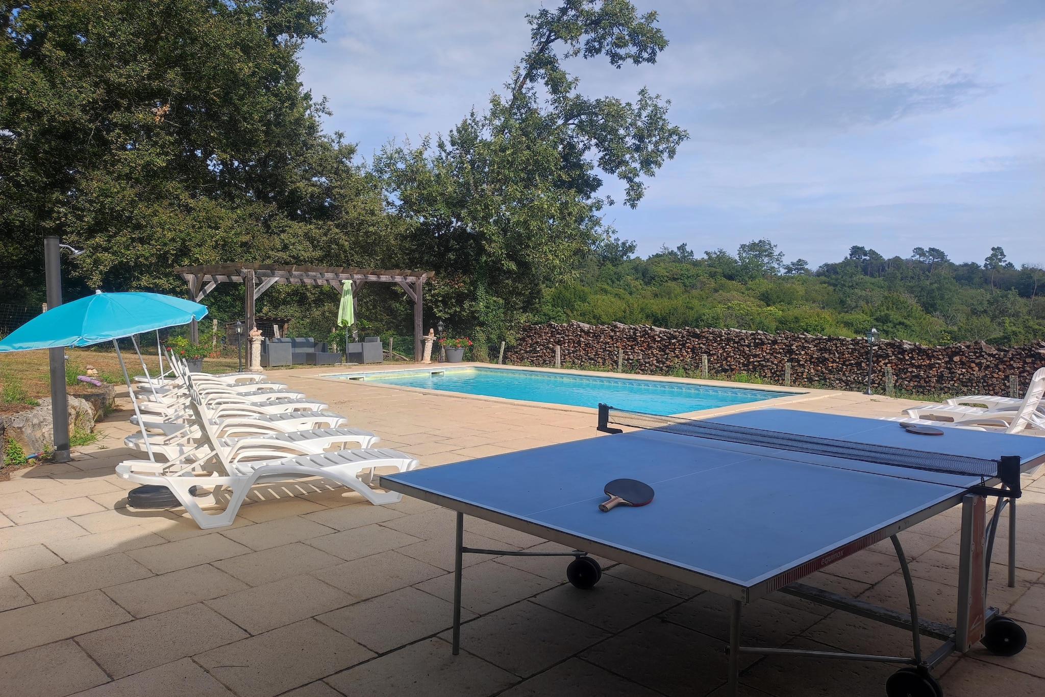 In den ruhigen Hügeln von Blanquefort-sur-Briolance gelegen, bietet dieses geräumige Ferienhaus mit 4 Schlafzimmern Platz für bis zu 10 Gäste und bis zu 5 Haustiere (nach vorheriger Anmeldung). Es ist der perfekte Rückzugsort auf dem Land für Familien und Gruppen und bietet einen großen privaten Swimmingpool, Tischtennisplatten und ein Klettergerüst für Kinder. Umgeben von Waldwegen und sanften Hügeln lädt die Gegend zum Wandern, Radfahren und Reiten ein (2 km entfernt). Der Garten ist mit Gartenmöbeln, einer Grillterrasse und Spielgeräten ausgestattet. Das Haus verfügt über ein Kinderbett, einen Hochstuhl und kinderfreundliche Annehmlichkeiten. Entdecken Sie nahegelegene kulturelle Highlights wie das Château de Bonaguil (14 km), Monpazier (13 km) und Belvès (23 km) mit seinen unterirdischen Höhlen. Familien werden den Wasserpark in Le Bugue (41 km) lieben. Genießen Sie die berühmten Walnüsse, Trüffel und Foie Gras der Region und speisen Sie in den nur 4 km entfernten Restaurants. Ein Supermarkt befindet sich 15 km vom Anwesen entfernt. Da der Flughafen Bordeaux nur 13 km entfernt ist, bietet dieses Haus einen erholsamen und gut angebundenen Ausgangspunkt für Ihr Abenteuer in der französischen Landschaft.