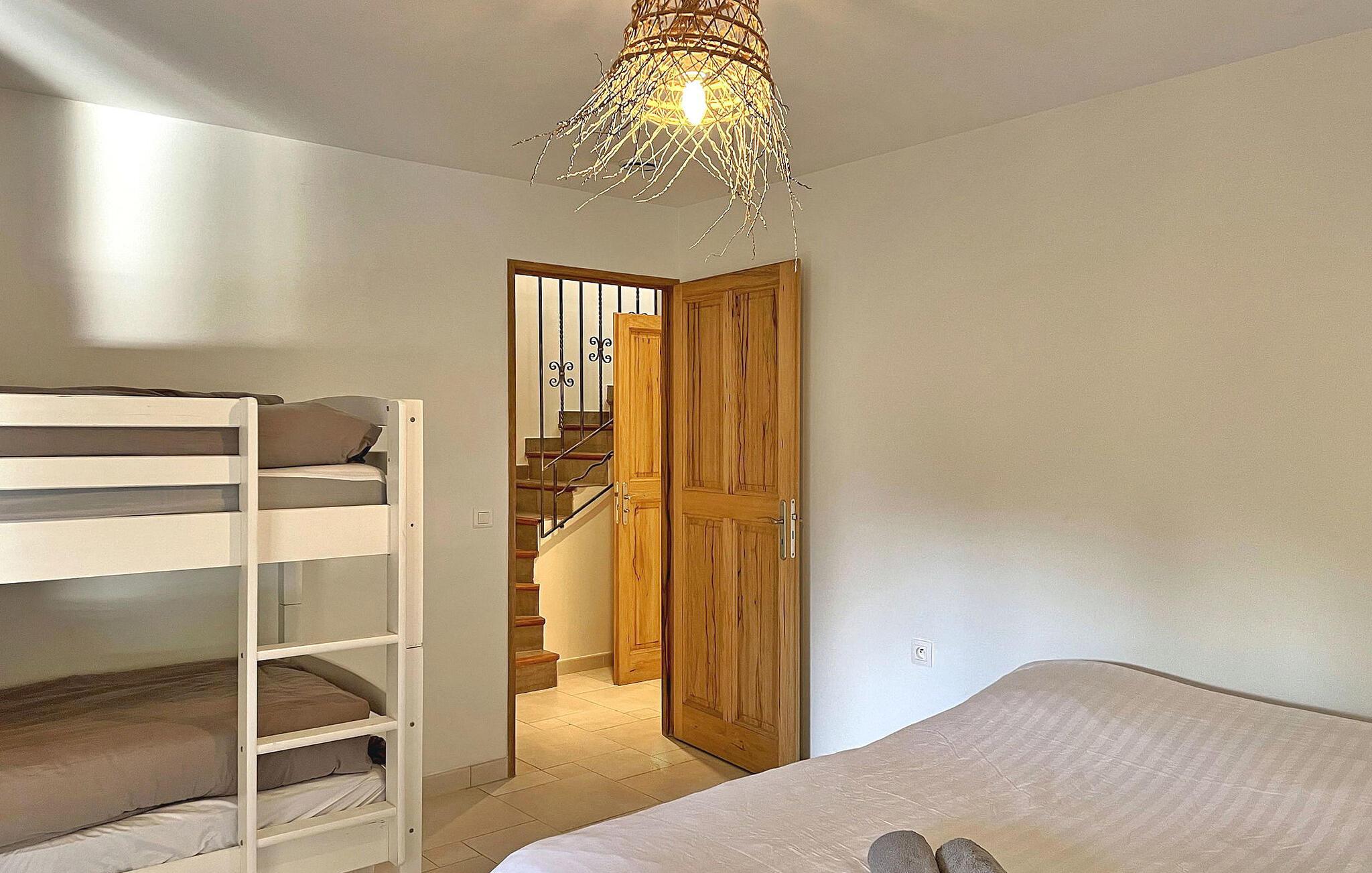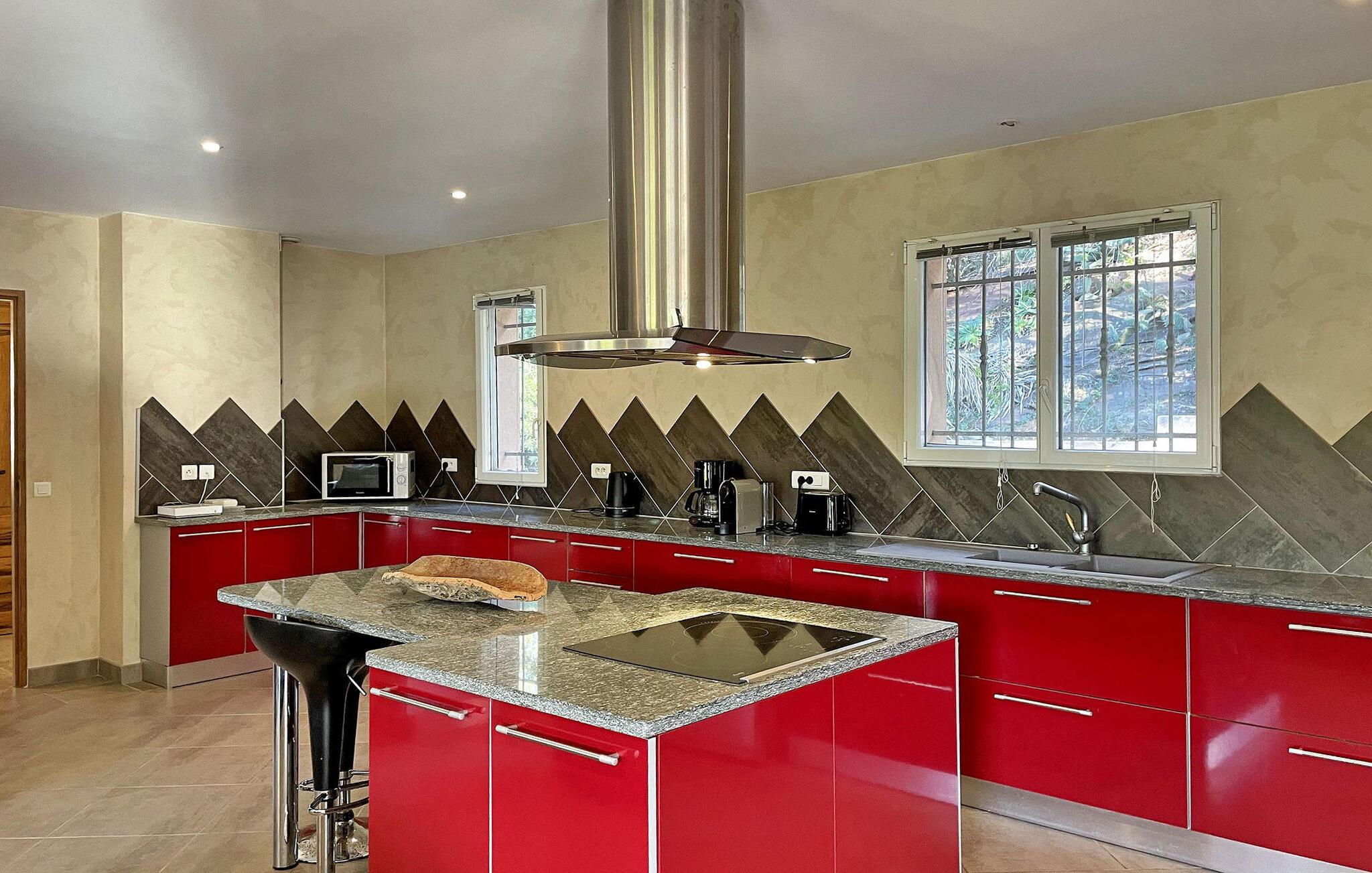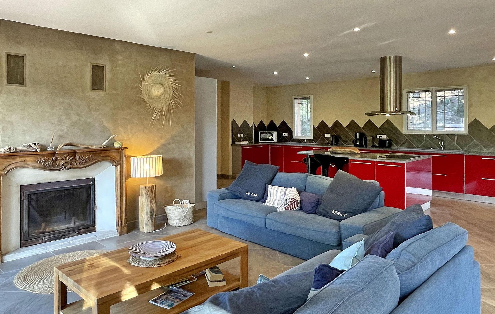 Diese Villa in Cap Bénat, Bormes les Mimosas, ist Teil eines privaten Anwesens und bietet seinen Bewohnern exklusiven Zugang zum Strand. Die Villa in Hanglage bietet geräumige Unterkünfte auf zwei verschiedenen Ebenen. Beim Betreten der Villa finden Sie einen klimatisierten Wohnbereich mit offener Küche und Essbereich. Die voll ausgestattete Küche verfügt über die wichtigsten Geräte und eine zentrale Insel, während eine geschützte Terrasse mit einem Gasgrill zusätzlichen Platz im Freien bietet. Es gibt vier Schlafzimmer – eines im Erdgeschoss und drei auf der unteren Ebene, jeweils mit Doppelbetten und eigenem Duschbad oder separatem WC. Auf der überdachten Terrasse gibt es eine Tischtennisplatte, einen beheizten, alarmgesicherten Pool und umzäunte Gärten auf verschiedenen Ebenen. Auf dem Grundstück stehen Parkplätze für drei Autos zur Verfügung. Die Villa liegt im Herzen des privaten und bewachten Anwesens von Cap Bénat und bietet Zugang zu den Privatstränden der Gebiete Cap Bénat und Gaou Bénat. Das Restaurant des Anwesens (am Strand) ist vom 1. Mai bis Mitte September geöffnet (mit dem Auto erreichbar). Cap Bénat ist ein 2500 Hektar großer Felsvorsprung an der Mittelmeerküste des Var in Bormes-les-Mimosas. Er gilt als einer der prestigeträchtigsten Orte an der Var-Küste. Die nächsten Geschäfte finden Sie in Bormes les Mimosas, etwa 8 km entfernt. Bitte beachten Sie, dass auf dem Anwesen von Cap Bénat besondere Regeln gelten, einschließlich der Ruhezeiten ab 23:00 Uhr. Wenn Störungen nachts das Eingreifen des Hausmeisters erfordern, kann die volle Kaution einbehalten werden. Exklusive Ferienvilla im Herzen des Anwesens Cap Benat.