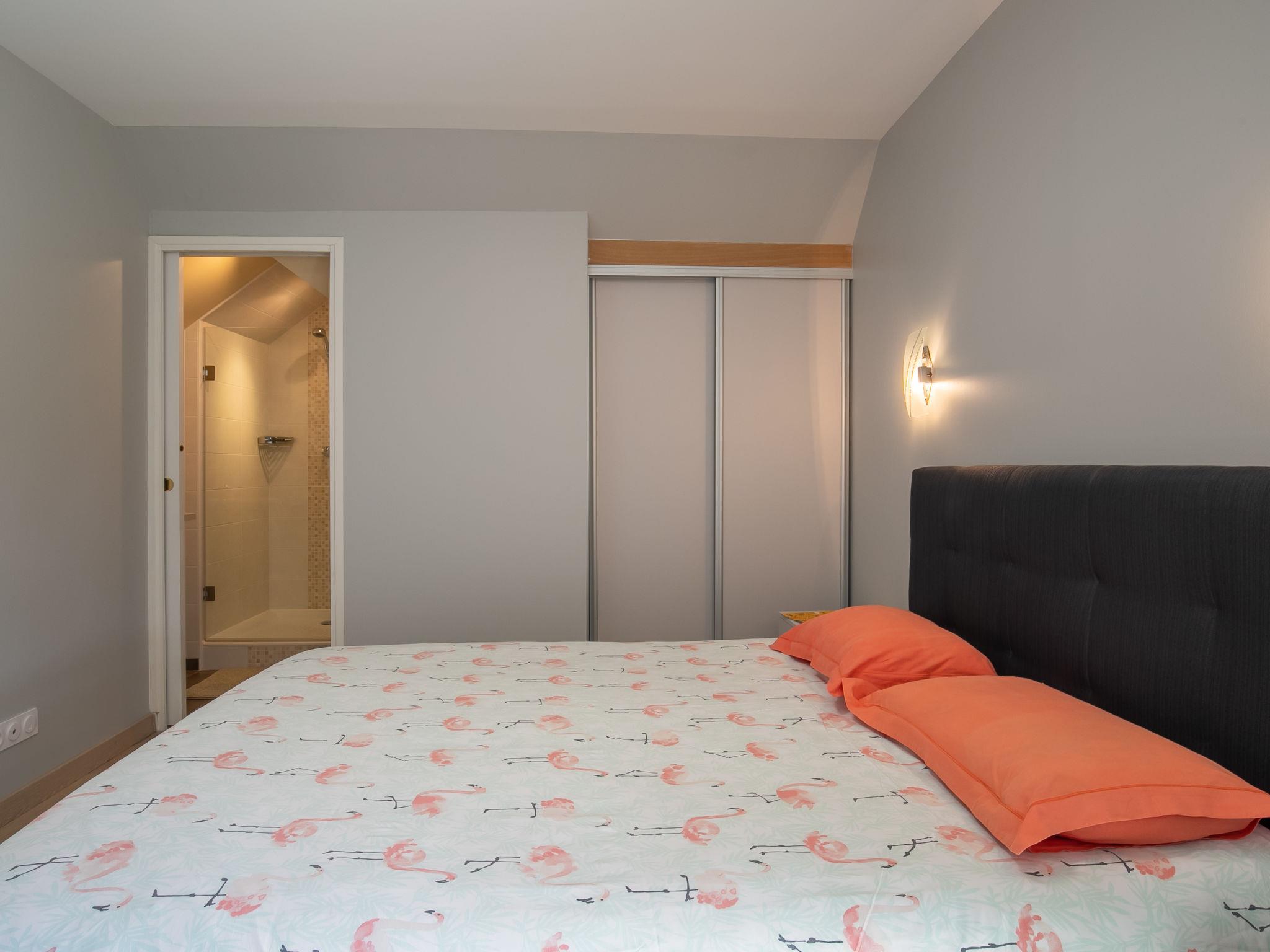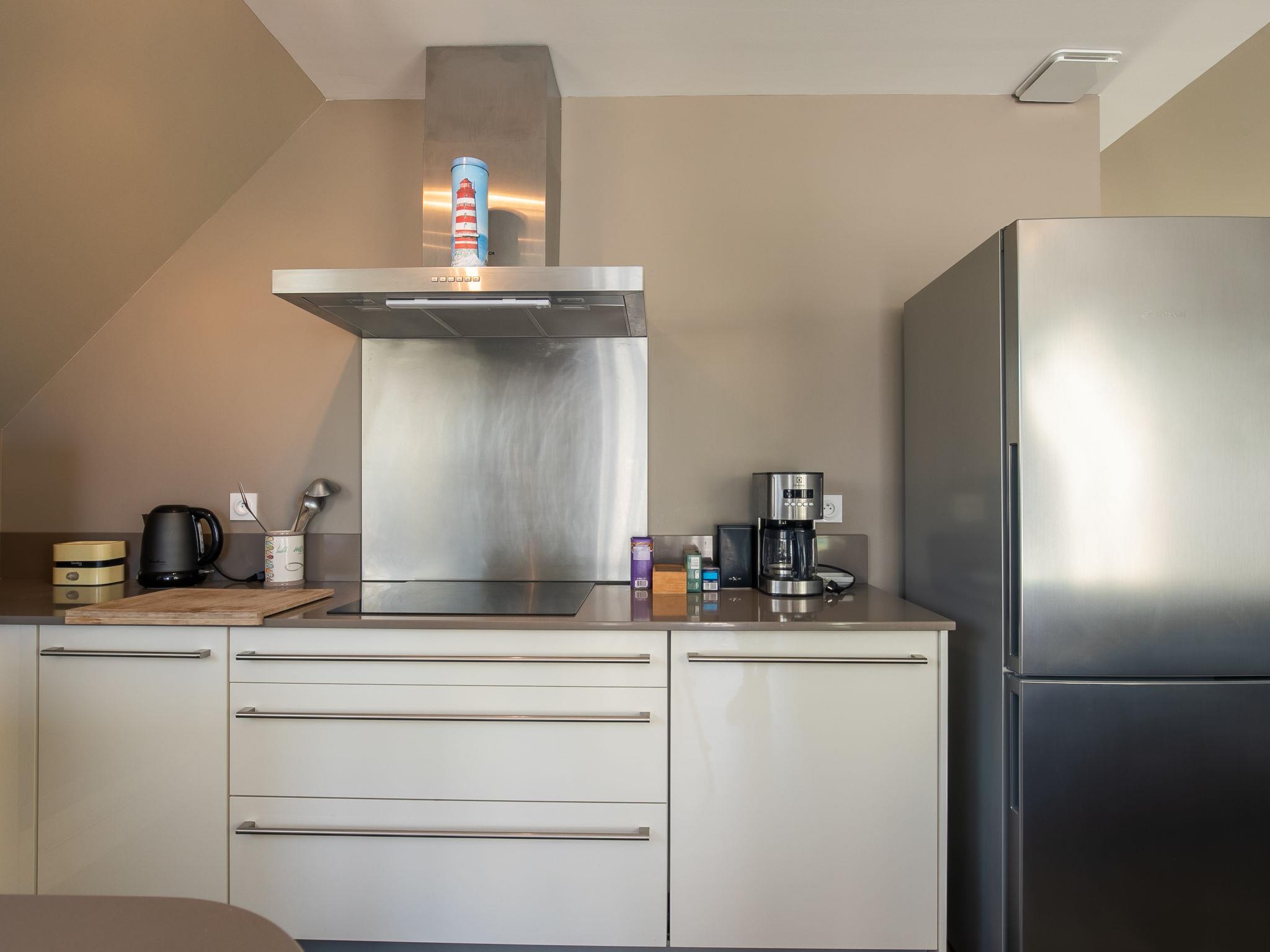 "Les Chardons Bleus 2", 4-Zimmer-Wohnung 90 m2, im Obergeschoss. Komfortabel und geschmackvoll eingerichtet: abgeschrägtes Wohn-/Esszimmer mit Esstisch und Sat-TV (Flachbildschirm). Ausgang zum Garten, zum Balkon. 1 abgeschrägtes Zimmer mit 1 franz. Bett (160 cm). 1 abgeschrägtes Zimmer mit 2 Betten. Offene Küche (Backofen, Geschirrspüler, 3 Induktionskochplatten, Toaster, Wasserkocher, Mikrowelle, Tiefkühler, elektrische Kaffeemaschine). Dusche, sep. WC, Doppelwaschbecken. E-Heizung. Grosser Balkon 30 m2, Rasen 300 m2. Balkonmöbel, Gartengrill (mobil), Liegestühle (3). Seitliche Sicht auf das Meer. Zur Verfügung: Waschmaschine, Bügeleisen. Internet (WLAN, gratis). Bitte beachten: Nichtraucher-Unterkunft. Eigener Eingang, Rauchmelder. Zusätzlich buchbar: Zimmer bis zu 2 Personen mit Bett 1,60m x 2,00m und privater Dusche/WC, siehe Nebenkosten.
