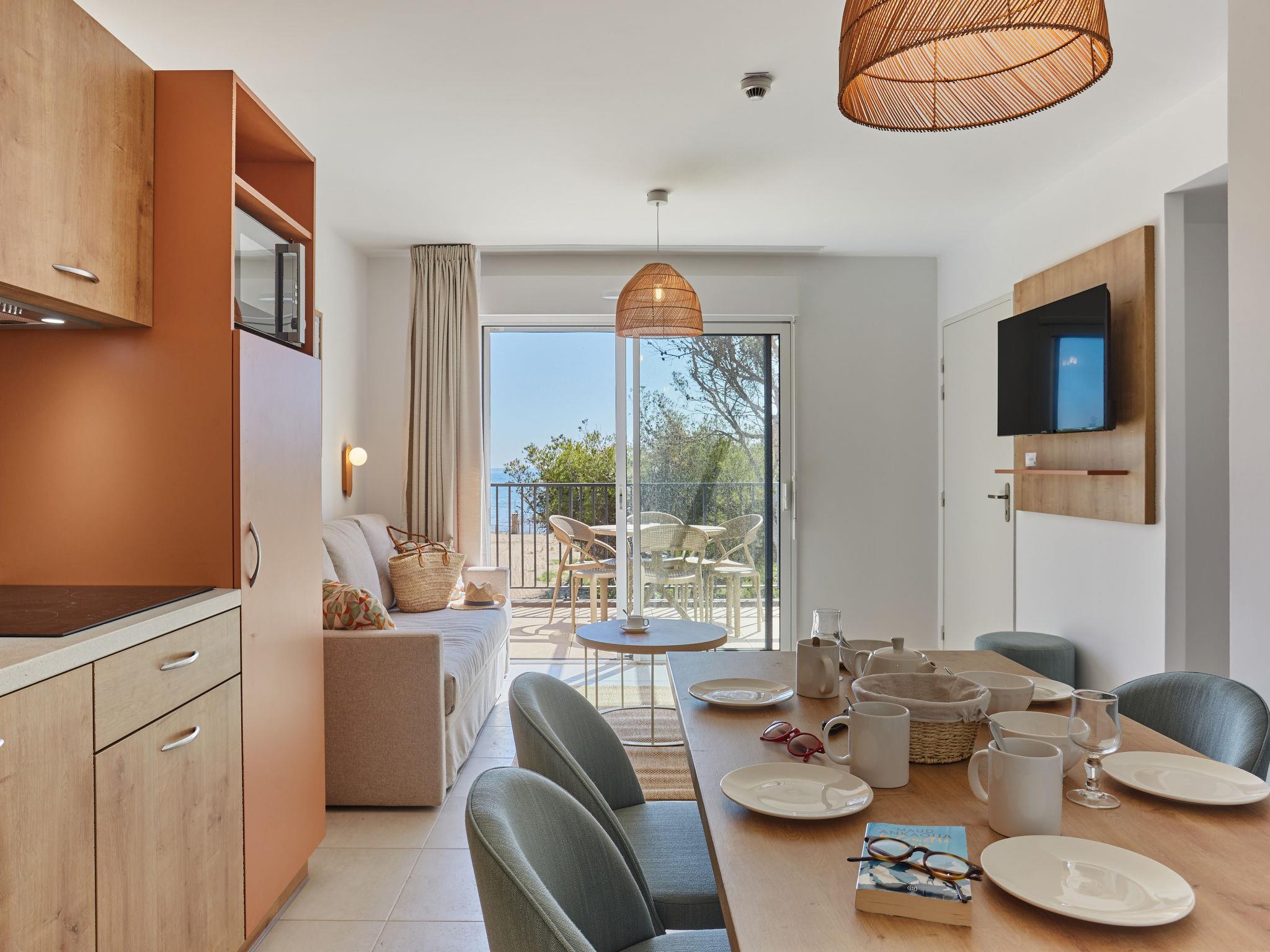 "Résidence Odalys Collection Riviera", 2-Zimmer-Wohnung 39 m2. Modern eingerichtet: Wohn-/Schlafzimmer mit 2 Schlafmöglichkeiten, Esstisch und TV (Flachbildschirm). Ausgang zum Balkon, zur Terrasse. 1 Zimmer mit 1 franz. Bett (1 x 160 cm, Länge 200 cm). Kabine mit 2 Schlafmöglichkeiten. Kleine, offene Küche (Geschirrspüler, 4 Glaskeramikplatten, Toaster, Wasserkocher, elektrische Kaffeemaschine, Kapseln für die Kaffeemaschine (Capsules), Kombinationsmikrowelle). Sep. WC, Bad oder Dusche. E-Heizung. Balkon oder Terrasse. Terrassenmöbel. Zur Verfügung: Kinderhochstuhl, Babybett. Internet (WLAN, gratis). Parkplatz. Bitte beachten: Nichtraucher-Unterkunft. Maximal 1 Haustier/Hund erlaubt. Rauchmelder, Feuerlöscher.