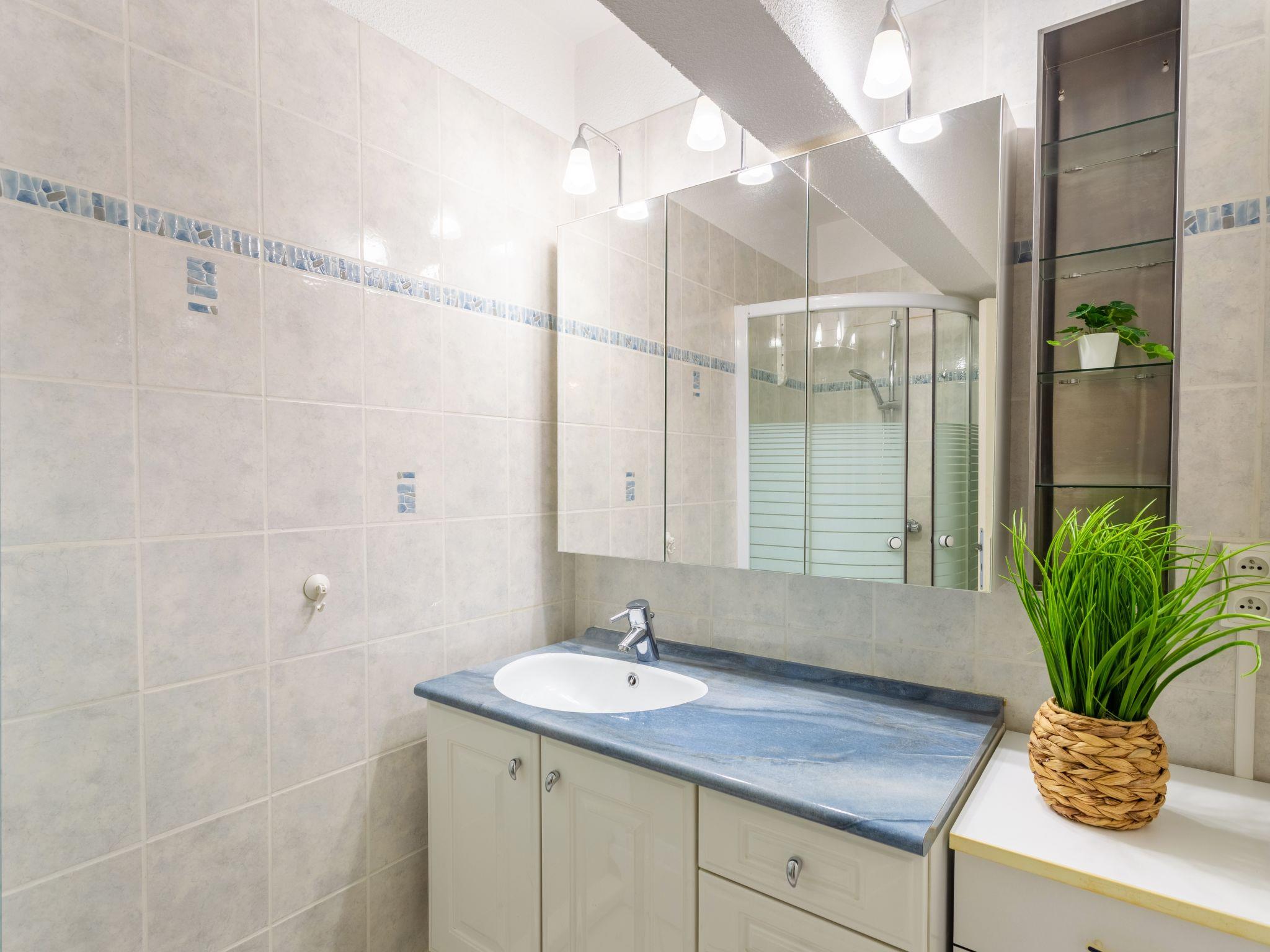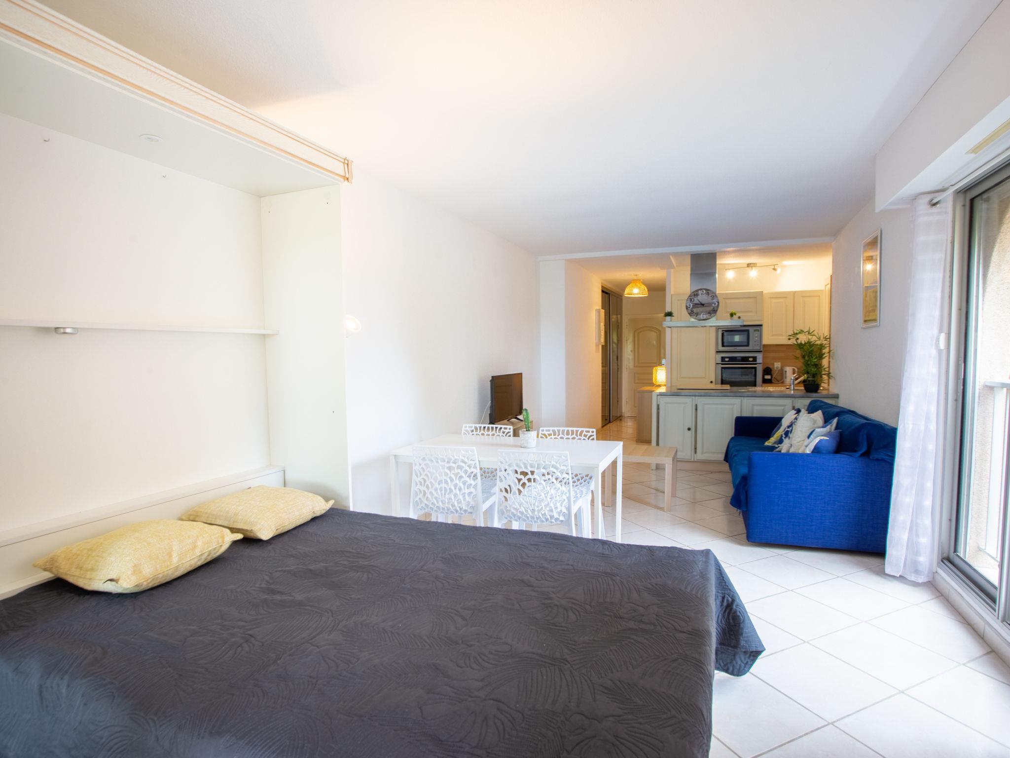 1-Zimmer-Studio 39 m2 im 1. Stock. Geräumig und hell, vollständig renoviert im Jahre 2021, schön und modern eingerichtet: Wohn-/Esszimmer mit 1 Doppelwandklappbett (140 cm, Länge 190 cm), TV (Flachbildschirm). Ausgang zum Balkon. Kochnische (Backofen, Geschirrspüler, 4 Induktionskochplatten, Toaster, Wasserkocher, Mikrowelle, Tiefkühler, elektrische Kaffeemaschine, Kapseln für die Kaffeemaschine (Expresso) extra) mit Esstisch. Dusche, sep. WC. Klimaanlage, Warmluftheizung. Balkon 7 m2. Balkonmöbel. Sicht auf. Zur Verfügung: Waschmaschine, Wäschetrockner. Internet (WLAN, extra). Parkplatz Nr. 848 environ 400 M. Bitte beachten: TV nur FR. Rauchmelder.