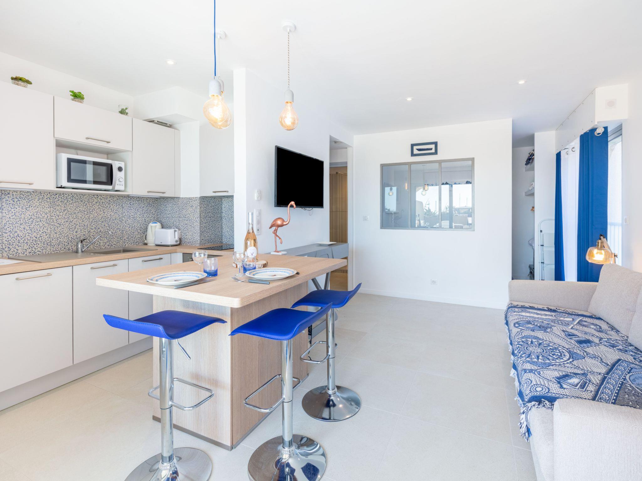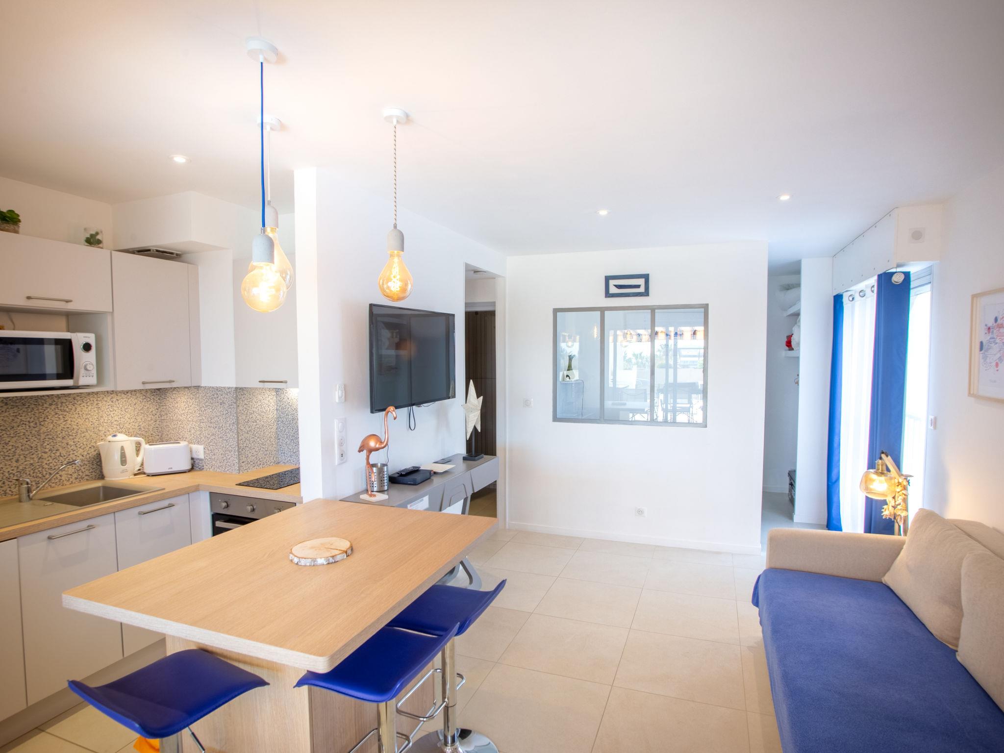 1-Zimmer-Studio 30 m2 im 1. Stock. Objekt geeignet für 2 Erwachsene. Vollständig renoviert im Jahre 2022, schön und modern eingerichtet: Kabine mit 1 franz. Bett (160 cm, Länge 200 cm). Wohnküche (Backofen, Geschirrspüler, 2 Induktionskochplatten, Toaster, Wasserkocher, Mikrowelle, Tiefkühler, elektrische Kaffeemaschine, Kapseln für die Kaffeemaschine (Nespresso) extra) mit TV (Flachbildschirm). Ausgang zur Terrasse. Dusche, sep. WC. E-Heizung, Klimaanlage. Terrasse 50 m2. Terrassenmöbel, Liegestühle (2). Sehr schöne Sicht auf den Hafen. Zur Verfügung: Waschmaschine, Wäschetrockner, Bügeleisen, Haartrockner. Internet (WLAN, gratis). Parkplatz Nr. 840 environ 550 M. Bitte beachten: TV nur FR. Anstelle eines abgeschlossenen Schlafzimmers befinden sich manche Schlafplätze in einem offenen Bereich (Galerie, Nische etc.). Inserat einer Privatperson nach Artikel 155, IV, CGI.