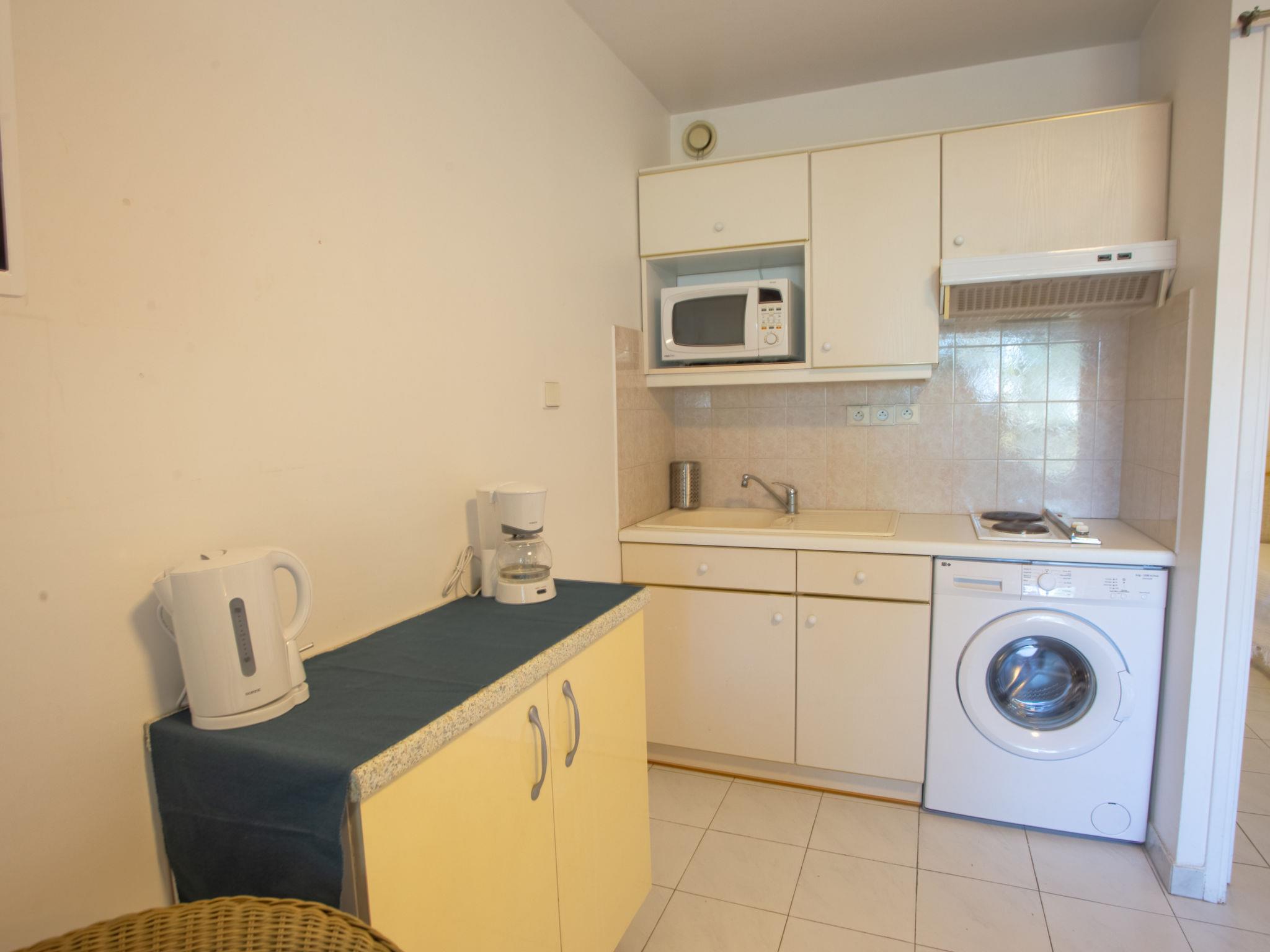 1-Zimmer-Studio 23 m2 im 1. Stock. Hell, komfortabel und schön eingerichtet: Wohn-/Esszimmer mit 1 Doppeldiwanbett (160 cm, Länge 190 cm), TV (Flachbildschirm). Ausgang zur Loggia. Eingang mit 1 Bett (90 cm, Länge 190 cm). Offene Küche (2 Glaskeramikplatten, Toaster, Wasserkocher, Mikrowelle, Tiefkühler, elektrische Kaffeemaschine). Ausgang zur Loggia. Bad, sep. WC. Klimaanlage. Balkonmöbel, Loggia. Eingeschränkte Sicht auf das Meer. Zur Verfügung: Waschmaschine. Internet (WLAN, extra). Parkplatz Nr. 69. Bitte beachten: TV nur FR. Rauchmelder. Inserat einer Privatperson nach Artikel 155, IV, CGI.
