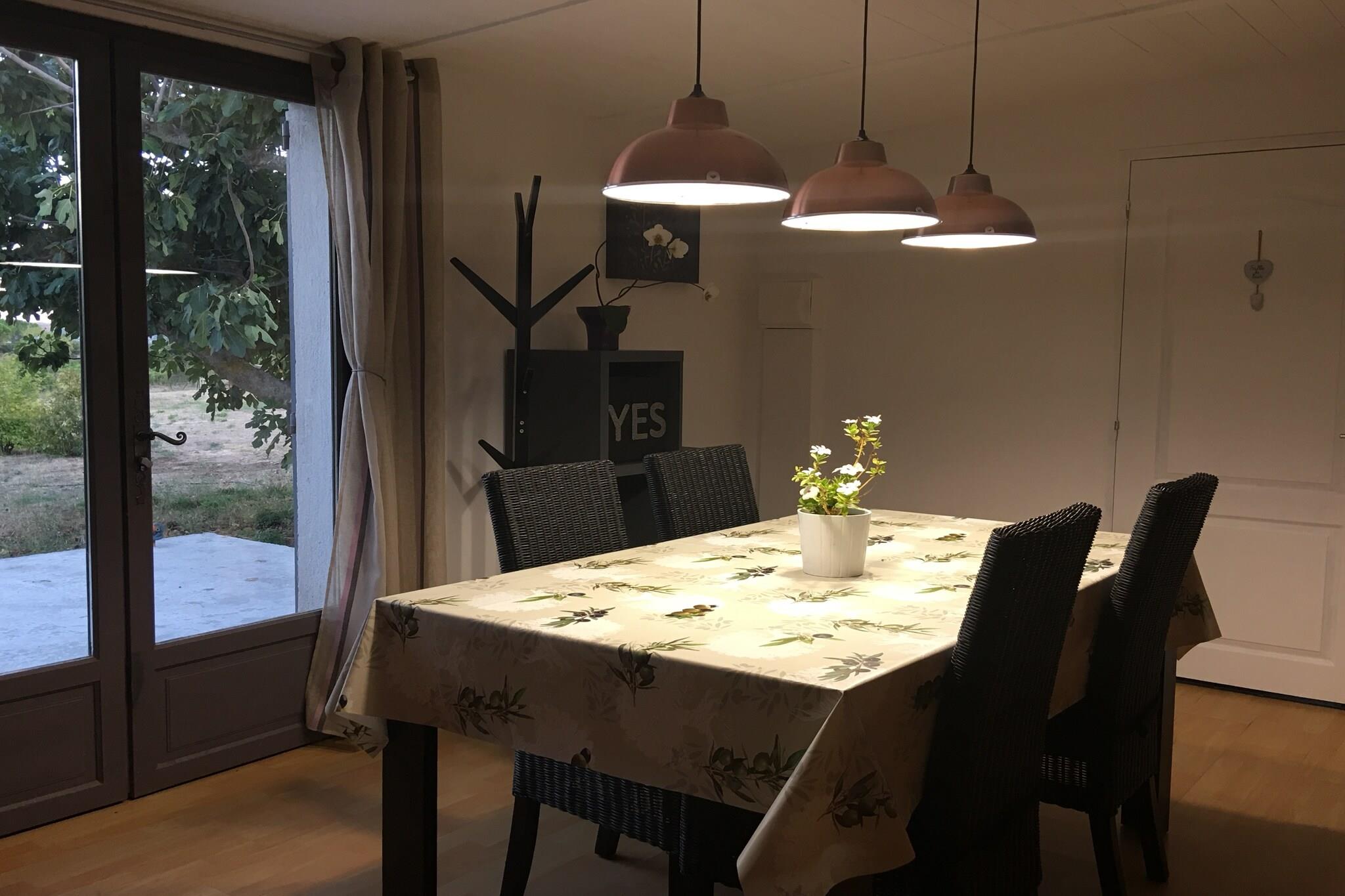 Parterre: (offene Küche(Kochplatte, Wasserkocher, Toaster, Dunstabzugshaube, Kaffeemaschine, Backofen, Mikrowelle, Kühl-/Gefrierkombination, Waschmaschine), Wohn/Esszimmer(Doppelschlafcouch(140 x 190 cm), TV(Flatscreen, internationale TV-Kanäle), Esstisch(4 Personen), Sitzecke, Klimaanlage), Schlafzimmer(Doppelbett king size(160 x 200 cm)), Badezimmer(Dusche(Kabine), Waschbecken, Toilette, Föhn), Bügelbrett, Bügeleisen) Esstisch(4 Personen), Terrasse(alleinige Nutzung, 30 m2), Garten(umzäunt, illuminiert, 6000 m2), Gartenmöbel, Liegen, Grill, Pool(alleinige Nutzung, 8 x 4 m., geöffnet von 1/2 Mai bis einschließlich Sep), Boulebahn, Wasser vom Brunnen