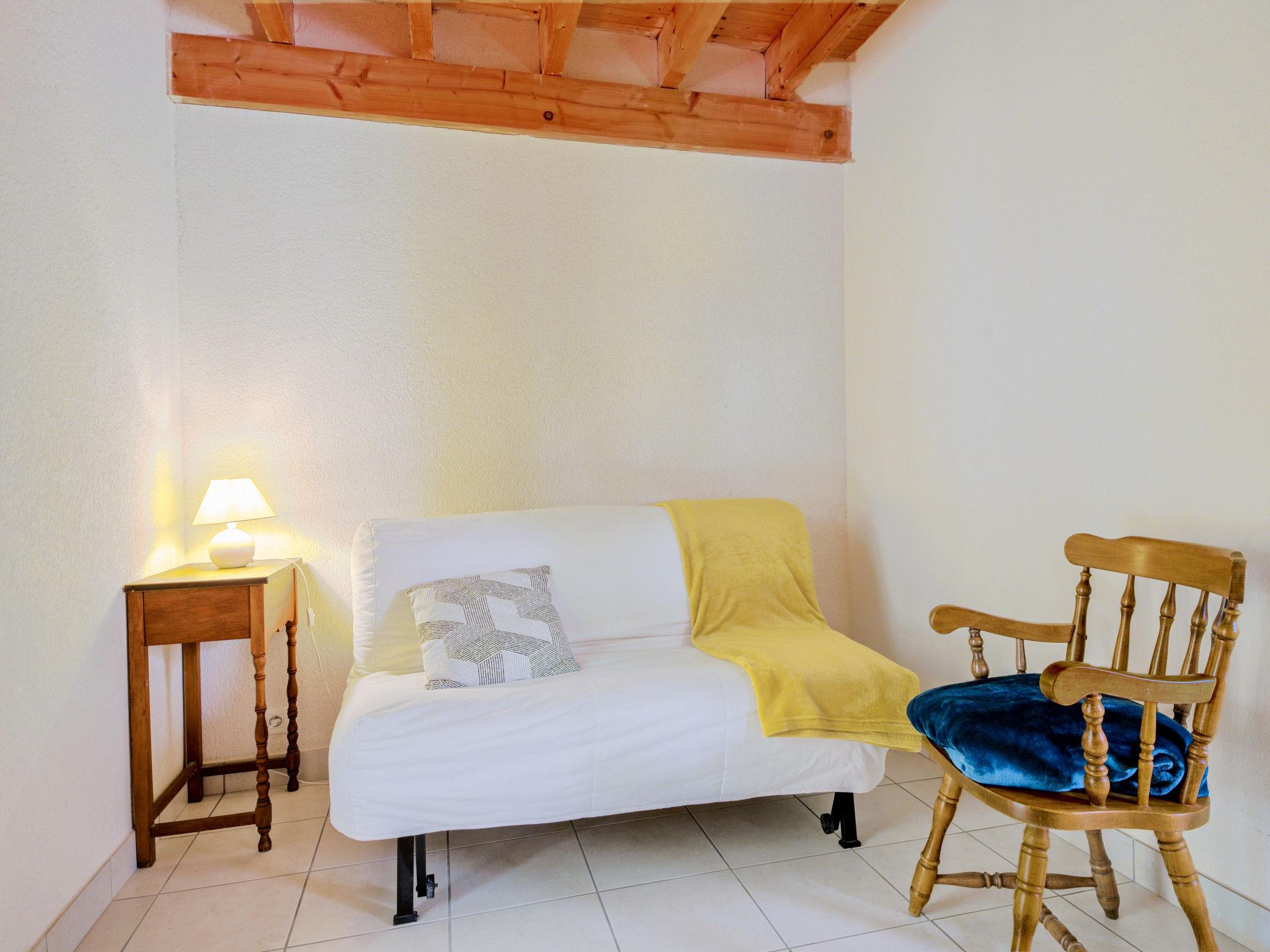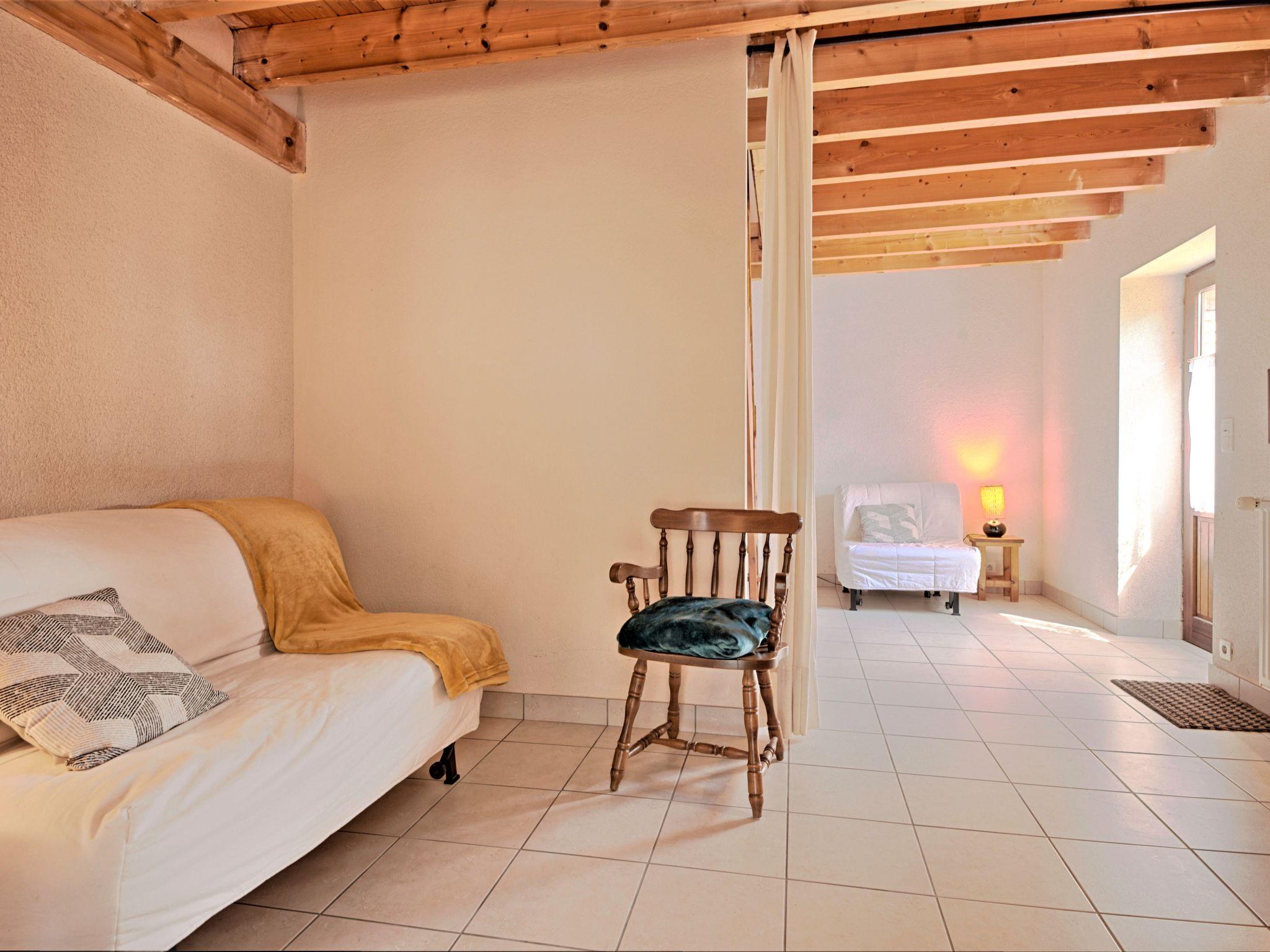 3-Zimmer-Haus 50 m2 auf 2 Stockwerken. Esszimmer mit Veranda mit Essecke, Küchenblock und TV (Flachbildschirm). Ausgang zum Garten. Wohn-/Schlafzimmer mit 1 Diwanbett (80 cm, Länge 190 cm), 1 Doppeldiwanbett (140 cm, Länge 190 cm), Stereoanlage. Ausgang zum Garten. Kochnische (Backofen, Geschirrspüler, 4 Glaskeramikplatten, Toaster, Mikrowelle, elektrische Kaffeemaschine). Dusche, sep. WC. Obergeschoss: 1 abgeschrägtes, offenes Zimmer, Deckenhöhe 50 - 350 cm mit Dachfenster mit 1 Diwanbett (80 cm, Länge 190 cm), 1 franz. Bett (140 cm, Länge 190 cm). G-Heizung. Terrassenmöbel. Zur Verfügung: Waschmaschine, Wäschetrockner. Internet (Wireless LAN, gratis). Bitte beachten: Nichtraucher-Unterkunft. Die 80 cm breiten Betten sind Sesselbetten. Die Waschmaschine und der Tumbler befinden sich in einem separaten kleinen Gebäude, das ausserdem mit einer Dusche und einem WC ausgestattet ist. Es ist möglich, den Halb-Flügel "Baldwin" zu benützen, der sich im Haus des Eigentümers befindet (nur für Pianisten mit Erfahrung zugelassen). 44049000143EF