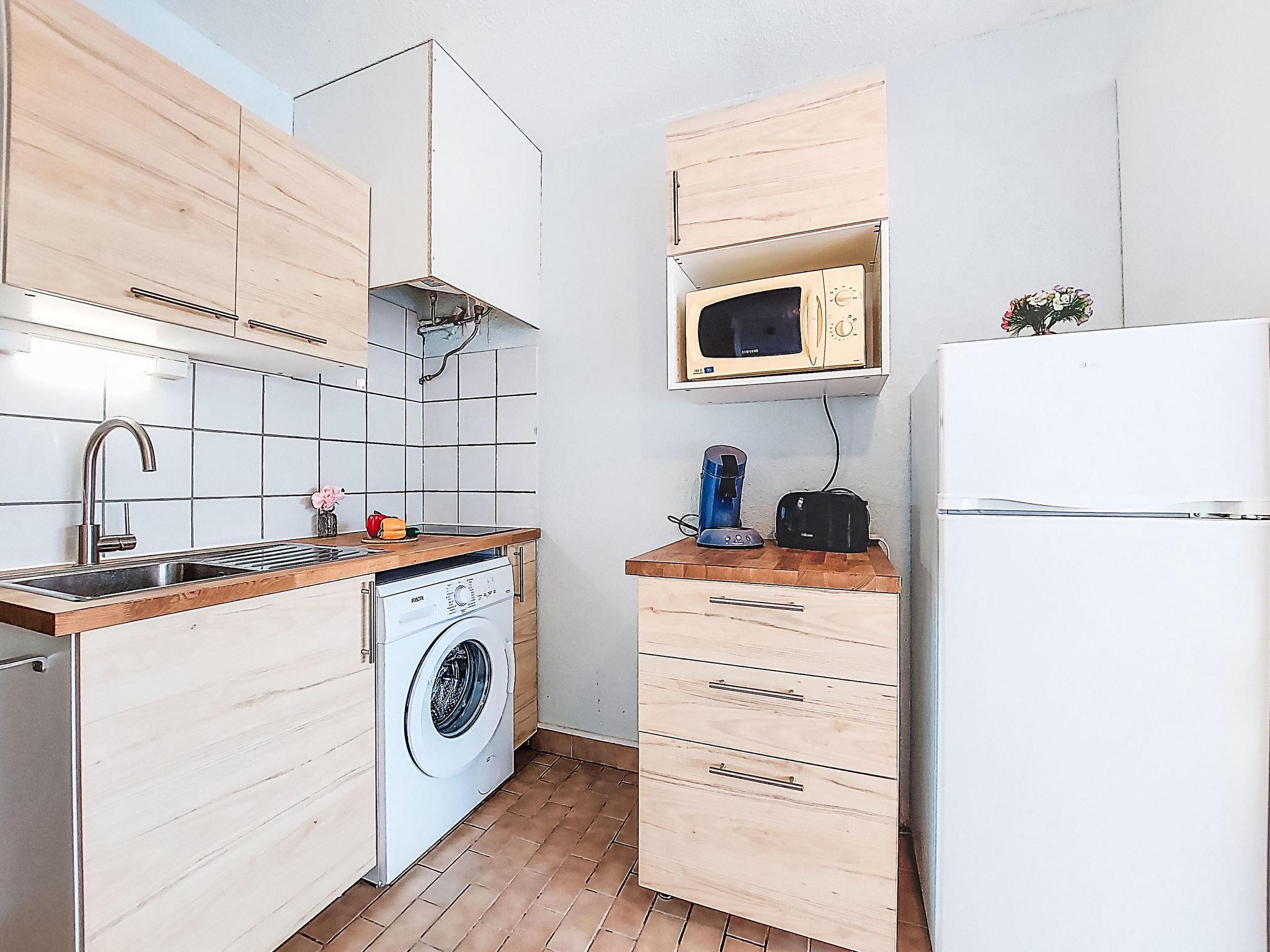 1-Zimmer-Studio 23 m2 im 1. Stock. Wohn-/Esszimmer mit 1 Doppeldiwanbett (140 cm, Länge 190 cm), TV (Flachbildschirm). Kabine mit 1 x 2 Etagenbetten (90 cm, Länge 190 cm). Kochnische (2 Induktionskochplatten, Toaster, Wasserkocher, Mikrowelle, elektrische Kaffeemaschine, Kapseln für die Kaffeemaschine (senseo) extra). Bad/WC. Heizung. Terrasse 6 m2. Terrassenmöbel, Loggia. Zur Verfügung: Waschmaschine. Internet (Wireless LAN, extra). Parkplatz Nr. 90. Bitte beachten: Rauchmelder. Anstelle eines abgeschlossenen Schlafzimmers befinden sich manche Schlafplätze in einem offenen Bereich (Galerie, Nische etc.). 30133000969E9