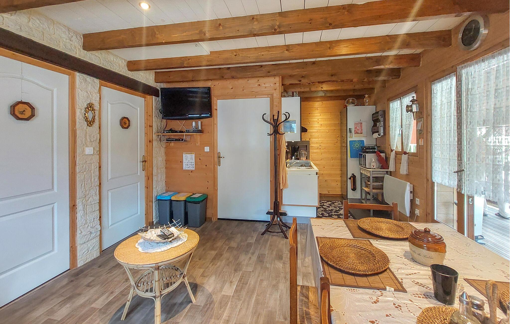 Dieses charmante Haus am Waldrand bietet Ihnen eine einladende Atmosphäre mit rustikaler Einrichtung, die das Gefühl von Gemütlichkeit verstärkt. Der offene Wohnbereich mit großen Fenstern lässt viel Tageslicht herein und verbindet Innenräume harmonisch mit der umgebenden Natur.