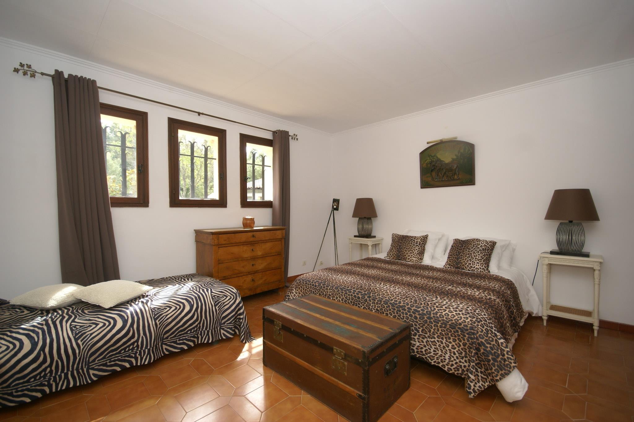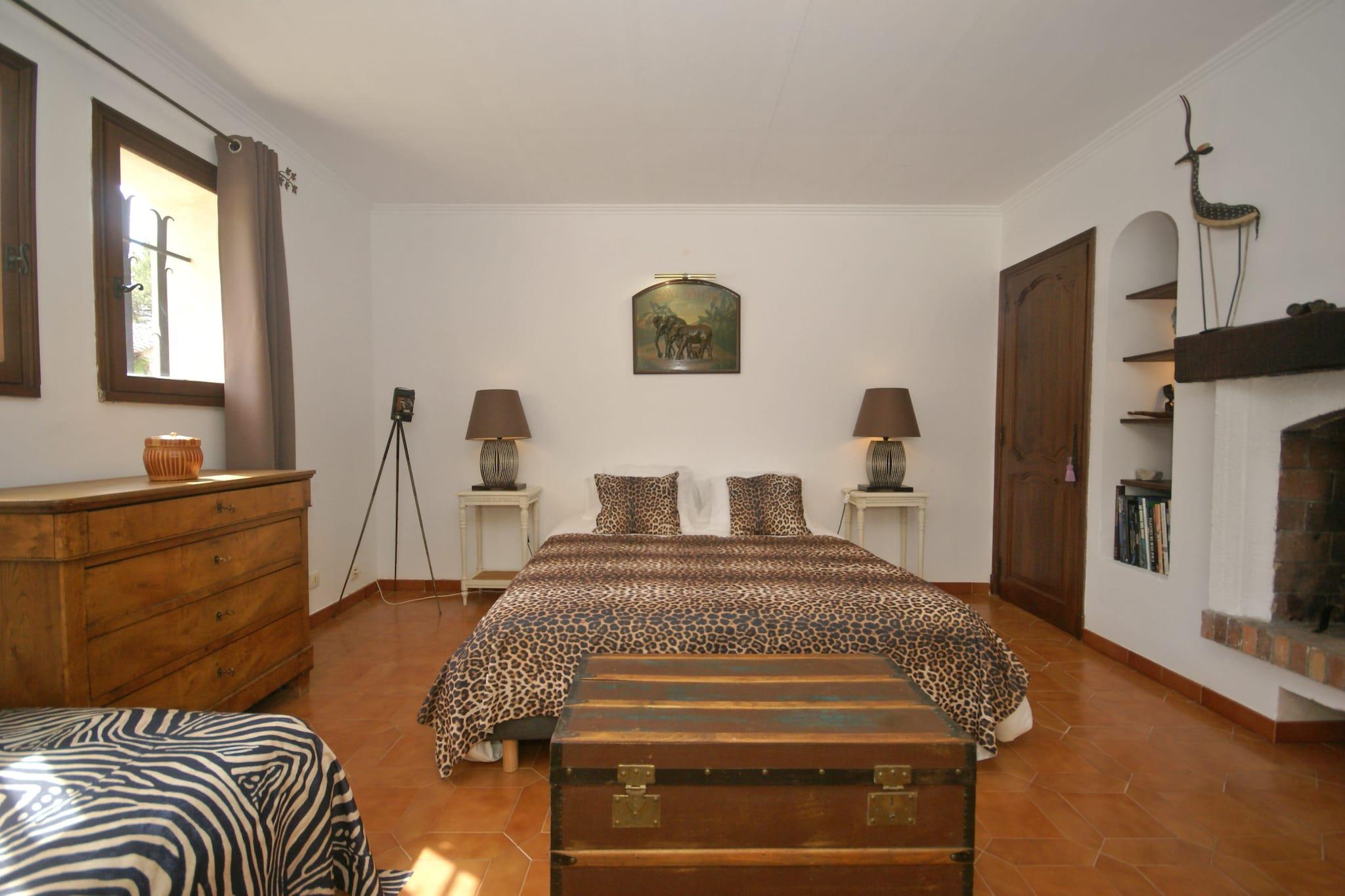 Dies ist eine geräumige Villa mit einem großen Pool und einem großen, umzäunten Garten. Mit 4 Schlafzimmern und 3 Bädern ist die Villa groß genug für 8 Personen. Sie finden auch eine schöne Außenküche mit Grill, eine überdachte Terrasse und einen beheizten Whirlpool. Die Villa liegt im Wald zwischen dem provenzalischen Dorf le Muy und dem Badeort Sainte-Maxime (18 km). Sainte-Maxime ist ein lebhafter Badeort mit schönen Geschäften, einem Strand und Terrassen. Jeden Sonntag und Donnerstag findet in Le Muy ein großer provenzalischer Markt statt. In der Umgebung finden Sie mehrere 18-Loch-Golfplätze. Die Eigentümer wohnen im Keller auf der Rückseite der Villa, mit eigenem Eingang und ohne direkten Blick. Auf Wunsch erzählen sie Ihnen von der schönen Umgebung. Da der Pool nur durch einen Alarm geschützt ist, wird von Kindern, die nicht schwimmen können, dringend abgeraten. Bei der Ankunft unterzeichnen alle Familien mit Kindern eine Verantwortungserklärung für mögliche Unfälle im Zusammenhang mit dem Pool.