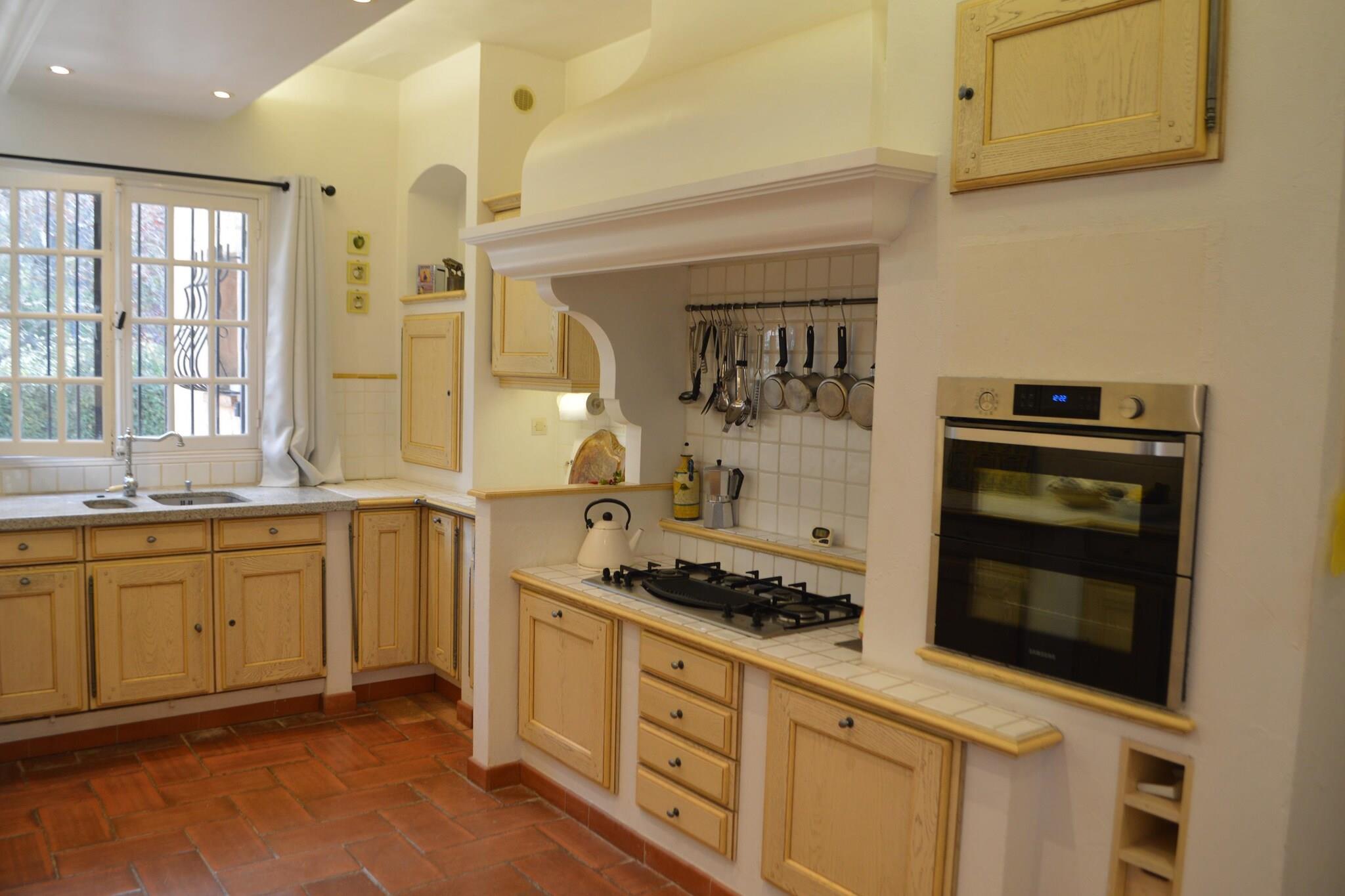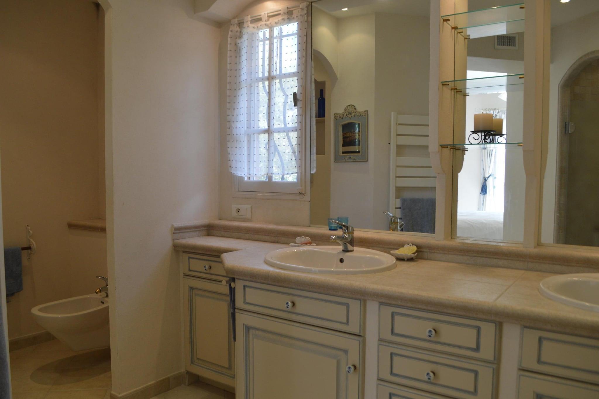 Parterre: (Küche(Kochherd(4 Kochplatten, Gas), Kaffeemaschine(Filter), Backofen, Mikrowelle, Spülmaschine), Wohn/Esszimmer(Esstisch, Sitzecke), Schlafzimmer mit Badezimmer(Doppelbett(180 x 200 cm), Dusche, Waschbecken, Toilette, Bidet, Klimaanlage), Wirtschaftsraum(Kühl-/Gefrierkombination, Trockner, Waschmaschine)) In der 1. Etage: (Schlafzimmer(Einzelbett(80 x 200 cm), Einzelbett(80 x 200 cm)), Schlafzimmer mit Badezimmer(Doppelbett(180 x 200 cm), Dusche, Waschbecken, Toilette), Schlafzimmer mit Badezimmer(Doppelbett(180 x 200 cm), Dusche, Waschbecken, Toilette, Bidet), Badezimmer(Badewanne, Waschbecken), Toilette(Toilette)) Außenküche, kabelloses Musiksystem, Grill, Dusche(im Garten), Terrasse, Gartenmöbel, Liegen, Grill(elektrisch), Parkplatz, Pool(alleinige Nutzung, 14 x 10 m.), Boulebahn