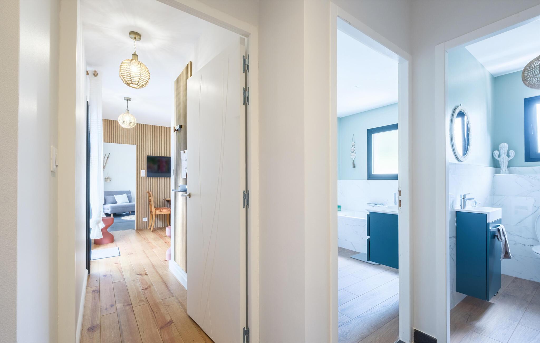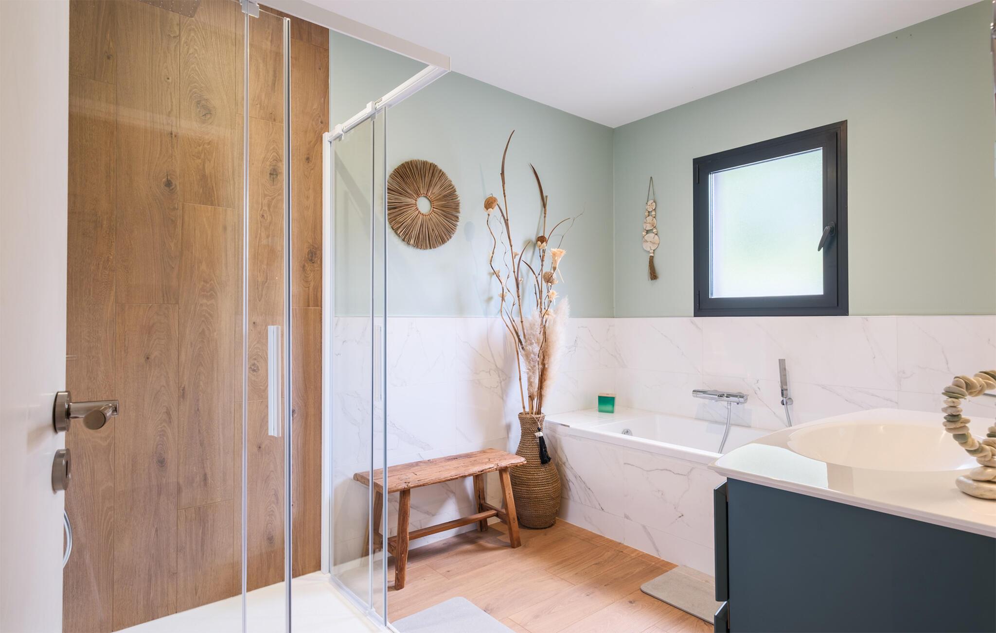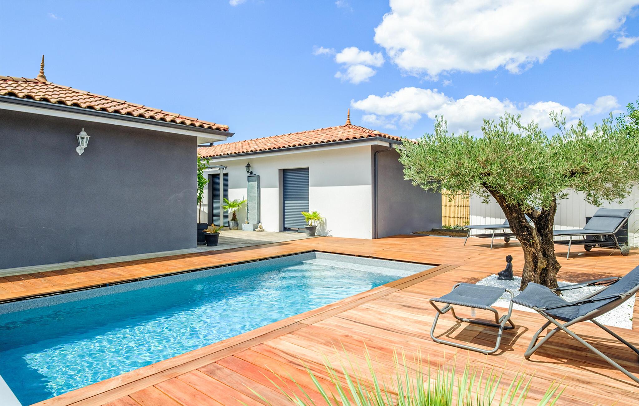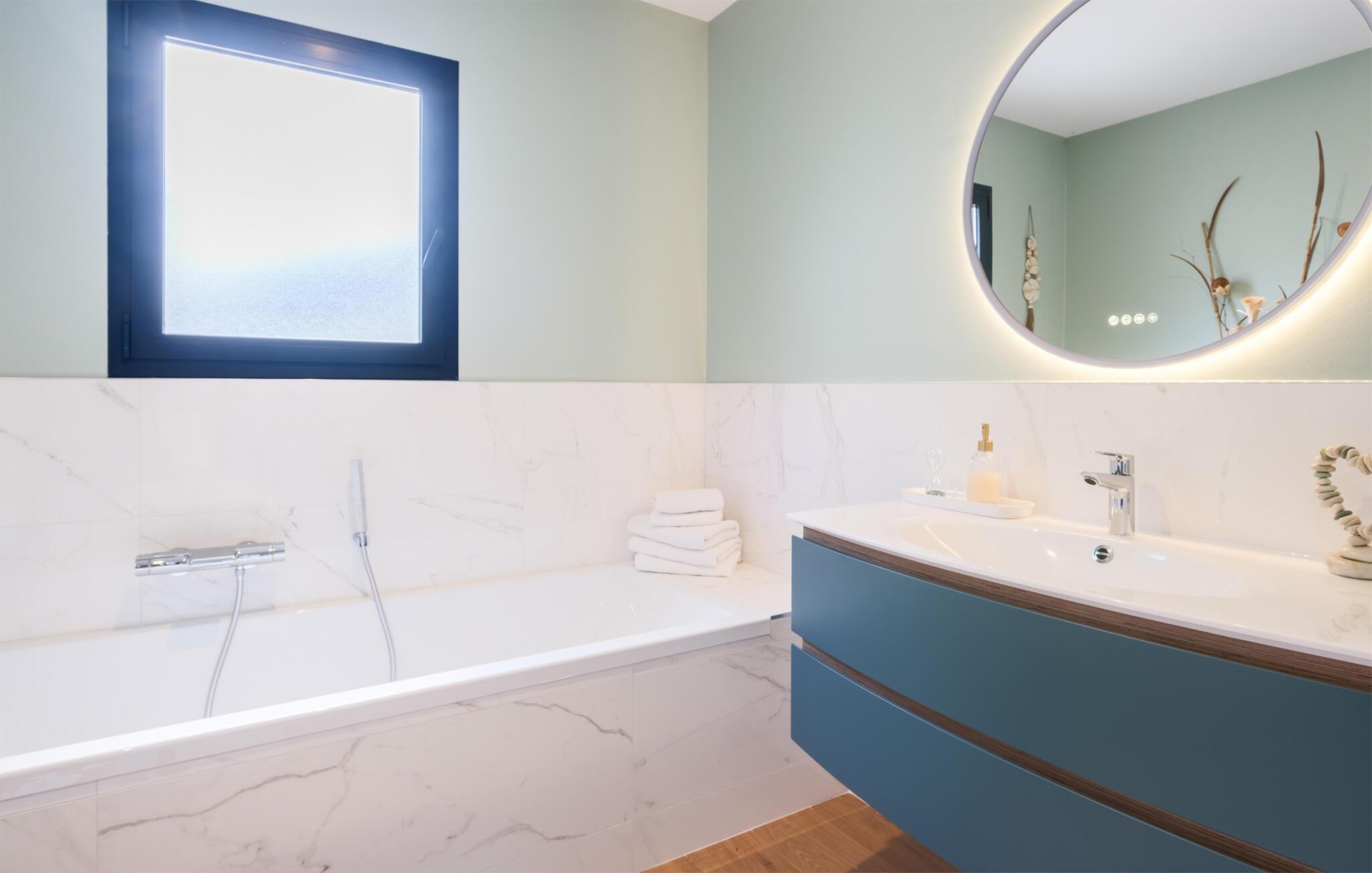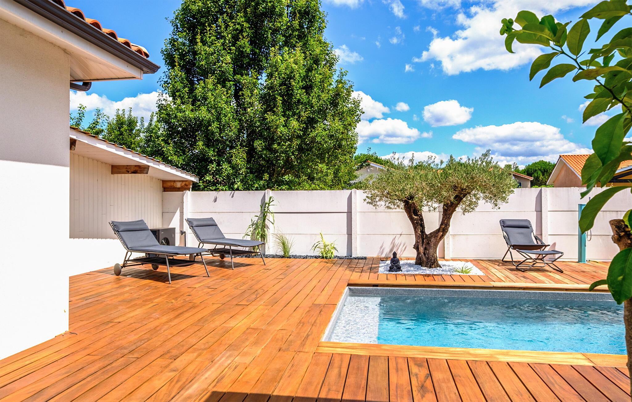 Der elegante Außenbereich rund um die ebenerdige Villa lockt mit einladenden Plätzen zum Speisen und Genießen der friedlichen Atmosphäre. Gönnen Sie sich wohlige Momente im beheizten Salzwasserpool, plaudern Sie abends bei einem Glas Wein unter freiem Himmel oder bereiten Sie köstliche Mahlzeiten am Grill zu.