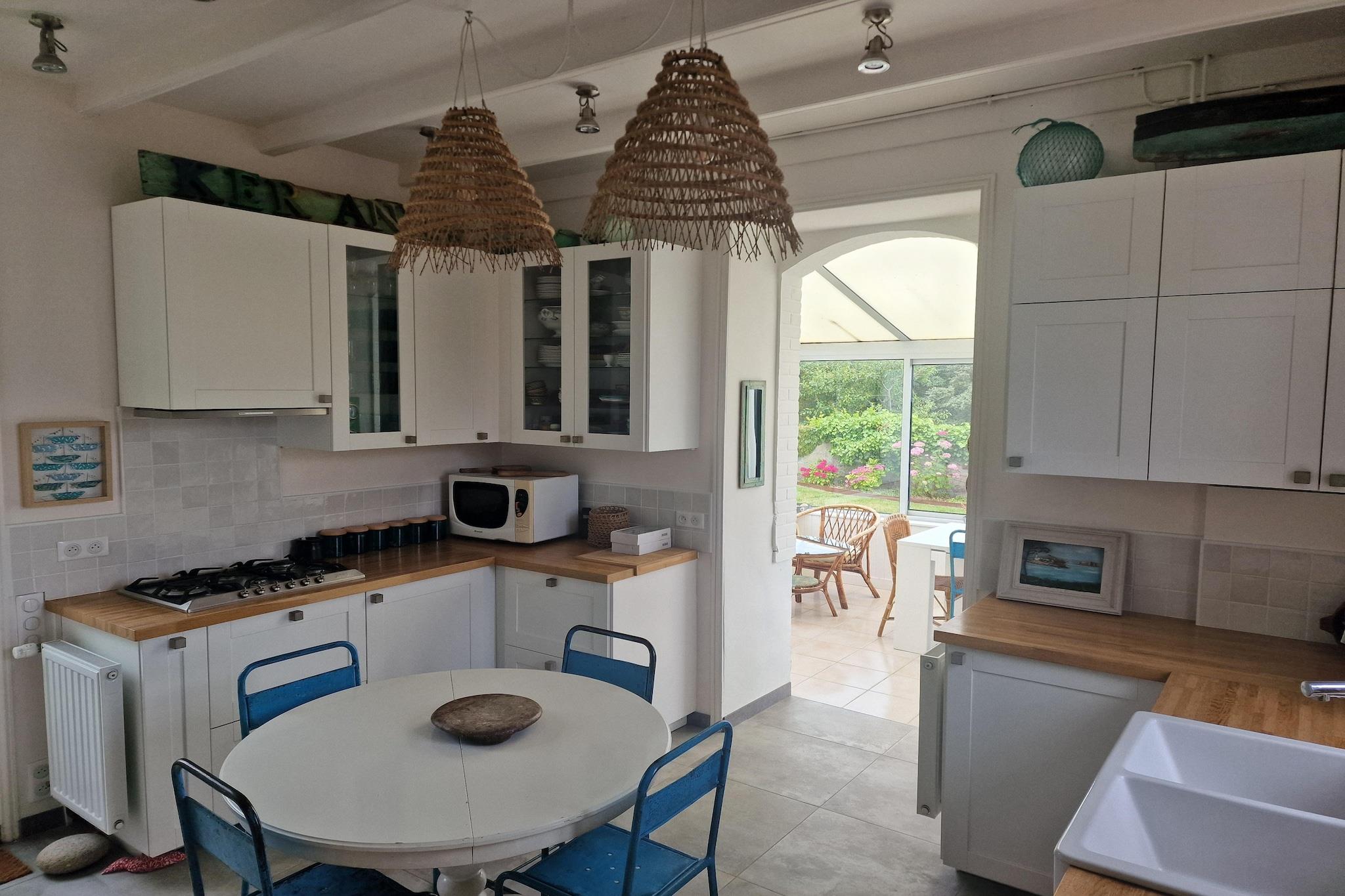 Nur knappe 200 m von einem wunderschönen Sandstrand entfernt, besticht dieses bretonische Ferienhaus durch sein besonderes Flair und wahren Premium Komfort. Die charmante Unterkunft bietet im Erdgeschoss gemütliche Wohnbereiche mit Kamin- und Fernsehecken, eine gut ausgestattete Küche und ein modernes Bad. Zwei verschiedene Treppenaufgänge führen zum Obergeschoss mit seinen drei großzügig angelegten Schlafzimmern und drei weiteren Bädern. Viel Platz und Intimsphäre für eine große Familie oder kleine Freundesgruppe. Das Esszimmer befindet sich in der hellen Veranda und bietet einen schönen Blick auf den grünen Garten, der zum Sonnen, Chillen und zu angenehmen Mahlzeiten im Freien einlädt. Das Ferienhaus befindet sich in ruhiger Lage im wie eine kleine Halbinsel angelegten Ortsteil Primel zwischen zwei schönen Stränden, Plage de Tregastel und Plage de Primel. Die für ihre 17 km wunderschöne Küste bekannte Gemeinde Plougasnou befindet sich im Grenzgebiet zwischen den Departments Finistère und Côtes d’Armor. In der nahen Umgebung zahlreiche attraktive Ausflugsziele so gen Westen entlang der Bucht von Morlaix zur Kur-und Hafenstadt Roscoff; nördlich lockt in knapp 30 Autominuten die fantastische Rosa Granitküste.