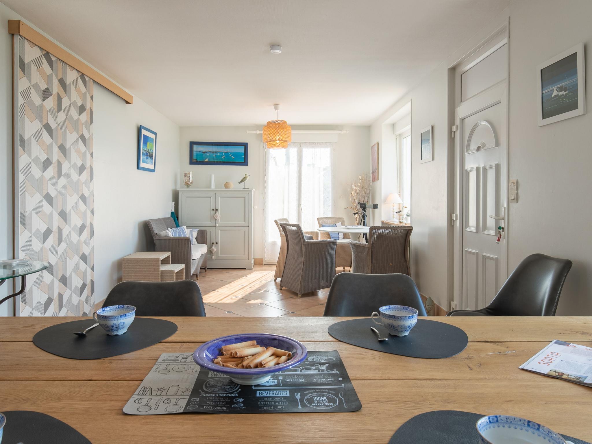 "L'Air du Large", 5-Zimmer-Haus 110 m2 auf 2 Stockwerken, im erhöhten Erdgeschoss, Nordwestlage. Geräumig und hell, schön und geschmackvoll eingerichtet: grosses Wohn-/Esszimmer mit Esstisch, Sat-TV, Internationale TV-Sender, Flachbildschirm, Radio und DVD. Ausgang zum Garten, zur Terrasse. Kleiner Salon. Kleine, offene Küche (Geschirrspüler, 3 Induktionskochplatten, Toaster, Wasserkocher, Mikrowelle, Tiefkühler, elektrische Kaffeemaschine). Sep. WC. Ölheizung. Obergeschoss: 1 Zimmer mit begehbarem Kleiderschrank mit 1 franz. Bett (160 cm, Länge 190 cm). 2 Zimmer, jedes Zimmer mit 1 franz. Bett (140 cm, Länge 190 cm). Dusche. Terrasse 32 m2, Nordwestlage und Südwestlage. Terrassenmöbel, Gartengrill (mobil), Liegestühle (4). Sehr schöne Panoramasicht auf das Meer. Zur Verfügung: Waschmaschine, Bügeleisen, Kinderhochstuhl, Babybett bis 2 Jahre. Internet (Wireless LAN, gratis). Bitte beachten: geeignet für Familien. Nichtraucher-Haus. Maximal 1 Haustier/Hund erlaubt. Rauchmelder.