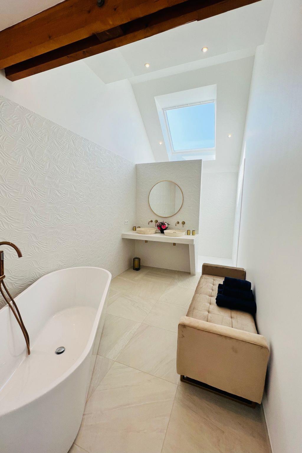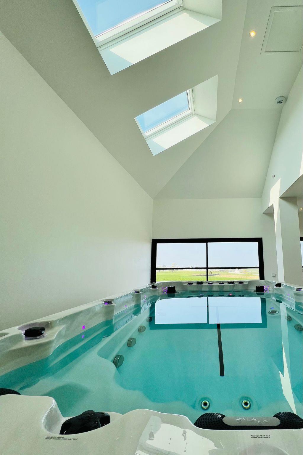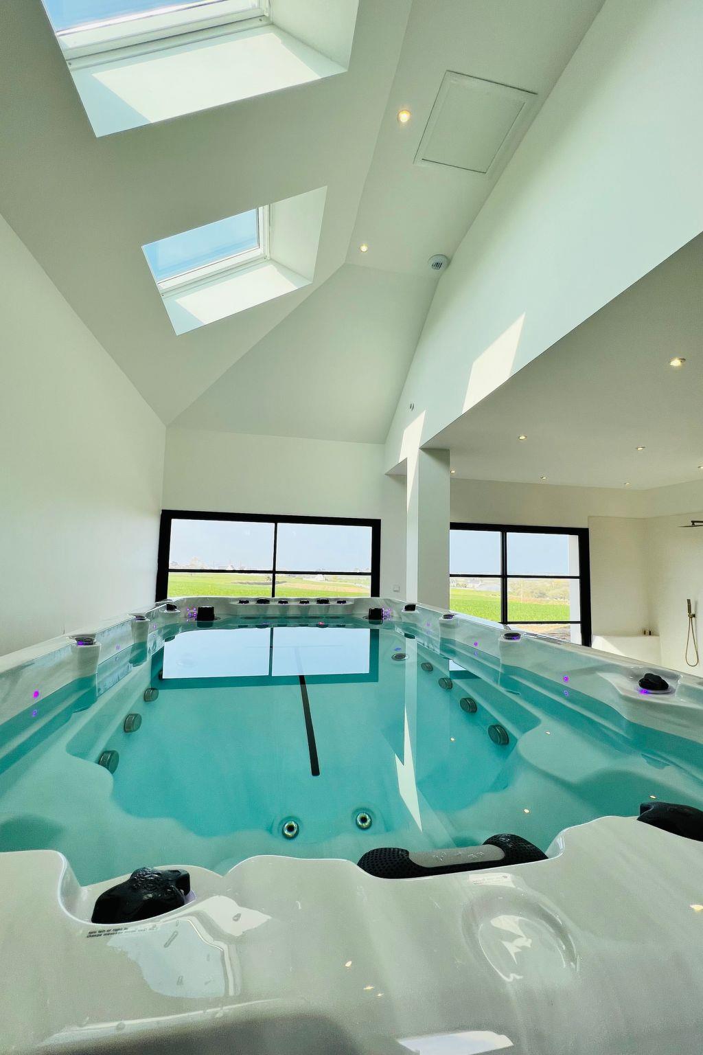 Urlaubsherzstück ist sicher der imposante Wellness Bereich mit großer Fensterfront und zusätzlichem Oberlicht- hier erholen Sie sich in der großen finnischen Sauna ( 5m² groß) oder dem Schwimm- Jacuzzi mit Gegenstromanlage für die Schwimmfans und Massagedüsen für die Wellnessliebhaber. Wir haben extra keinen Klassischen Swimming-Pool gewählt - sondern das große Jacuzzi Sport - und Wellnessgerät. Gleich um die Ecke befindet sich Ihre 30 m² Sonnen-Terrasse mit spezieller Außen-Dusche "von unten"; nicht nur für die Saunagänger. Natürlich gibt es dort eine moderne Gas-Plancha für Ihr leckeres Urlaubs-BBQ.