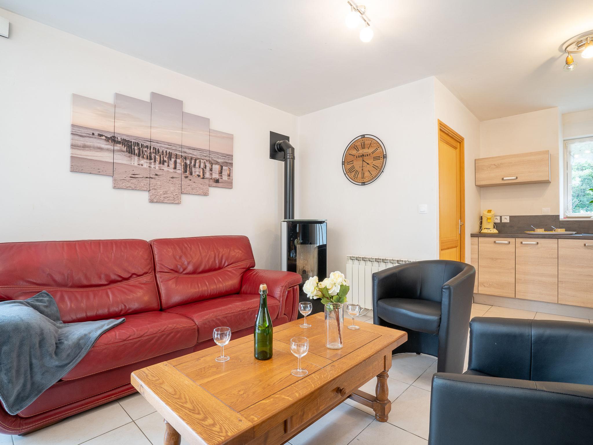 "Gîte des Perdrix", 4-Zimmer-Haus 80 m2 auf 2 Stockwerken. Schön und gemütlich eingerichtet: Wohn-/Esszimmer mit Esstisch, Sat-TV, DVD und Holzofen. Ausgang zur Terrasse. 1 Zimmer mit 1 franz. Bett (160 cm, Länge 200 cm), Dusche. Offene Küche (Backofen, Geschirrspüler, 4 Induktionskochplatten, Toaster, Wasserkocher, Mikrowelle, Tiefkühler, elektrische Kaffeemaschine, Racletteofen). Sep. WC. Obergeschoss: 1 abgeschrägtes Zimmer mit 1 franz. Bett (160 cm, Länge 200 cm). 1 abgeschrägtes Zimmer mit 2 Betten (90 cm, Länge 190 cm). Bad/WC. E-Heizung. Terrasse. Terrassenmöbel. Zur Verfügung: Waschmaschine, Kinderhochstuhl, Babybett, Haartrockner. Internet (WLAN, gratis). Bitte beachten: Nichtraucher-Haus. Maximal 1 Haustier/Hund erlaubt. Rauchmelder.