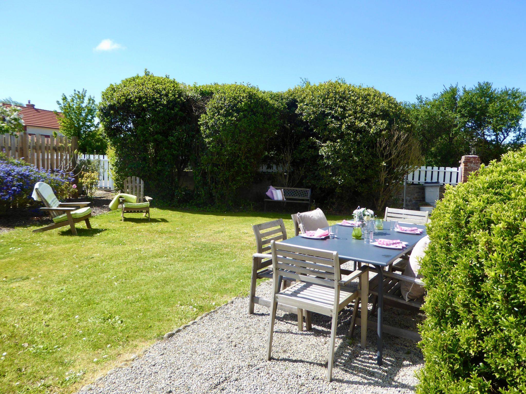 Vor dem Haus befinden sich ein Tisch und Stühle, an denen Sie sich entspannen und den Blick auf den Garten genießen können.