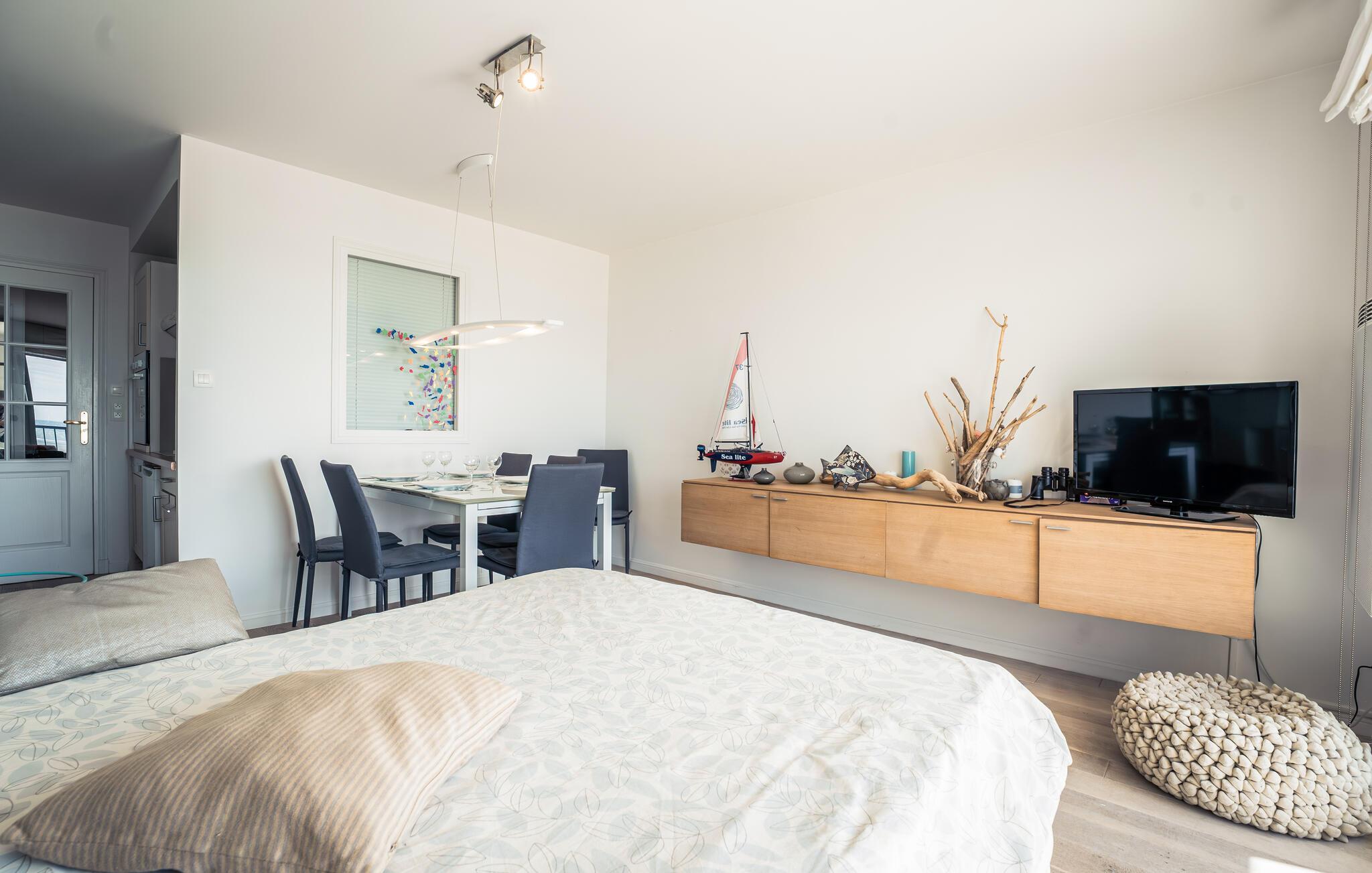 Erleben Sie entspannte Tage in dieser Ferienwohnung mit direktem Zugang zum Strand. Die Unterkunft liegt in einer charmanten Küstenstadt an der Côte d’Opale. Betreten Sie den hellen Wohnbereich und genießen Sie den freien Blick auf den Strand und das Meer. Nehmen Sie Platz auf dem bequemen Sofa, widmen Sie sich Ihrer Urlaubslektüre oder machen Sie es sich mit einem Film gemütlich. Der angrenzende Essbereich ist ideal für gemeinsame Mahlzeiten. Bereiten Sie Ihre Speisen in der kompakten Küche zu.