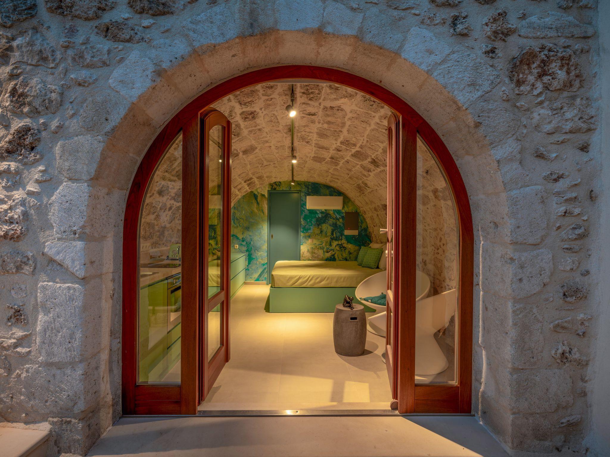 Unser Haus ist ein kleines altes Steinhaus in Form eines Gewölbes mit 1m dicken Steinwänden. Wir haben dieses Haus mit sehr viel Liebe zum Detail renoviert, wobei wir die Steinbauweise und die einmalige Architektur erhalten und mit modernen grün-blauen Farben kombiniert haben. Sämtliche Möbel sind handgemacht und Spezialanfertigungen für diese seltene Architektur. LG-Smart TV, SAT-TV, Internetverbindung runden den technischen Komfort dieses kleinen Hauses ab. Es ist ein freistehendes Haus für 2 Personen und stellt somit ein sehr seltenes Objekt dar, da die meisten Ferienhäuser auf Kreta über 3 und mehr Schlafzimmer verfügen. Ein Objekt für Paare, die ihre Zweisamkeit genießen möchten. Auf der Dachterrasse befindet sich ein beheizbarer Whirlpool, von dem man einen traumhaften Blick auf das Meer und die Weißen Berge genießen kann, Der Sonnenuntergang von hier Ist ein wahrer Traum! Ein kleiner Garten mit einer Terrasse rundet den Aussenbereich ab. Hier haben wir anstatt Palmen einen Bananen, Zitronen, Orangen- und Mandarinenbaum gepflanzt. Das Haus liegt in einer sehr ruhigen Gasse im Dorf Prines. Das Dorfzentrum ist nur 100m entfernt. Hier erwarten Sie drei Tavernen, ein kleines Lebensmittelgeschäft, eine Apotheke und die Bushaltestelle, von der man bequem die Stadt Rethymno in weniger als 10 Minuten erreichen kann.