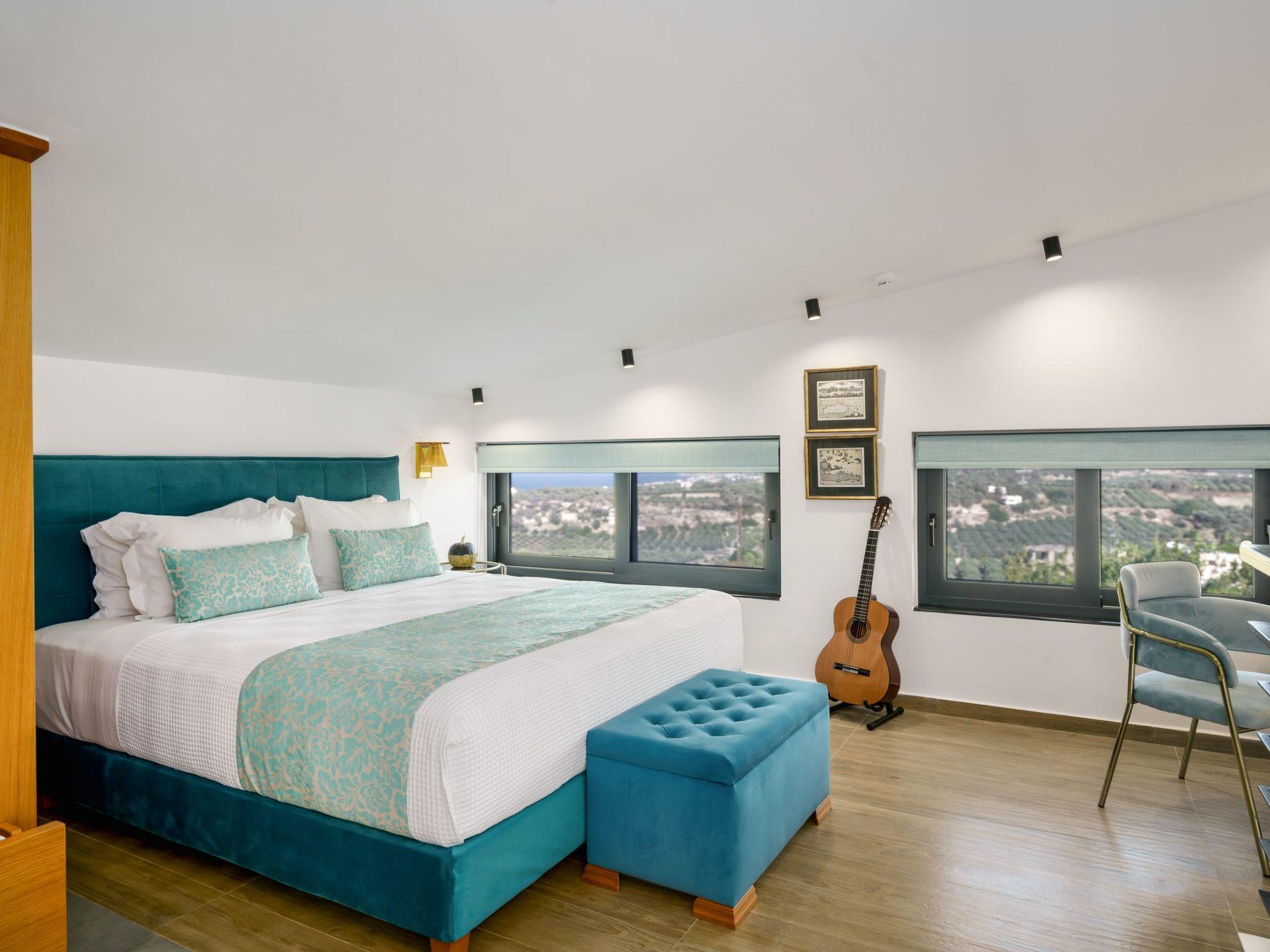 Das Schlafzimmer im Dachgeschoss bietet einen luxuriösen Rückzugsort mit Panoramablick auf das Kretische Meer und den Berg Psiloritis. Dieser besondere Raum verfügt über einen eigenen Arbeitsbereich (Schreibtisch), ein eigenes Bad und sogar eine Gitarre für kreative Momente.