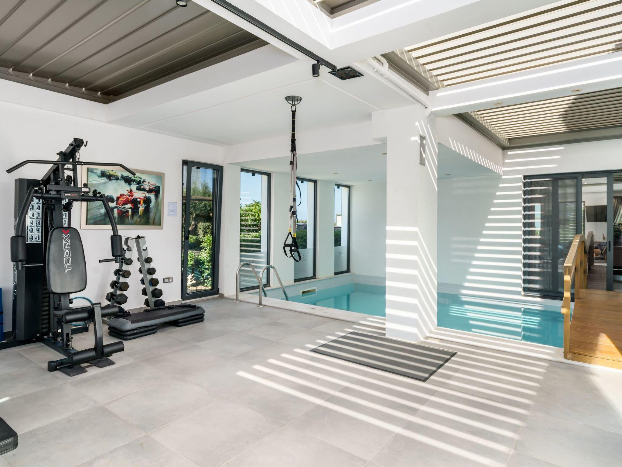 Perfekt für Familien oder Gruppen, bietet diese moderne Villa mit 4 Schlafzimmern einen Panoramablick auf das Meer und die Berge, einen privaten Infinity-Pool, einen beheizten Innenpool und luxuriöse Annehmlichkeiten sowohl im Innen- als auch im Außenbereich.