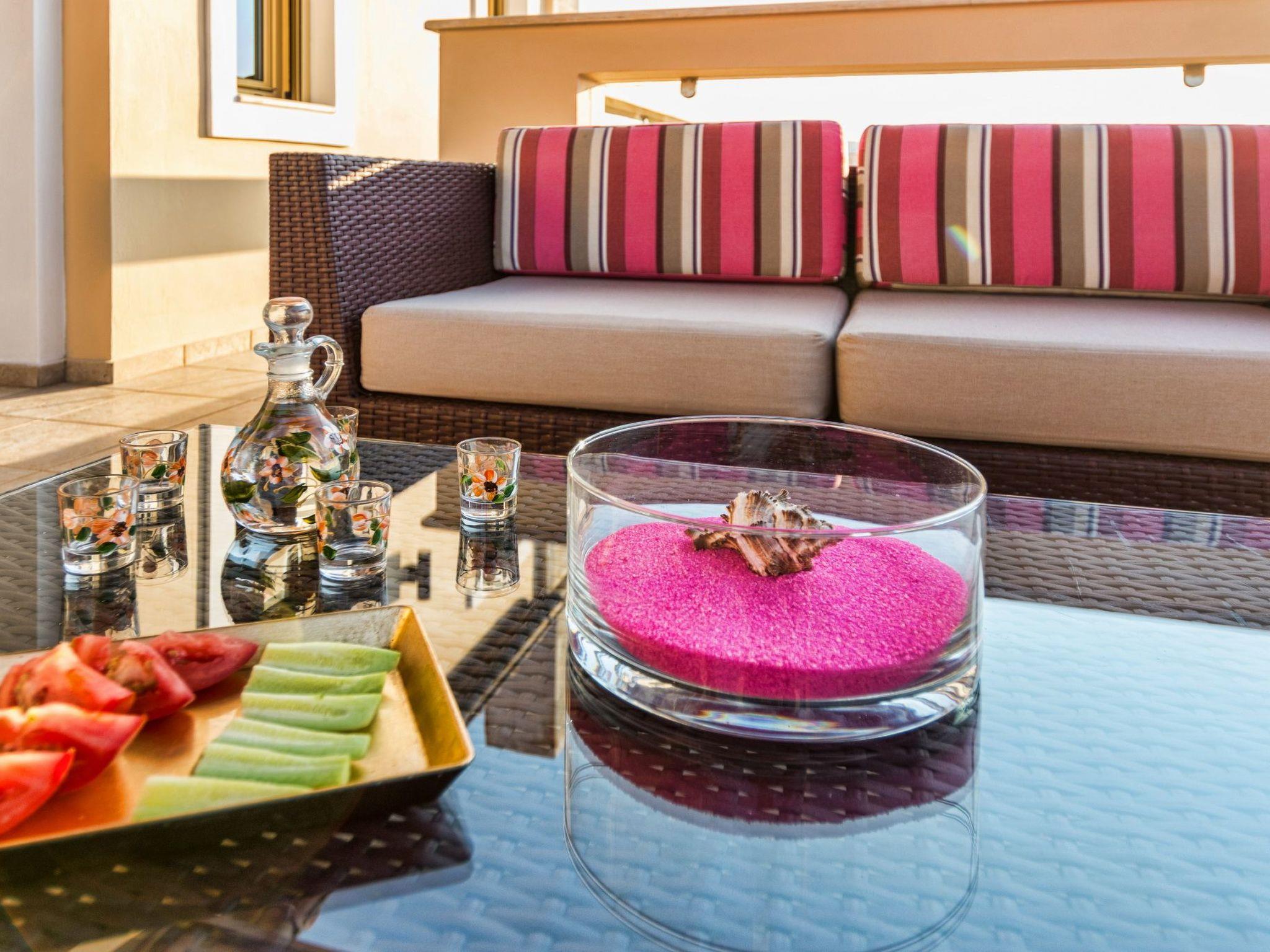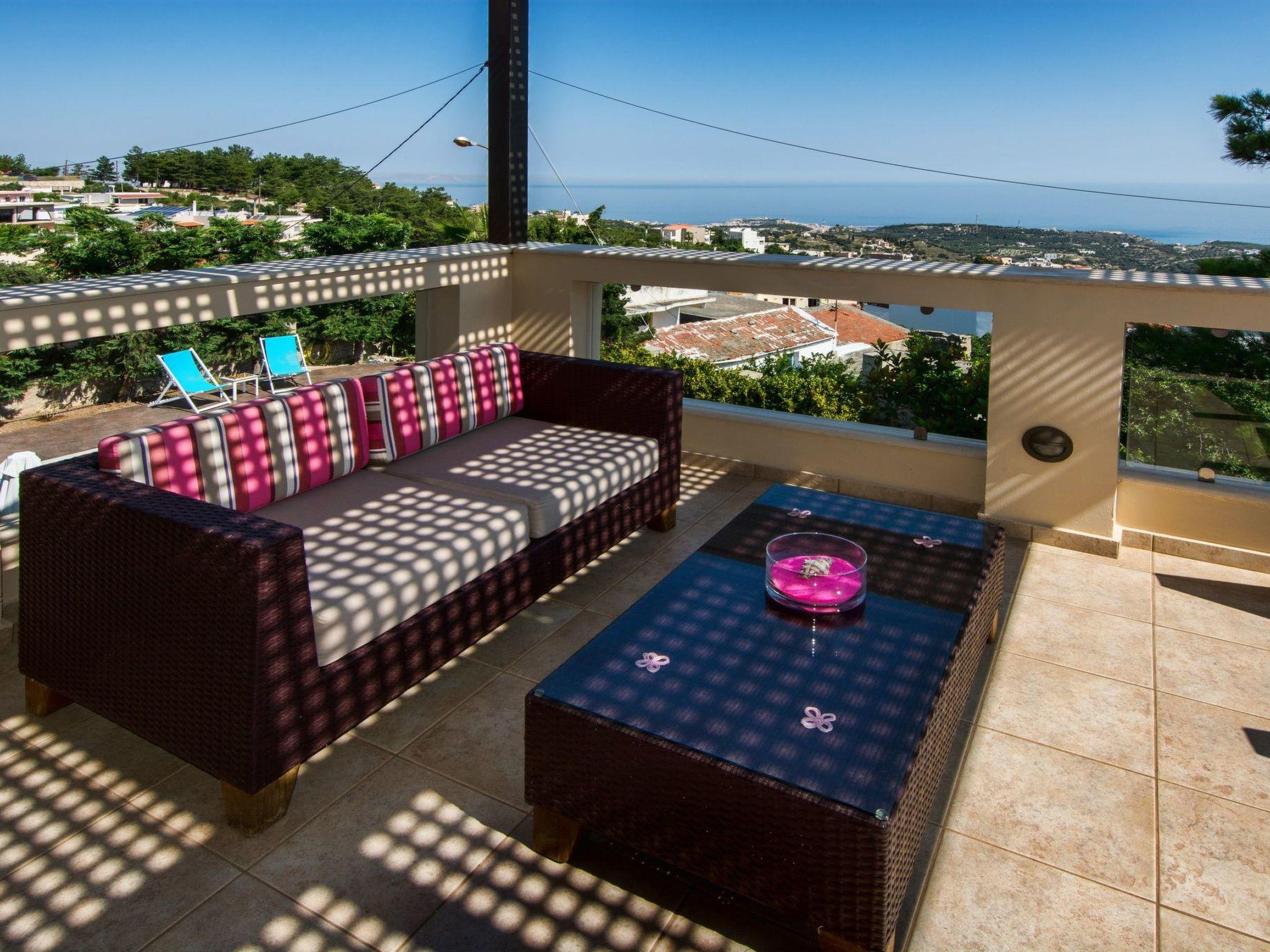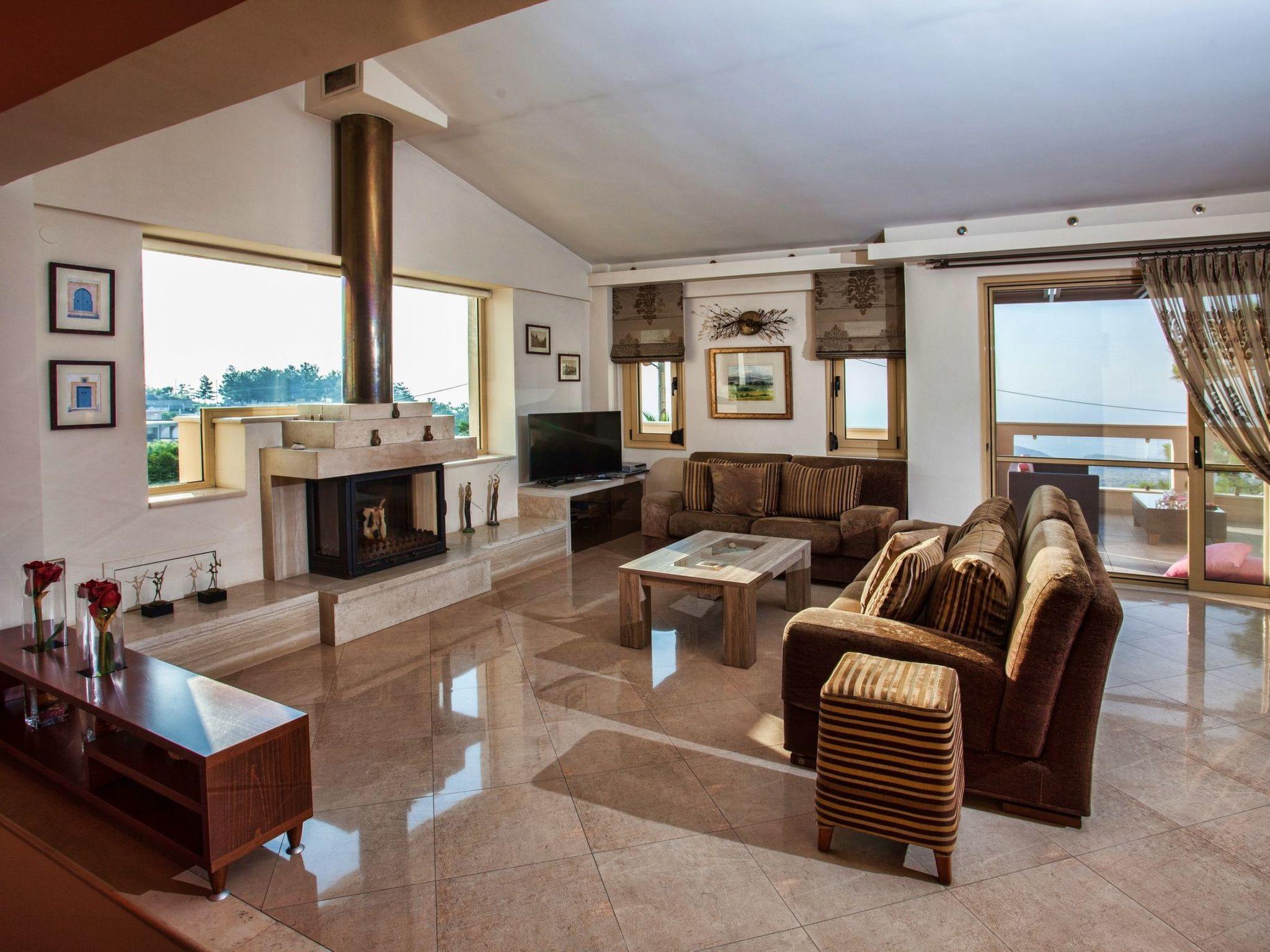 Die große Terrasse und die Balkone bieten einen schönen Blick auf die Umgebung und das ferne Meer. Voll klimatisiert. Hohe Qualität der Konstruktion. Die Villa ist 300qm groß, ist eine sehr elegante und geräumige Villa, mit 5 Schlafzimmern; 1 davon mit Doppelbetten und luxuriösen en-suite Badezimmern/WC, 2 Schlafzimmer mit Einzelbetten teilen sich ein luxuriöses Badezimmer/WC und 1 mit Zwillingsbetten, Sofabett, Babybett und luxuriösen en-suite Badezimmern/WC, alle im Erdgeschoss, im zweiten Stock ist ein offenes Schlafzimmer mit einem doppelten Eisenbett und einem doppelten Sofabett, es ist geeignet für bis zu 10-14 Personen. Eine offene Marmortreppe (acht Stufen) führt ins Obergeschoss, wo sich eine sehr gut ausgestattete Küche mit Elektroherd, Backofen, Mikrowelle, Geschirrspüler, Kühl-/Gefrierschrank, Kaffeemaschine, Toaster, Saftpresse und Wasserkocher befindet. Auf der gleichen Ebene wie die Küche befindet sich das Esszimmer mit einem großen Esstisch für 12 Personen. Vom Esszimmer aus führt eine Tür auf die Terrasse, wo ein weiterer großer Tisch und ein großer Sonnenschirm stehen, um im Freien zu frühstücken, zu starten oder zu essen. Über acht Stufen gelangt man in die Küche mit bequemen Sitzgelegenheiten, einem gläsernen Kamin, Satelliten-TV und DVD-Player. Außerdem gibt es auf dieser Etage ein WC und eine Tür, die auf den überdachten Balkon mit Terrassenmöbeln führt, von dem aus man einen fantastischen Blick auf die Umgebung und das ferne Meer hat. Auf der gleichen Ebene mit der Sitzecke gibt es eine Ecke mit einem Schreibtisch, Bibliothek, WiFi VDSL ist innerhalb und außerhalb der Villa zur Verfügung. Im Hauptschlafzimmer befindet sich ein Schließfach. Klimaanlage ist in allen Schlafzimmern vorhanden. Neben der Garage gibt es einen Hauswirtschaftsraum mit einer Waschmaschine und Bügelbrett. Die Villa ist gut ausgestattet und möbliert, mit Zentralheizung für kühlere Perioden des Jahres.