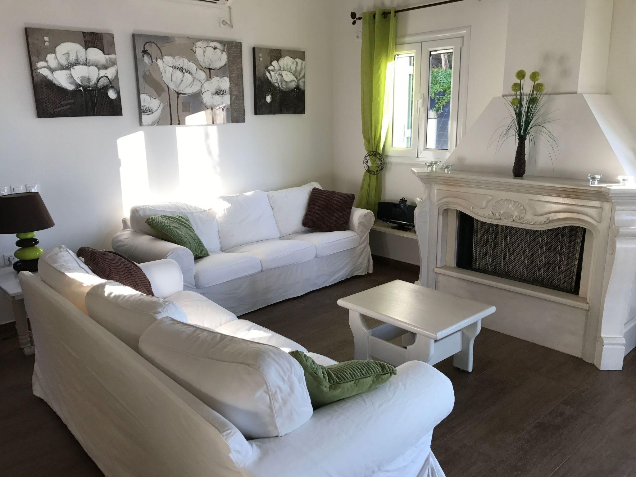 Ein Wohn-/Esszimmer (TV, Esstisch für 6 Personen, Sofa für 6 Personen, Klimaanlage, angrenzende Terrasse)