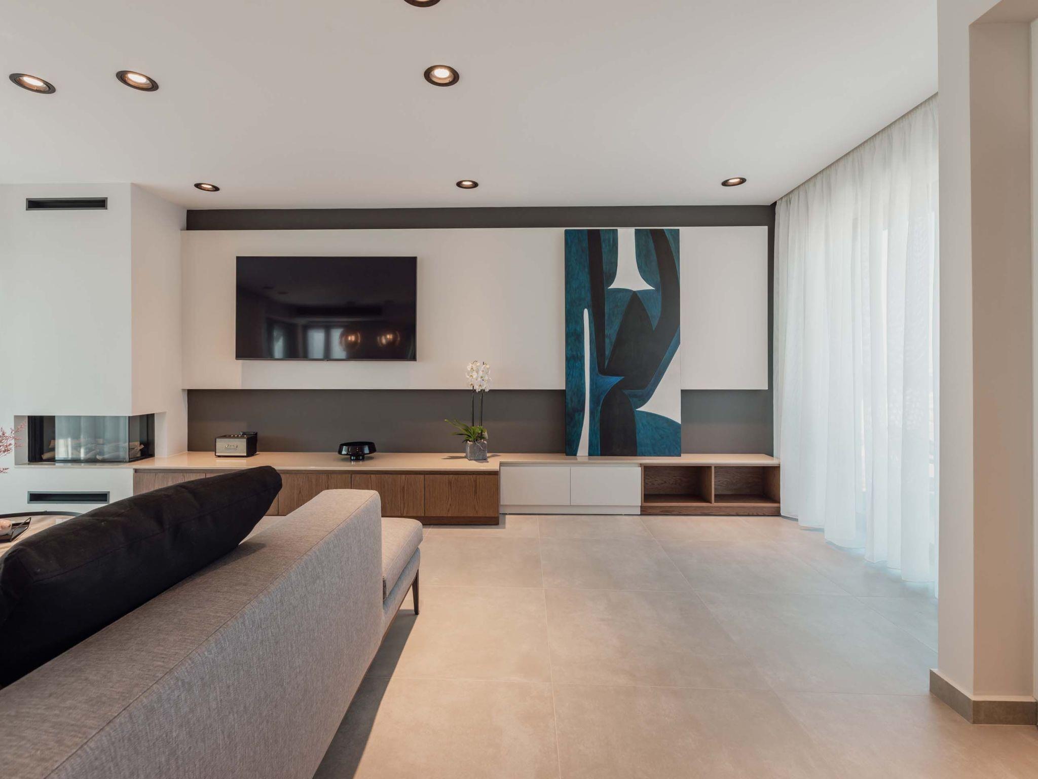 Wohnzimmer mit Sofa, 65'' Smart-Satelliten-TV, Bluetooth-Lautsprecher Marschall, Kamin mit Gas, Zugang zur Poolterrasse, Meer- und Stadtblick durch große Fenster