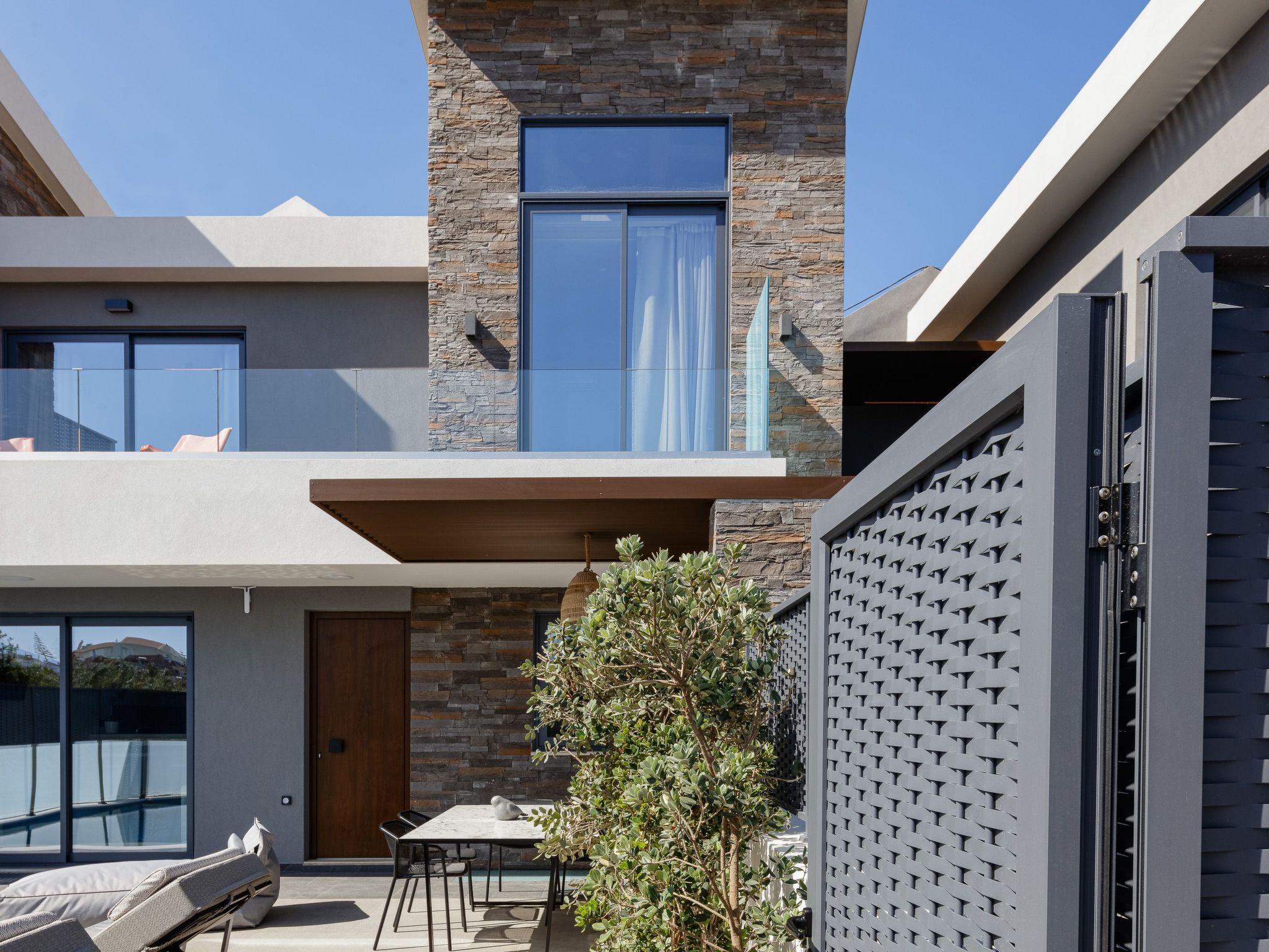 Die 75 m² große VillAgioi Villa II erstreckt sich über zwei Ebenen und bietet bequem Platz für bis zu 5 Gäste. Im Erdgeschoss befindet sich ein heller, offener Wohnbereich mit modernem, minimalistischem Dekor, einer gemütlichen Sitzecke, Smart-TV und breiten Schiebetüren, die nahtlos in den privaten Poolbereich übergehen. Die voll ausgestattete Küche verfügt über Edelstahlgeräte und eine praktische Frühstücksbar für zwanglose Mahlzeiten.