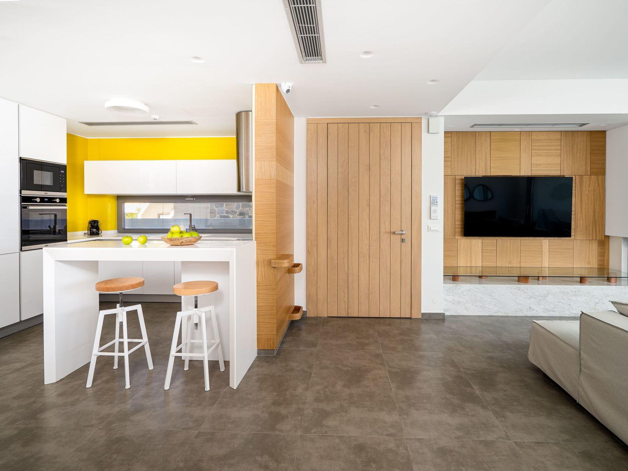 Das helle Wohnzimmer ist zusammen mit der Küche und dem Essbereich offen gestaltet und verfügt über einen 65 Zoll Smart-TV, ein breites Sofa und einen Kamin. Es ist durch einen Aufzug mit den höheren Etagen verbunden und hat einen direkten Zugang zum Pool. Die Küche ist mit allem ausgestattet, was Sie brauchen, um Ihre eigenen Mahlzeiten und Snacks zuzubereiten, wie z.B. Backofen und Herdplatte, Kühlschrank in Originalgröße, Geschirrspüler, Kochbasis und vieles mehr. Der große Esstisch bietet Platz für 10 Personen. Auf der gleichen Etage finden Sie auch ein Doppelzimmer mit eigenem Smart-TV von 43 Zoll, ein Schließfach und ein Duschbad mit allen Annehmlichkeiten für einen komfortablen Aufenthalt.