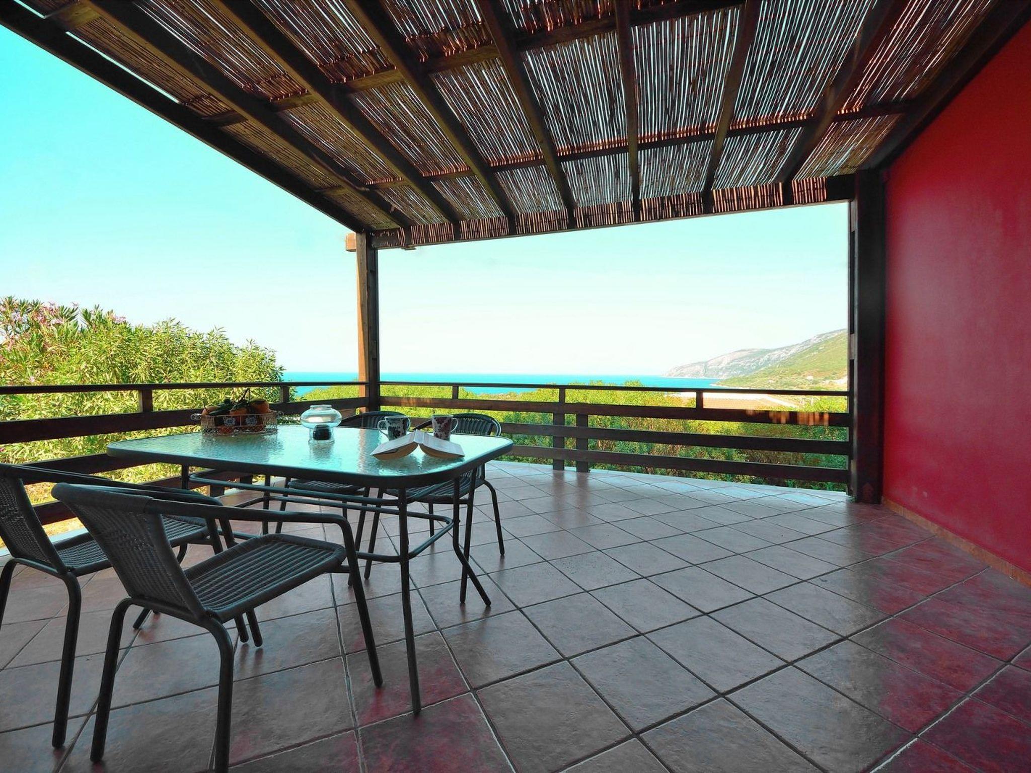 Die Rote Villa, umgeben von Bäumen und Blumen, hat eine Fläche von 90 Quadratmetern, bietet eine offene, voll ausgestattete Küche, Ess- und Sitzecke mit herrlichem Blick auf das Meer und ist mit zwei Schlafzimmern und einem Badezimmer ausgestattet. Das erste Schlafzimmer verfügt über ein Doppelbett, einen großen Kleiderschrank und ein Boudoir und bietet einen perfekten Blick auf den Garten und das Meer, auch wenn Sie auf dem Bett liegen.