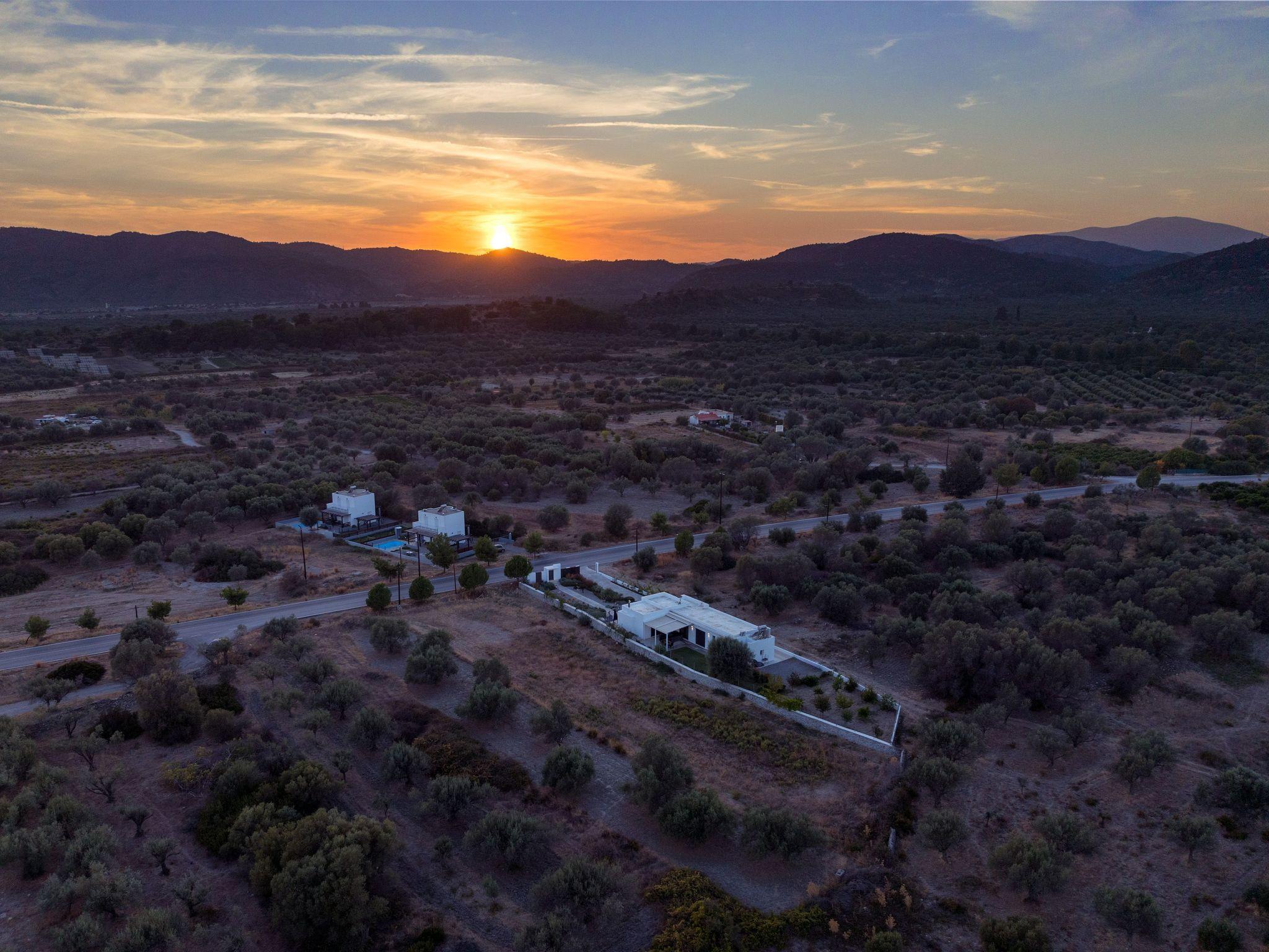 Unsere große, moderne Küche mit Essbereich ist der perfekte Ort, um den Tag bei einer gekochten Mahlzeit und einem Glas Wein Revue passieren zu lassen. Die Küche ist komplett ausgestattet mit allen Annehmlichkeiten, Geschirrspüler und Nespresso-Kaffeemaschine. Luxus und Komfort im Überfluss. Die hintere Veranda ist mit bequemen Loungesesseln und einem Tisch ausgestattet, ideal für Mahlzeiten im Freien und zur Unterhaltung. Die Veranda ist ein ruhiger Bereich, da sie an den Rasen und die Gärten mit benachbarten Olivenbäumen angrenzt. Am Abend können Sie den Blick auf die beleuchtete Burg Feraklos in der Ferne genießen.