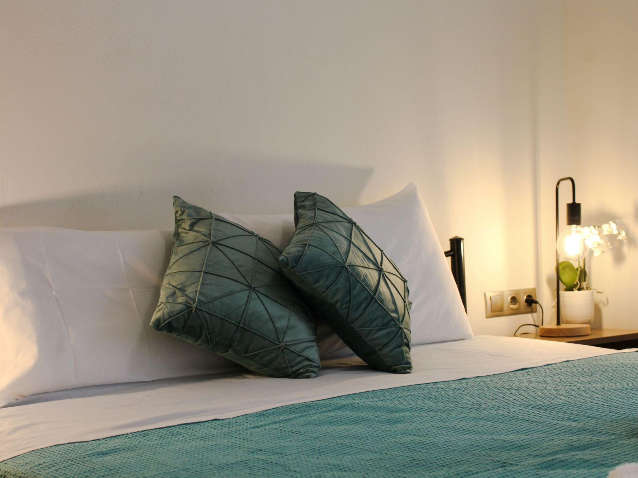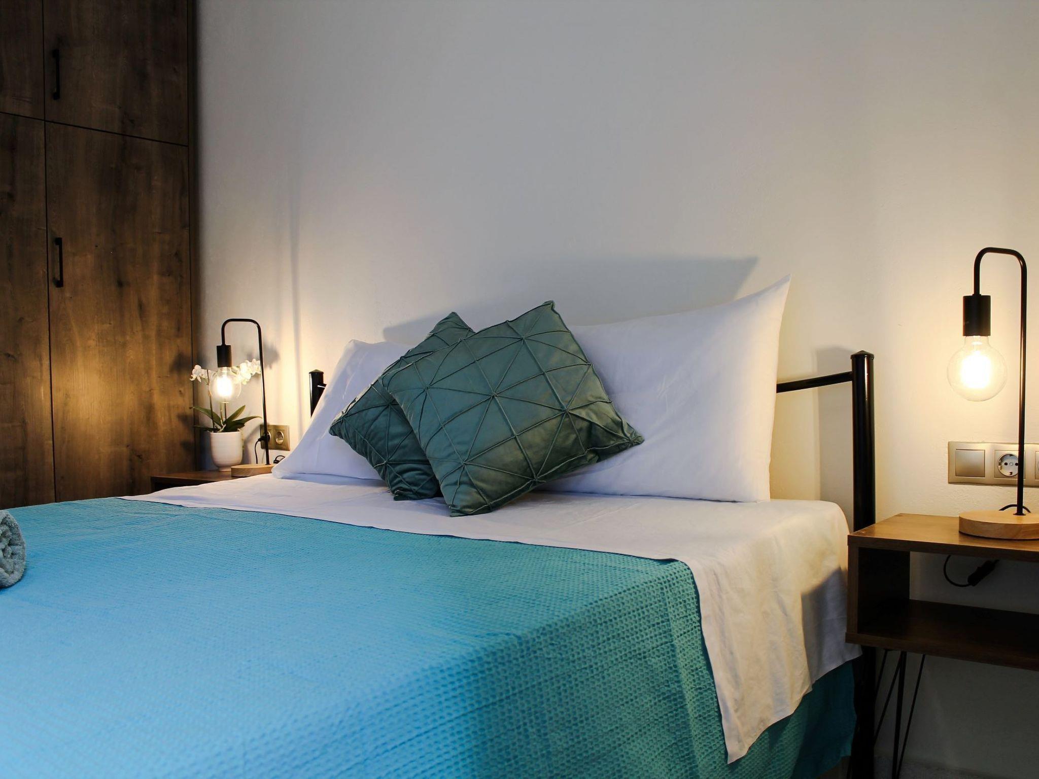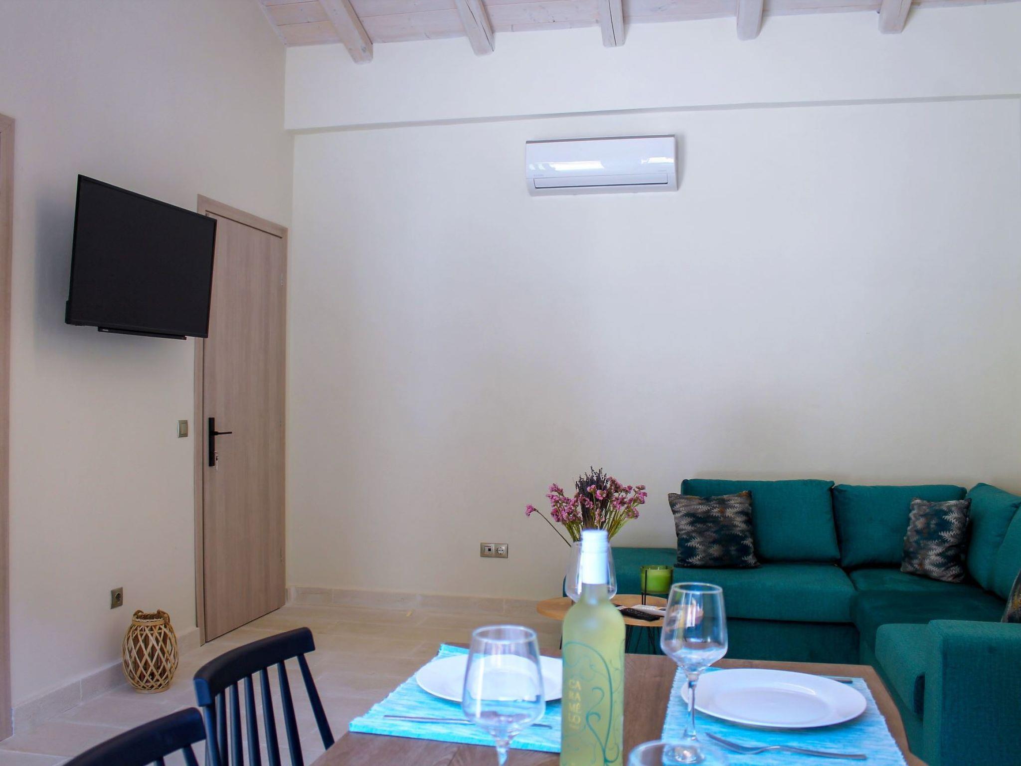 Die Außentreppe vom Privatparkplatz führt zu einem schönen und großzügigen Garten mit Olivenbäumen und Grünflächen, in dem ein schöner Pavillon mit einem Tisch steht, an dem die Familie zusammenkommen und essen kann, und der so gelegen ist, dass immer eine angenehme Brise weht. Direkt daneben befindet sich der Swimmingpool des Hauses mit Sonnenliegen und einer Holzterrasse, der sich direkt neben dem Steinhaus am zentralen Eingang befindet. Die zentrale Tür führt in ein großes Wohnzimmer mit einem Sofa und einem Smart-TV, sowie einem Esstisch und einer voll ausgestatteten Küche.In der Villa gibt es zwei weitere Schlafzimmer, jedes mit einem Doppelbett und Klimaanlage. Die erste Balkontür führt zum zentralen Innenhof, während die zweite zu einem Juliet-Balkon führt. Das Familienbad mit Dusche befindet sich direkt neben dem Wohnzimmer.