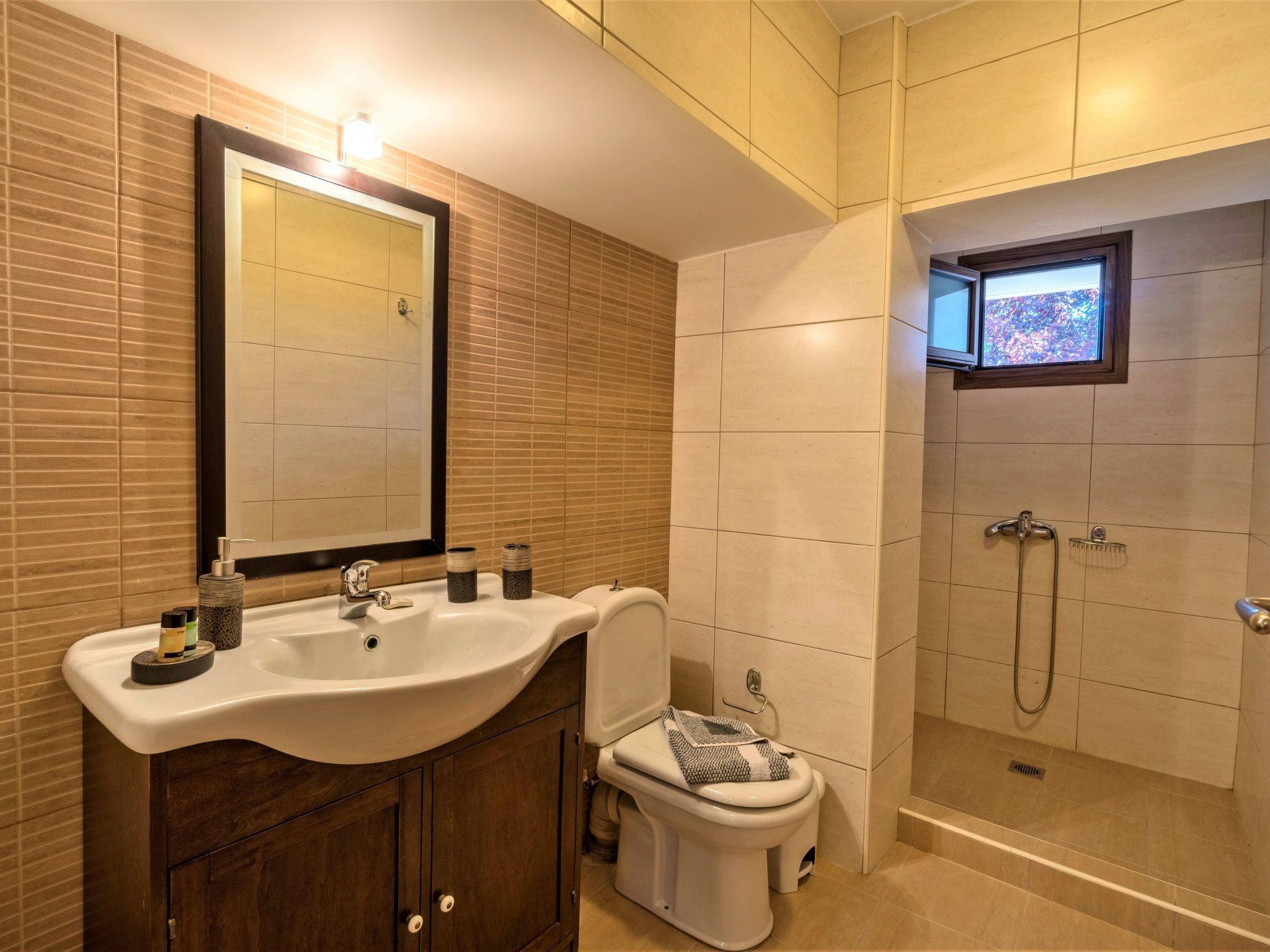 Im Obergeschoss befinden sich zwei Häuser: "Erytheia", eine Einzimmerwohnung mit einem Doppelbett und einem Badezimmer mit Regendusche, Toilette, Waschbecken und Haartrockner. Und "Aegli" mit 2 Doppelzimmern und einem Badezimmer mit Regendusche, Toilette, Handwaschbecken und Haartrockner.