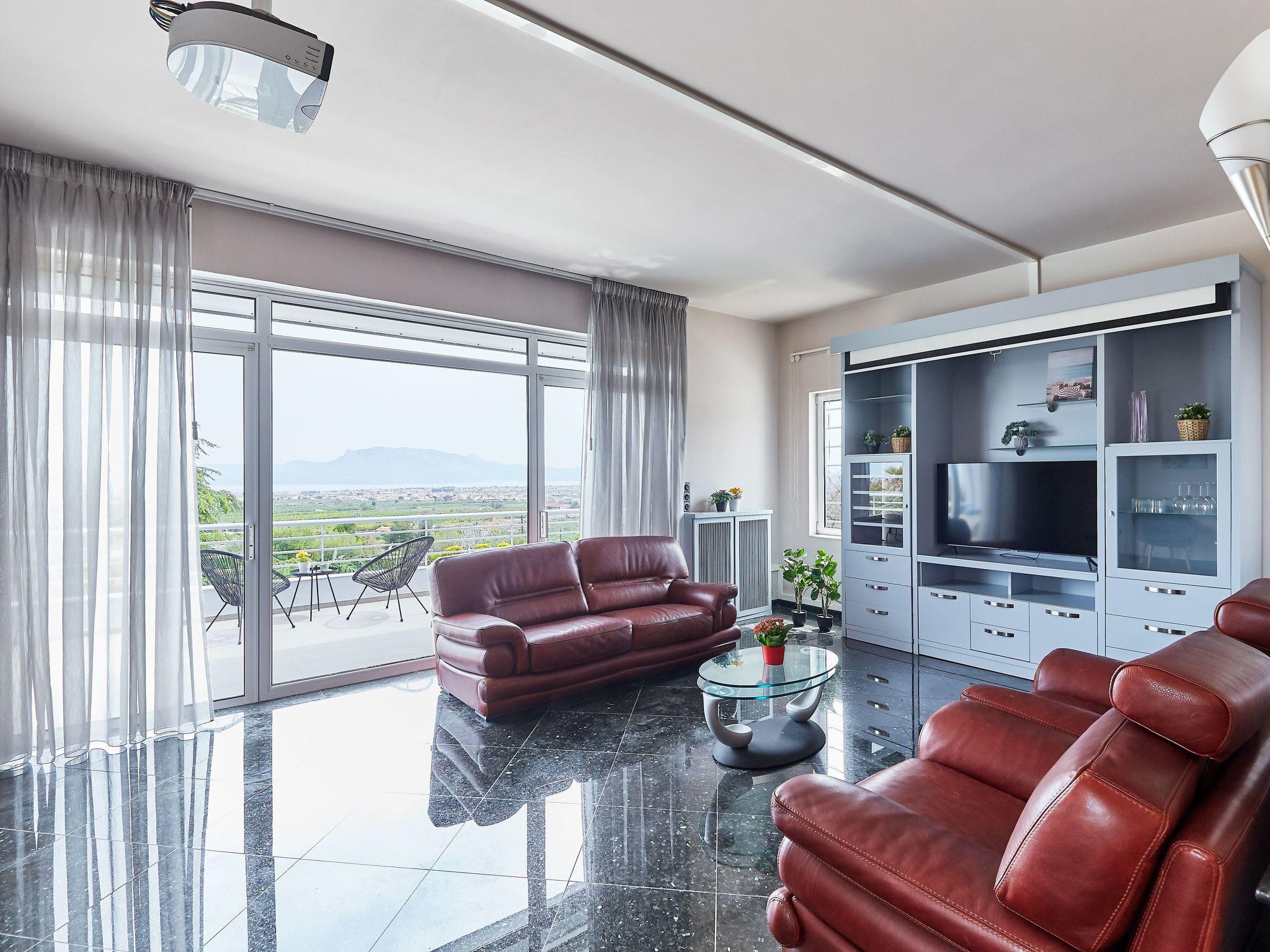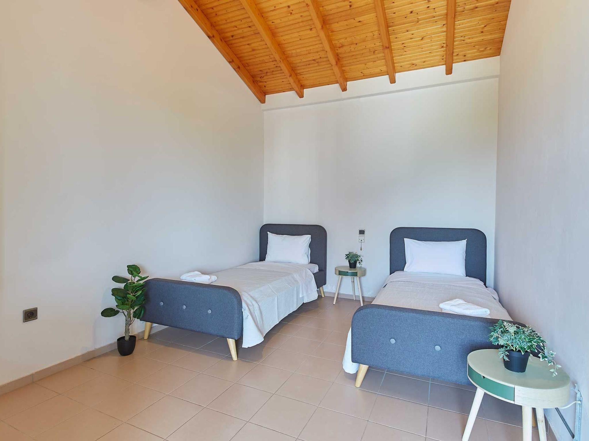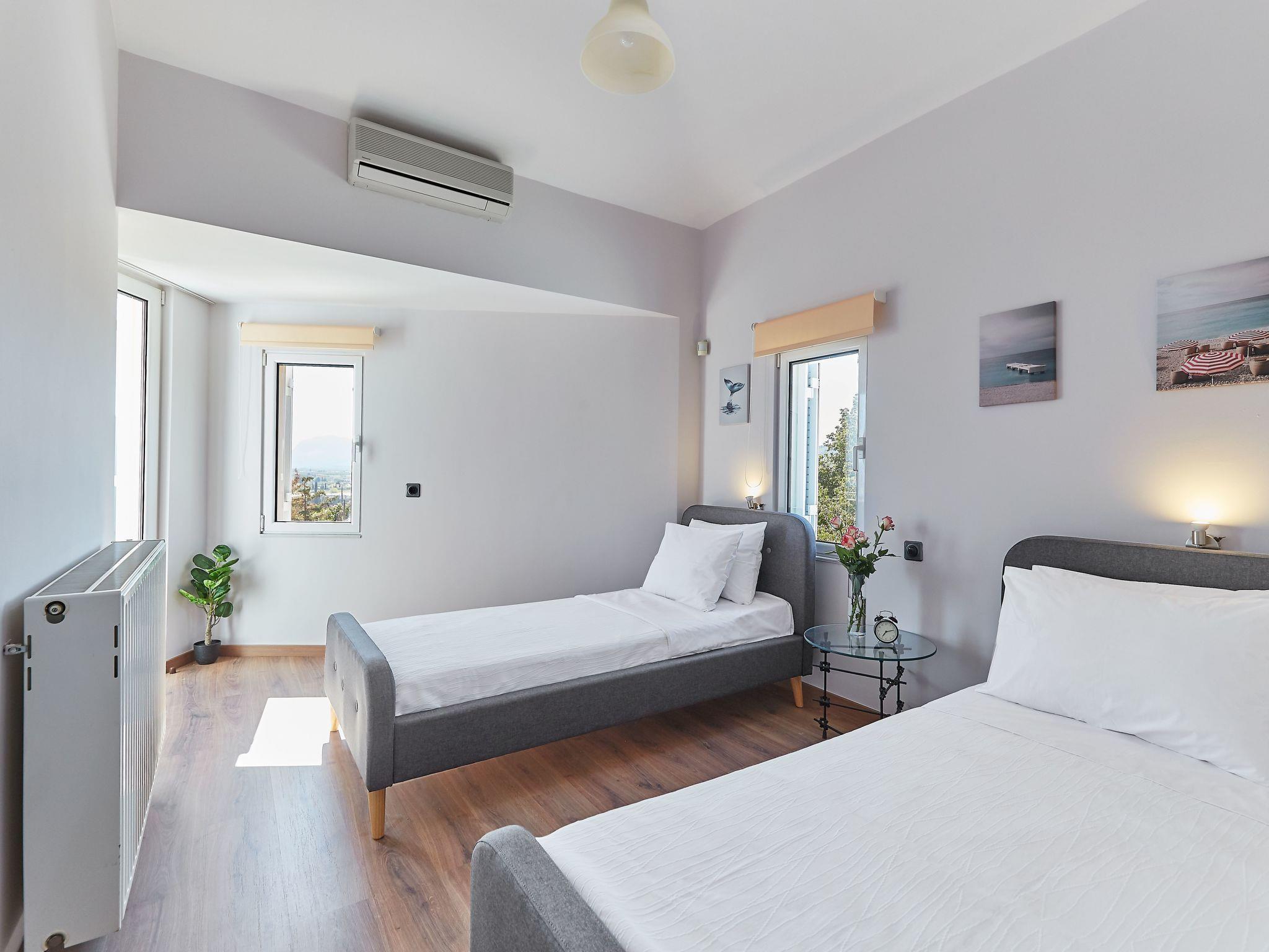 Villa Dennis ist auf 450 Quadratmetern Fläche auf 3 verschiedenen Ebenen gebaut, plus einem Dachboden. Auf der ersten Ebene befinden sich eine Küche, ein Wohnzimmer, ein Esszimmer, ein Kamin und ein Innengrill. Der große klösterliche Speisesaal, der sich im Inneren befindet, ist ideal, um große Gruppen von Menschen unterzubringen, und wenn man die extra breiten Balkontüren öffnet, entsteht ein einziger Raum mit dem Poolbereich.Im ersten Stock gibt es ein großes Wohnzimmer mit großem Flachbildfernseher und einem Projektor, mit einer offenen Küche und einer zweiten Bar. Auf der gleichen Etage befindet sich ein Arbeitszimmer mit einem Schlafsofa, das über einen eigenen Balkon mit Blick auf den Garten verfügt. Im zweiten Stock gibt es drei Schlafzimmer, jedes mit einem eigenen Bad. Das Hauptschlafzimmer und ein zweites Zimmer auf dieser Etage verfügen über einen privaten Whirlpool. Alle Zimmer haben einen spektakulären Blick auf den Korinthischen Golf und teilen sich eine Terrasse mit Blick auf das gesamte Gebiet. Ein kleines Wohnzimmer auf dieser Etage bietet weitere Entspannungsmöglichkeiten. Oben befindet sich das Dachgeschoss, ein einzigartiges Erlebnis für Kinder, Jugendliche oder jemanden, der sich wie ein Kind fühlt. Auf dem Dachboden können 2 bis 4 Personen auf bequemen und luxuriösen Matratzen übernachten. 30 Meter vom Hauptgebäude entfernt befinden sich zwei weitere Gästehäuser. Jedes Gästehaus kann 4 Personen beherbergen, hat zwei separate Schlafzimmer und ein Badezimmer. Ein Gästehaus ist behindertengerecht eingerichtet und verfügt über ein behindertengerechtes Bad.